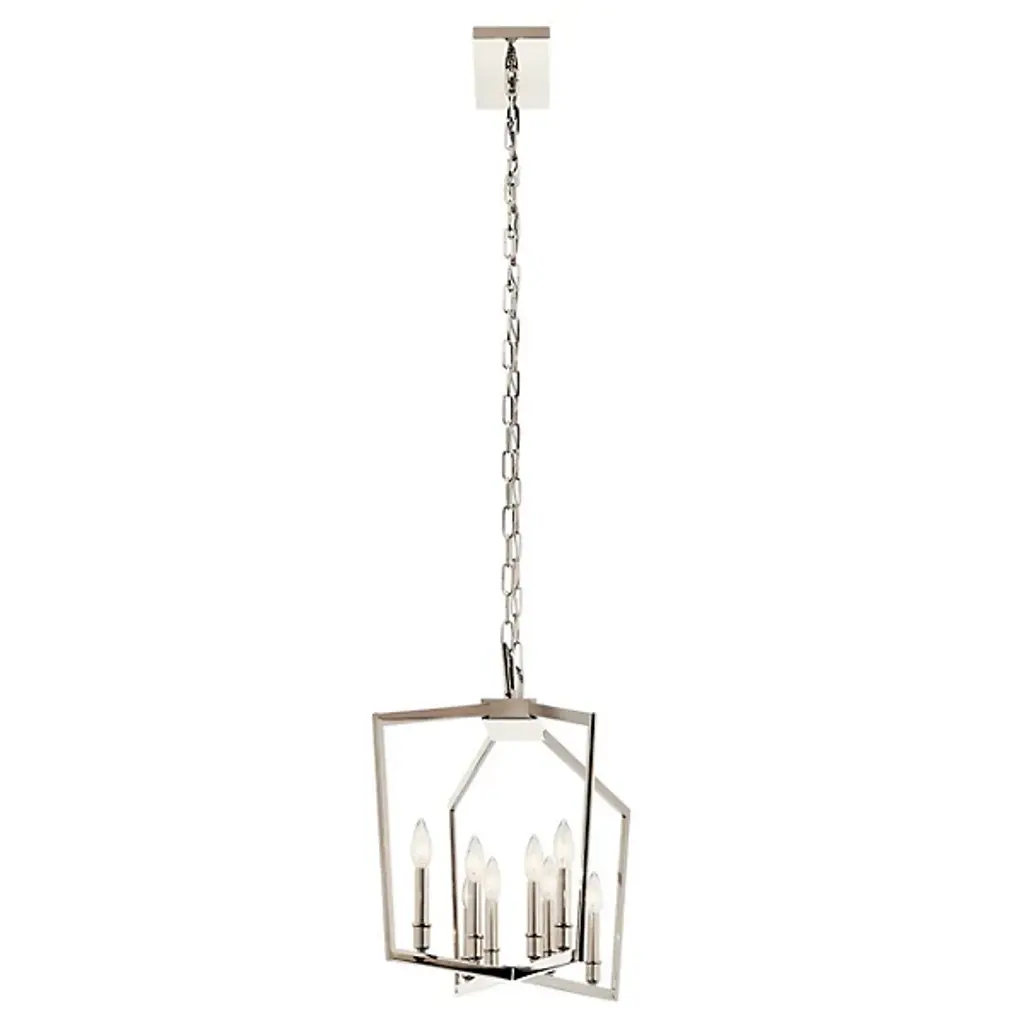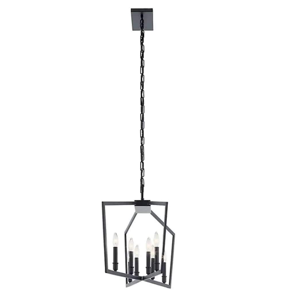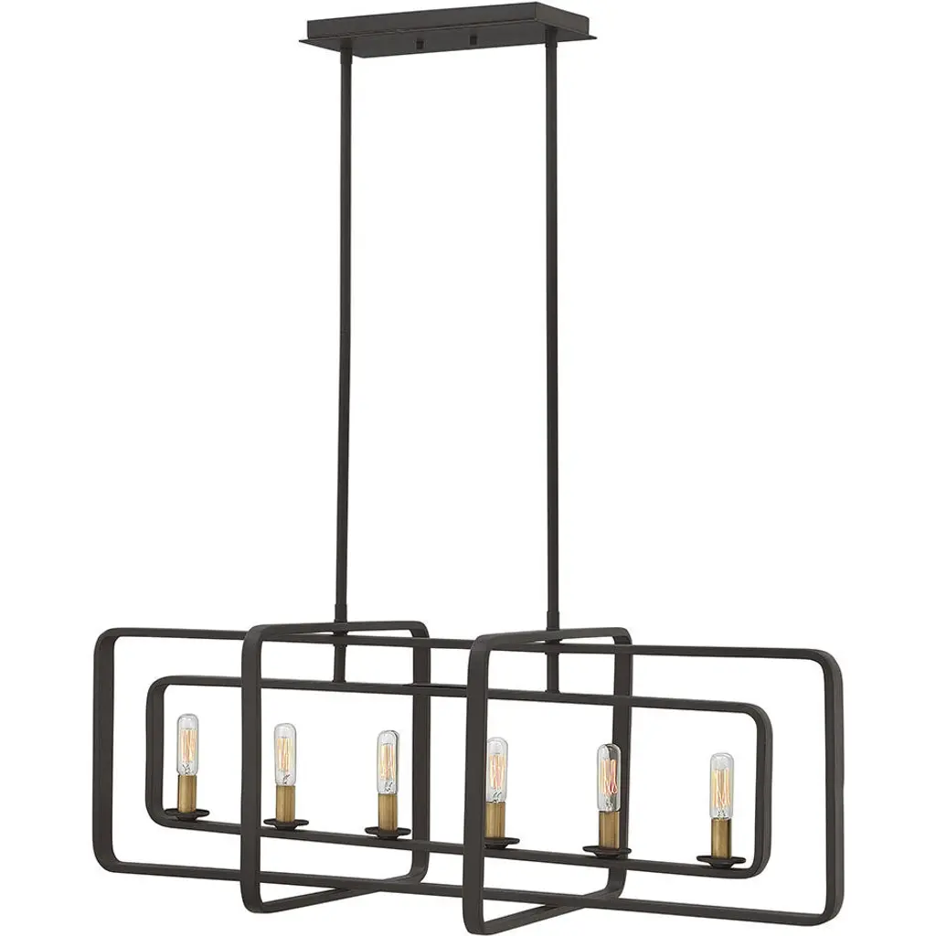 A fresh, contemporary twist on a classic style. The Abbotswell Linear Suspension by Kichler features two intersecting pentagons made of steel to create a geometric open cage. Changing in shape and size depending on how you view it, classic incandescent bulbs on candelabras are perched atop the bottom of the cage to emit a warm and uniformly balanced glow. This fixture is mounted to the ceiling by a rectangular canopy and chain-hung, ideal for application above dining tables and kitchen islands