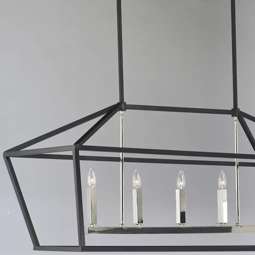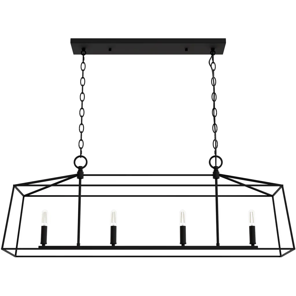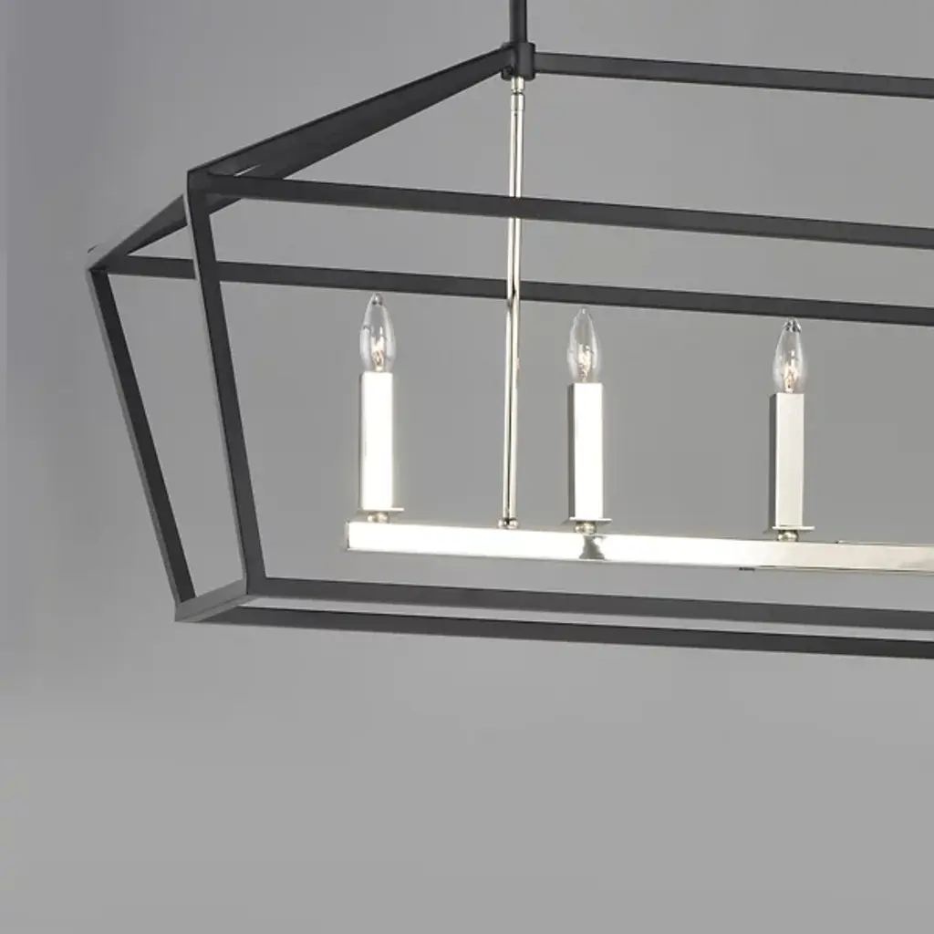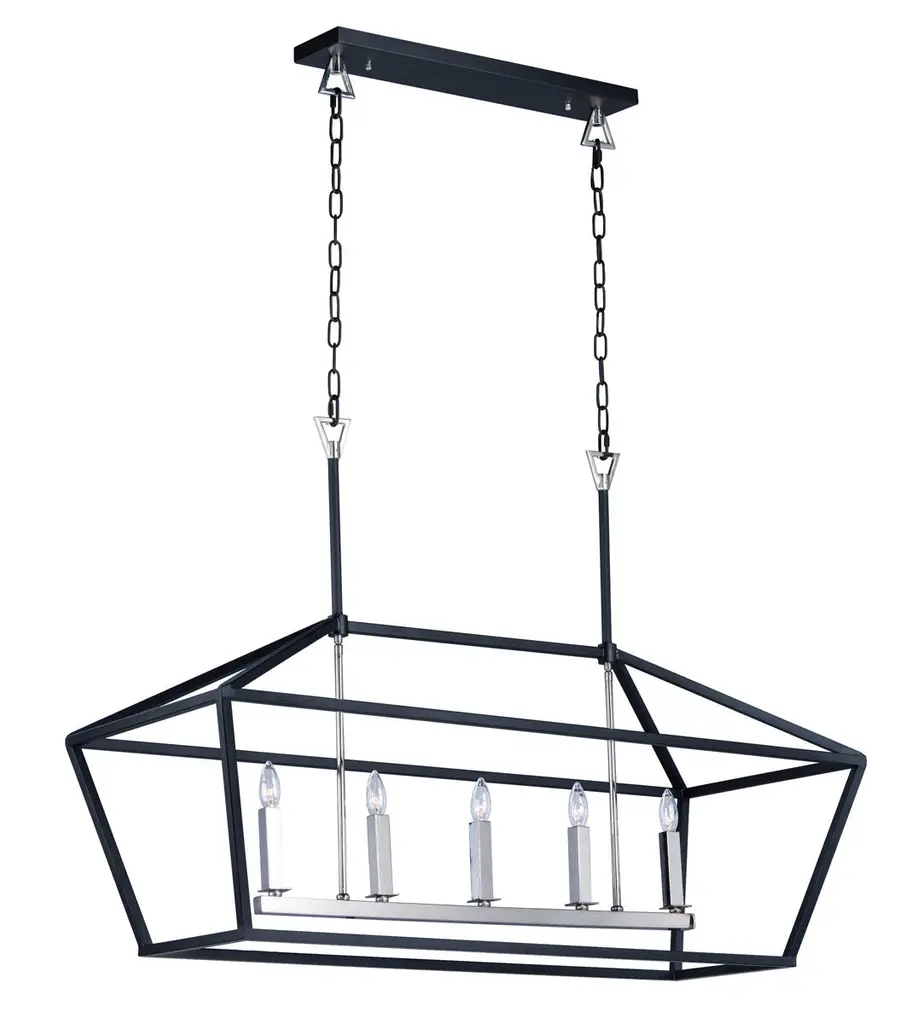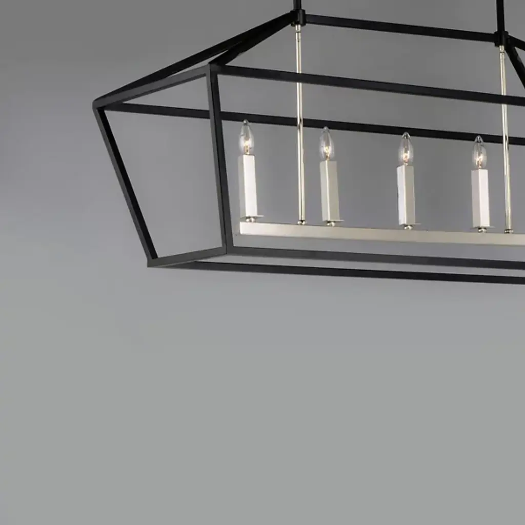 A dramatic effect. The Abode Linear Suspension by Maxim Lighting is simple yet striking. Its caged shade frames a streamlined candelabra for clean lines and an open, airy look. Suiting contemporary or transitional dining rooms and kitchens, it's a dimmable ceiling fixture allowing easy control of illumination according to the task or mood. This decorative lighting is perfect over a table, island or bar thanks to its rectangular canopy and suspension hardware with stylish geo accents.