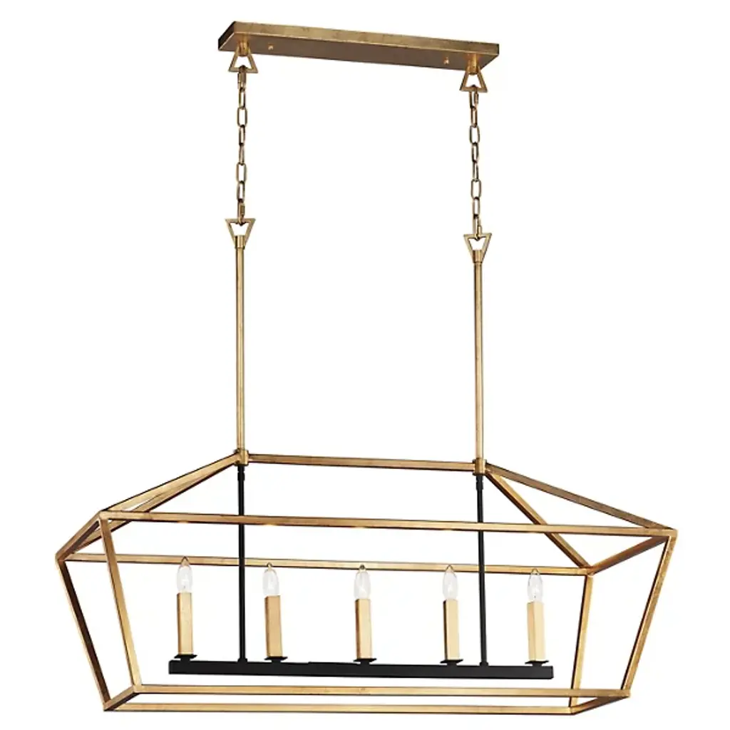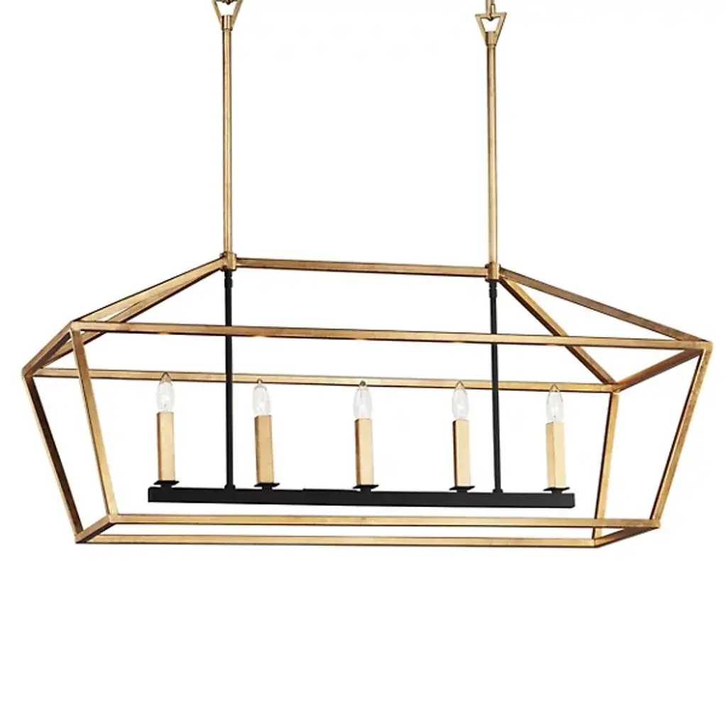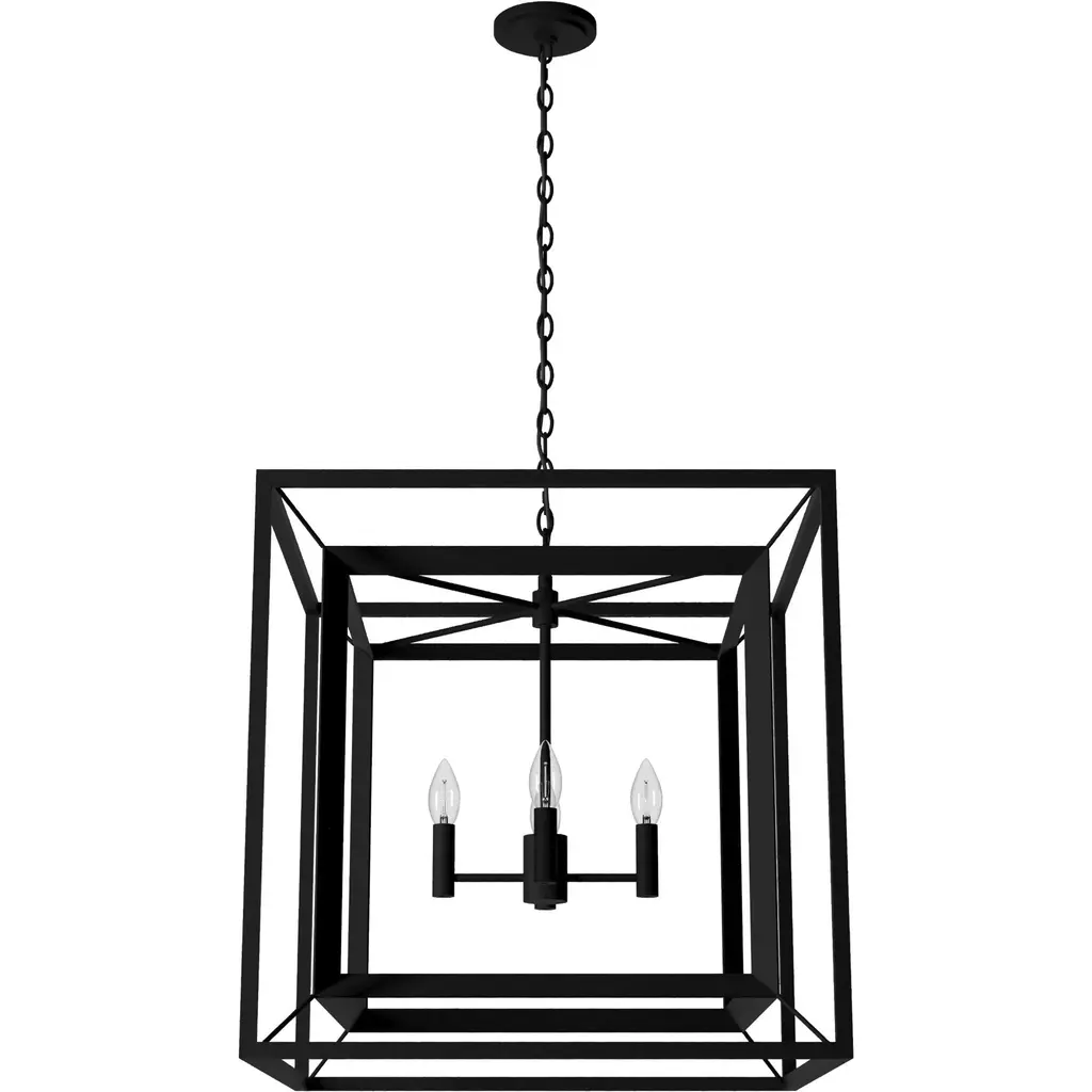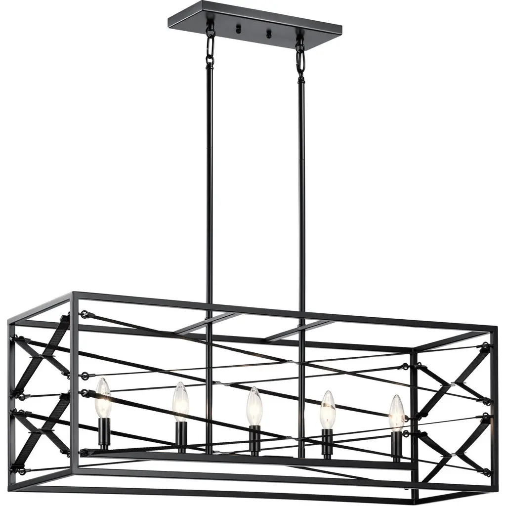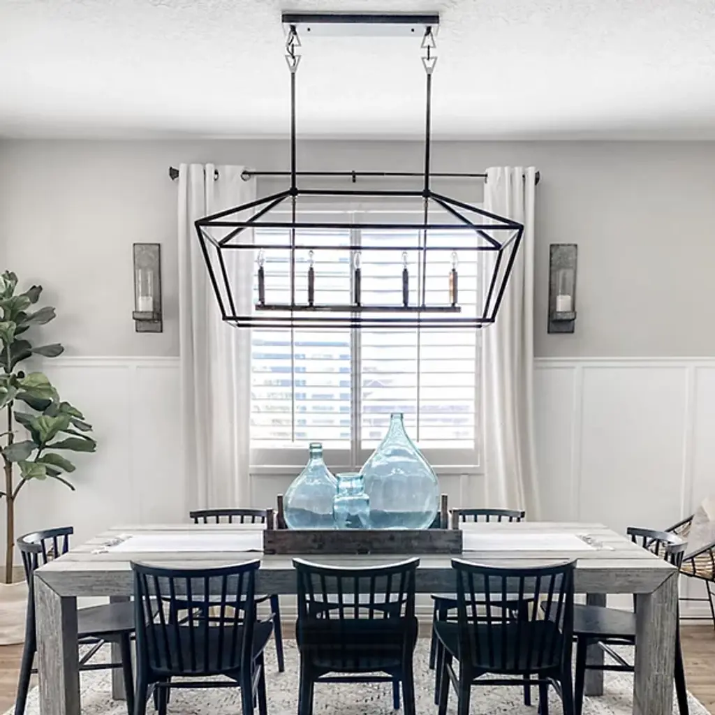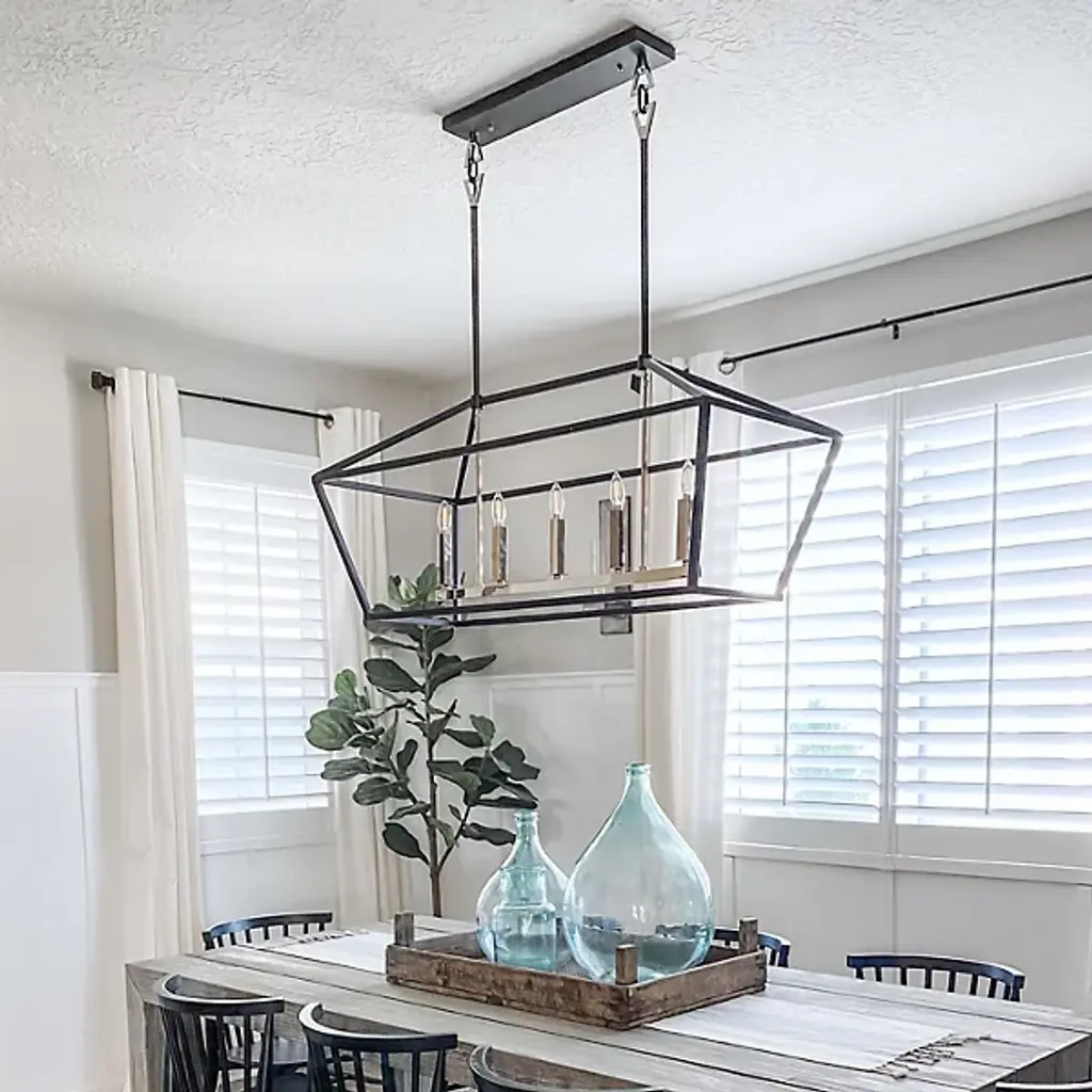 A dramatic effect. The Abode Linear Suspension by Maxim Lighting is simple yet striking. Its caged shade frames a streamlined candelabra for clean lines and an open, airy look. Suiting contemporary or transitional dining rooms and kitchens, it's a dimmable ceiling fixture allowing easy control of illumination according to the task or mood. This decorative lighting is perfect over a table, island or bar thanks to its rectangular canopy and suspension hardware with stylish geo accents.