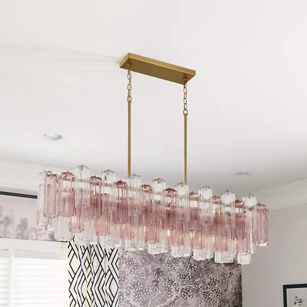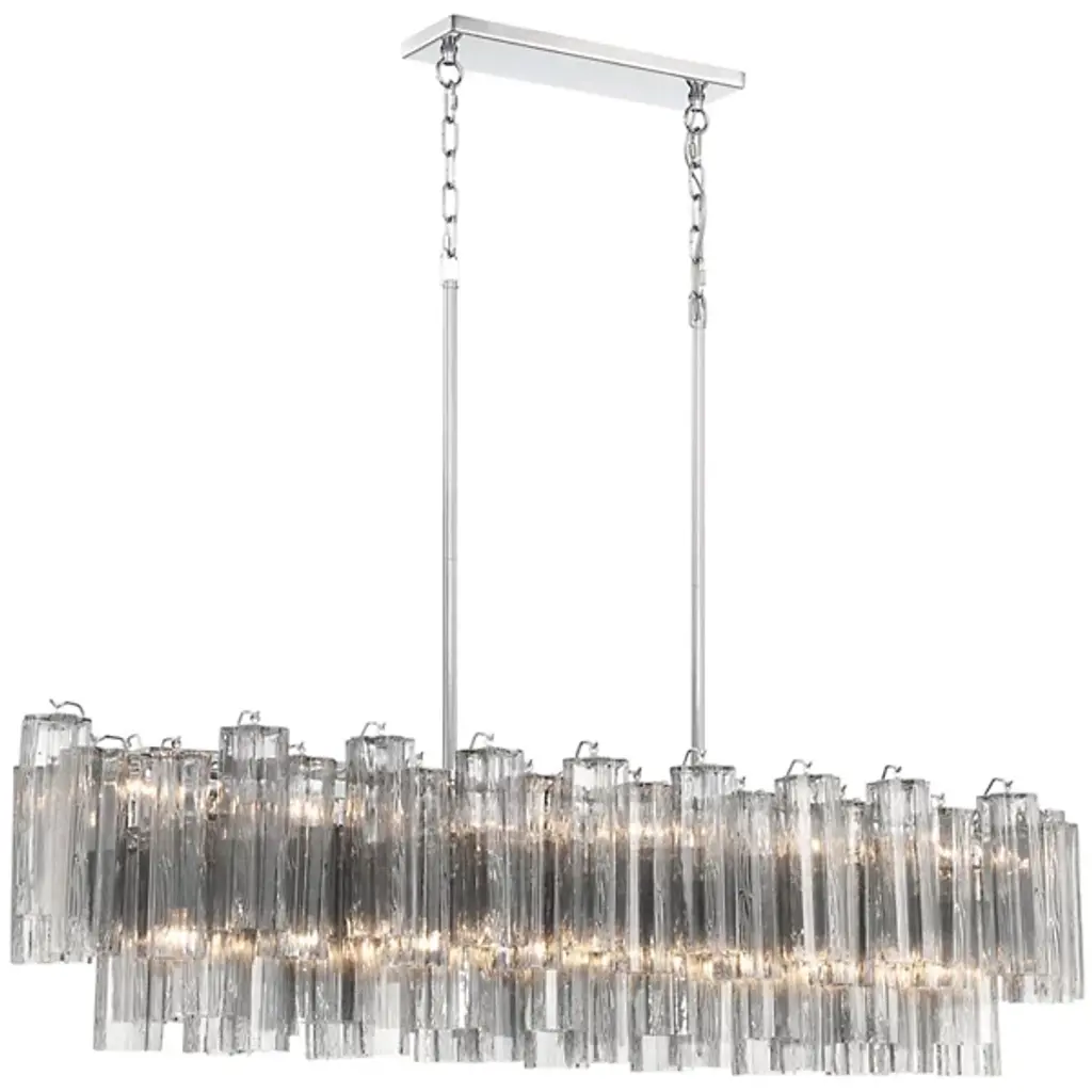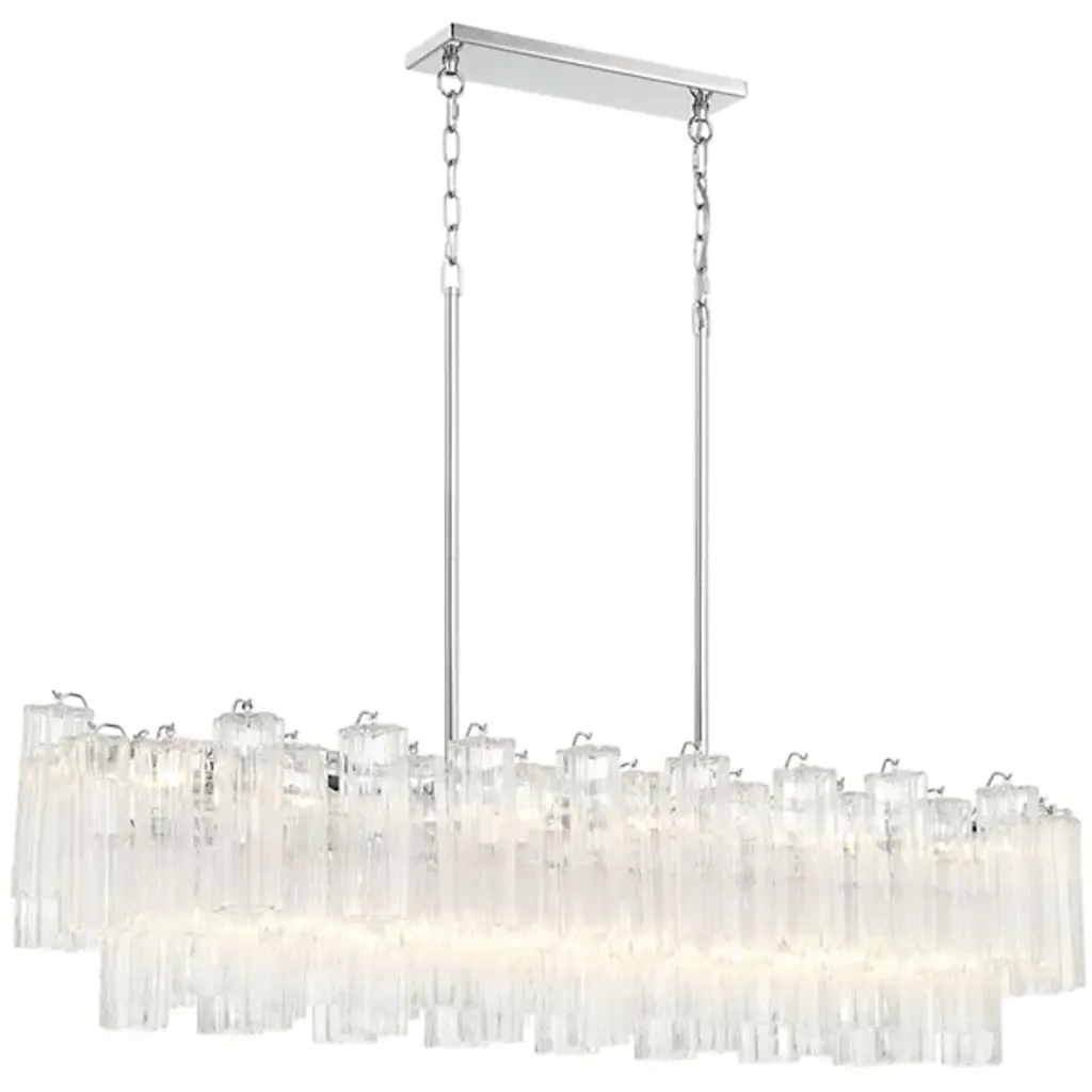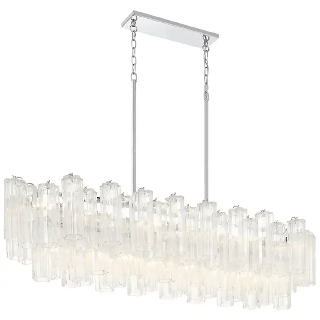 The Addis Linear Suspension from Crystorama marries luxury and refinement. Crafted carefully from durable steel, this linear suspension fixture boasts a mesmerizing design that enhances your space. The shades are made of textured Tronchi glass tubes, reminiscent of the iconic mid-century Tronchi chandelier, adding vintage elegance. Addis allows you to adjust the brightness level with dimmable functionality when paired with a separately sold ELV dimmer. Your linear suspension is secured by downrods and linked chains attached to a ceiling canopy.