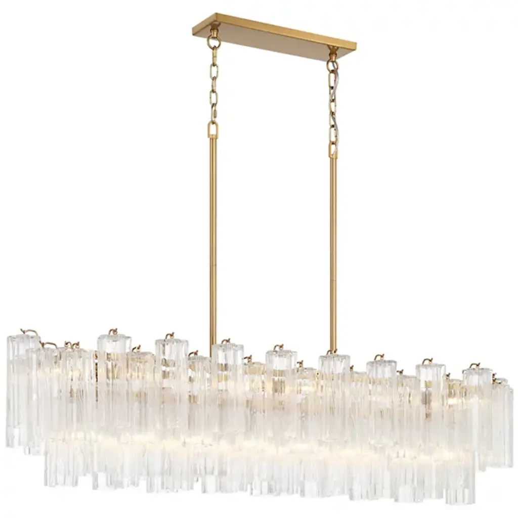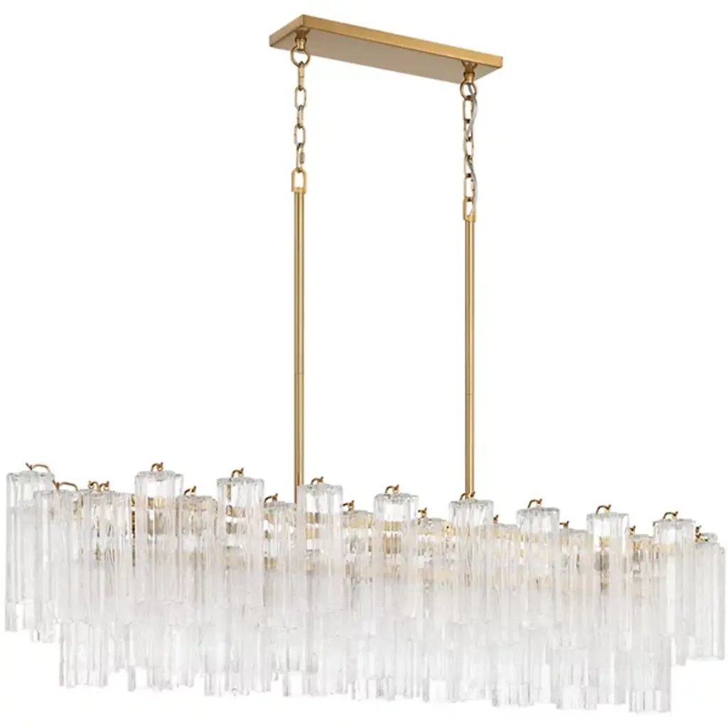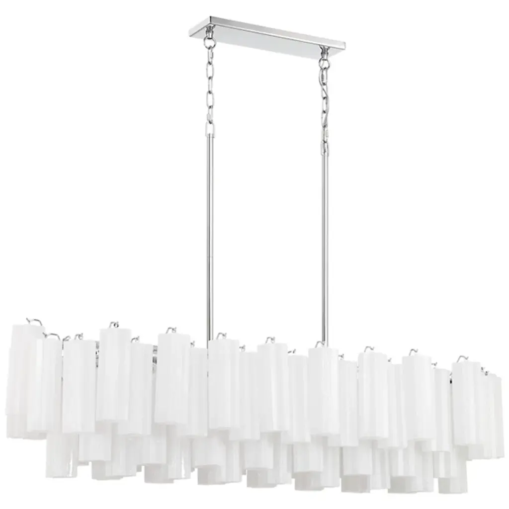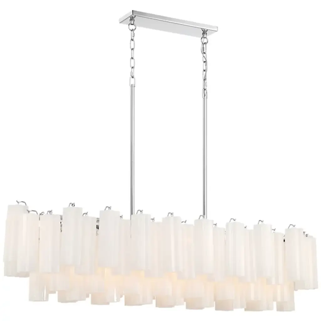 The Addis Linear Suspension from Crystorama marries luxury and refinement. Crafted carefully from durable steel, this linear suspension fixture boasts a mesmerizing design that enhances your space. The shades are made of textured Tronchi glass tubes, reminiscent of the iconic mid-century Tronchi chandelier, adding vintage elegance. Addis allows you to adjust the brightness level with dimmable functionality when paired with a separately sold ELV dimmer. Your linear suspension is secured by downrods and linked chains attached to a ceiling canopy.