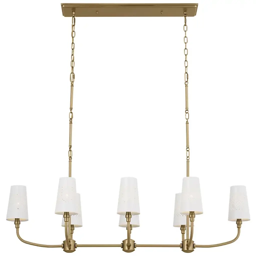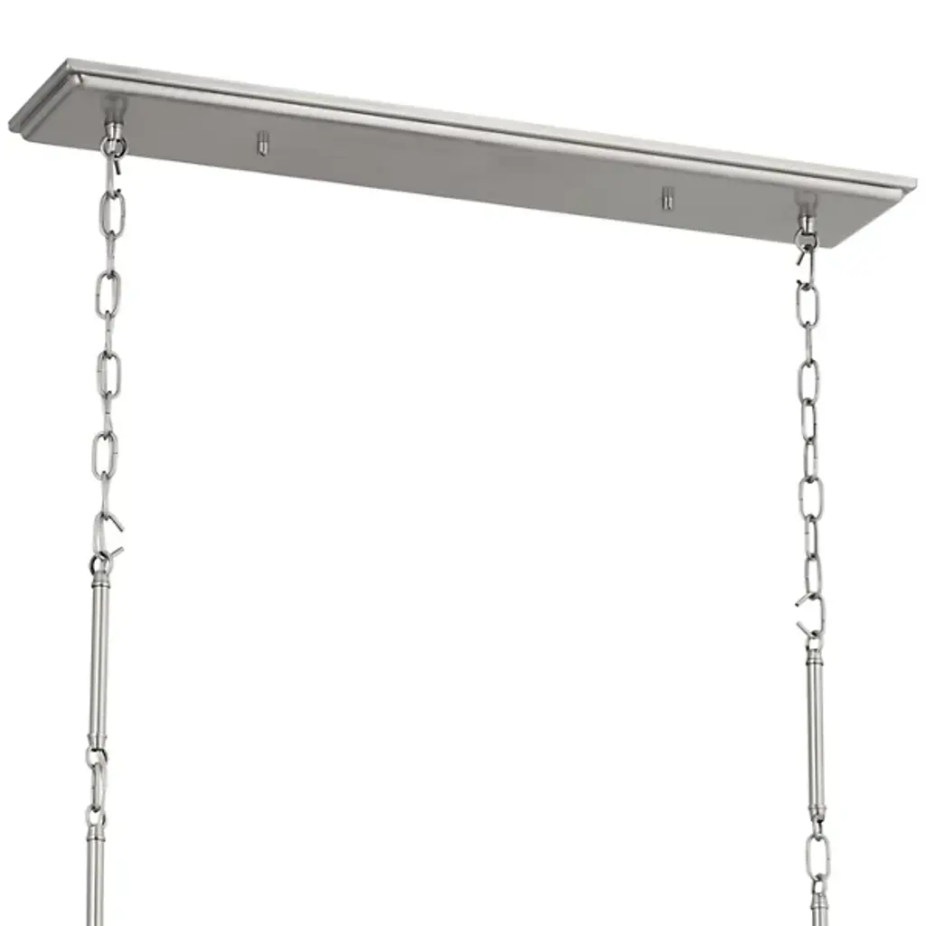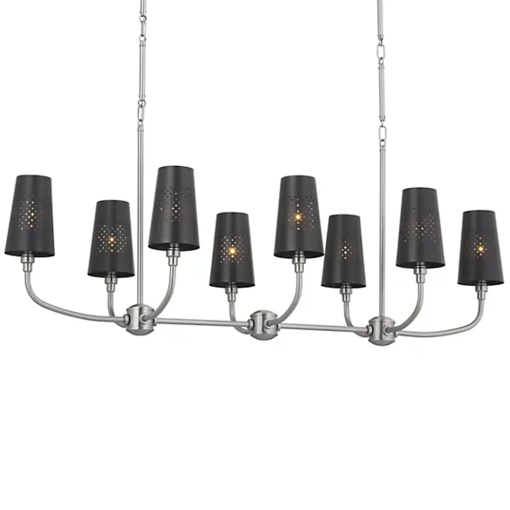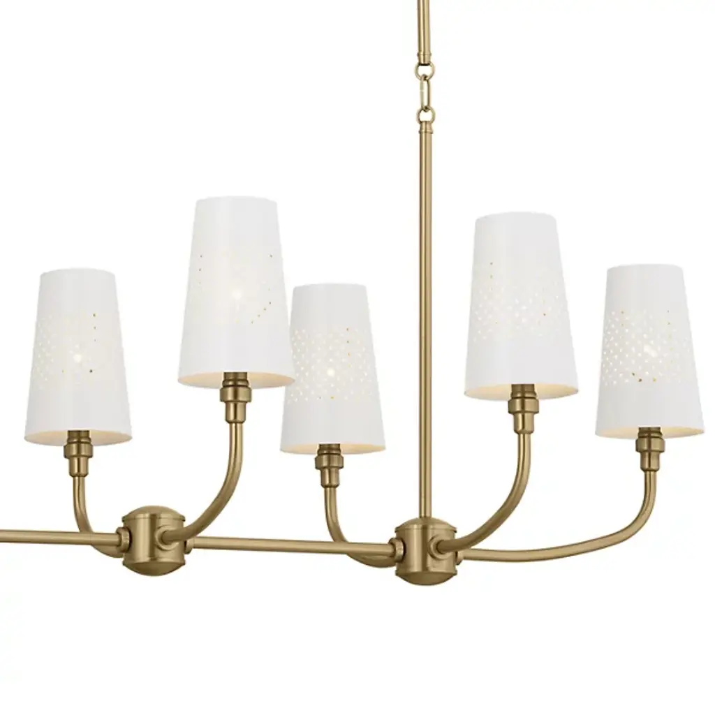 The stylish Adeena Linear Suspension by Kichler is here to illuminate your 21st-century venue. Designed with the same hallmark semi-see-through shades as companion fixtures in the Adeena family, this linear suspension provides ample amounts of light for your living space. Dual chains suspend from a rectangular canopy at your ceiling to facilitate a metal bar’s midair suspension. This bar is lined with multiple groups of wending arms that perfectly balance shades that house incandescent bulbs. This mid-century modern chandelier is sure to fulfill your lightning needs while catching the eyes of your friends and family.
