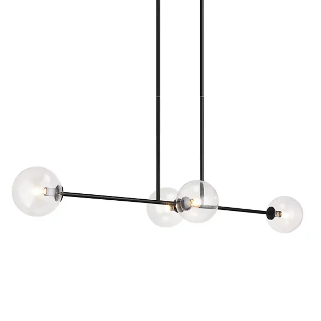 The Adelina Linear Suspension Light from Huxe draws from the past and present to offer a stunning sculptural piece for modern spaces. A rectangular metal canopy drops parallel stems to suspend the fixture’s simple linear frame. A slender beam extends wide to hold globe-shaped shades made of white opal glass on each side. Incandescent lamping filters through the glass to cast a warm layer of light over its surroundings while its contrasting metal tone evokes the simple elegance of Art Deco designs.