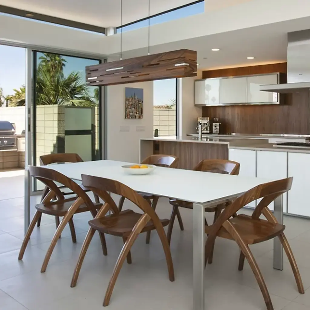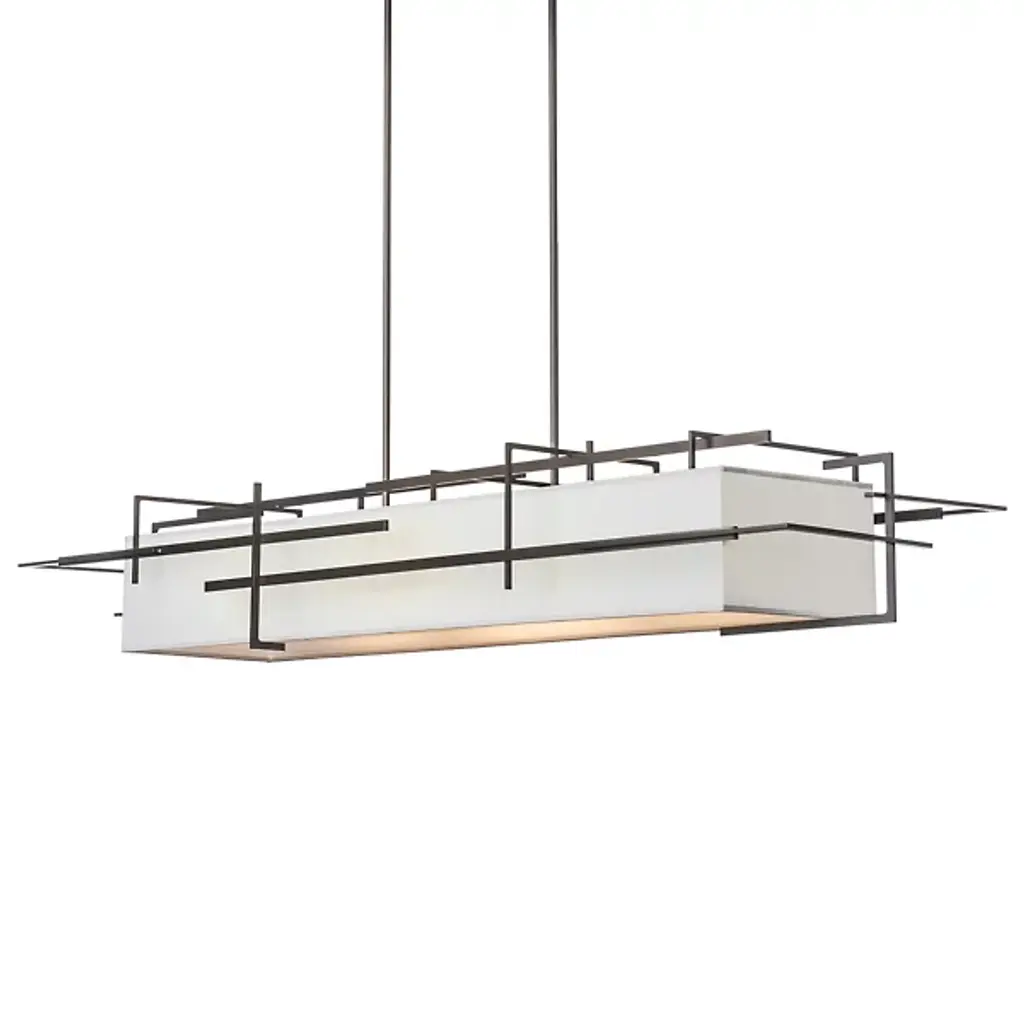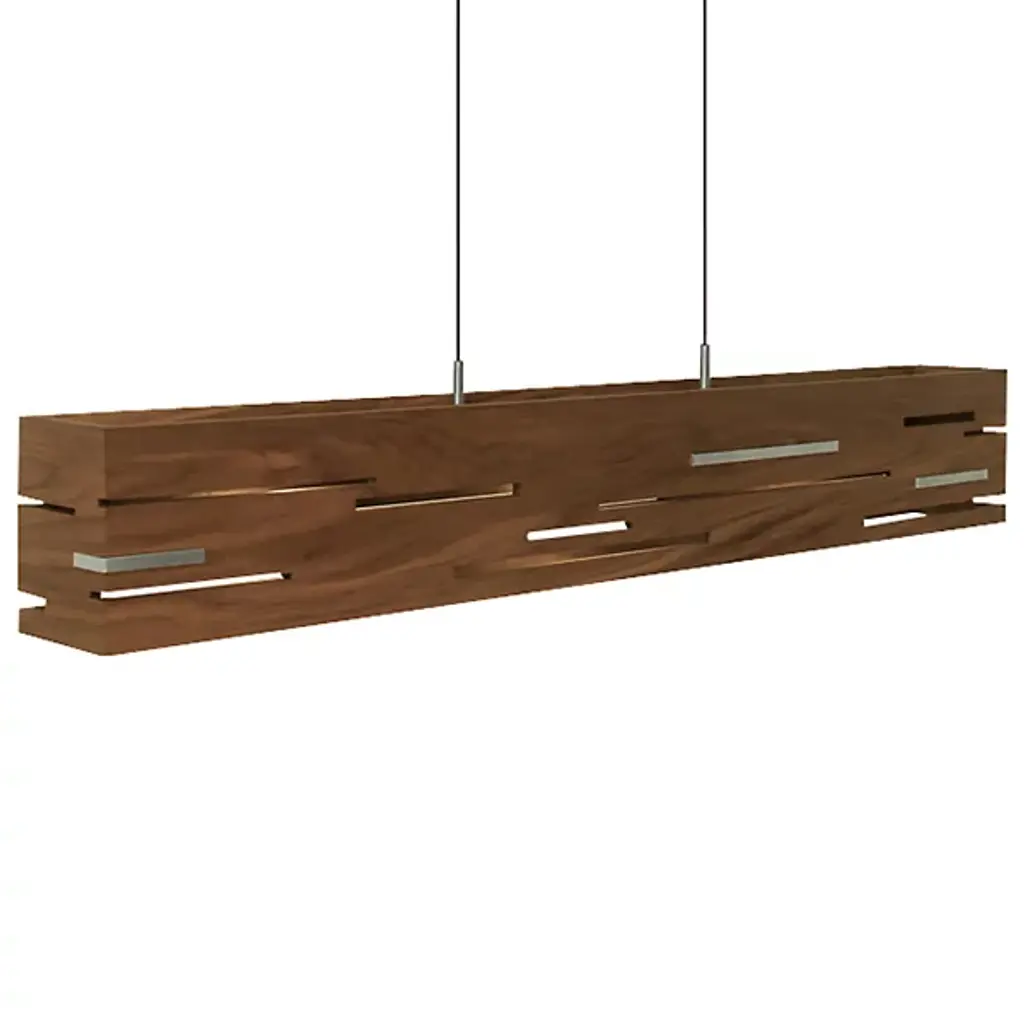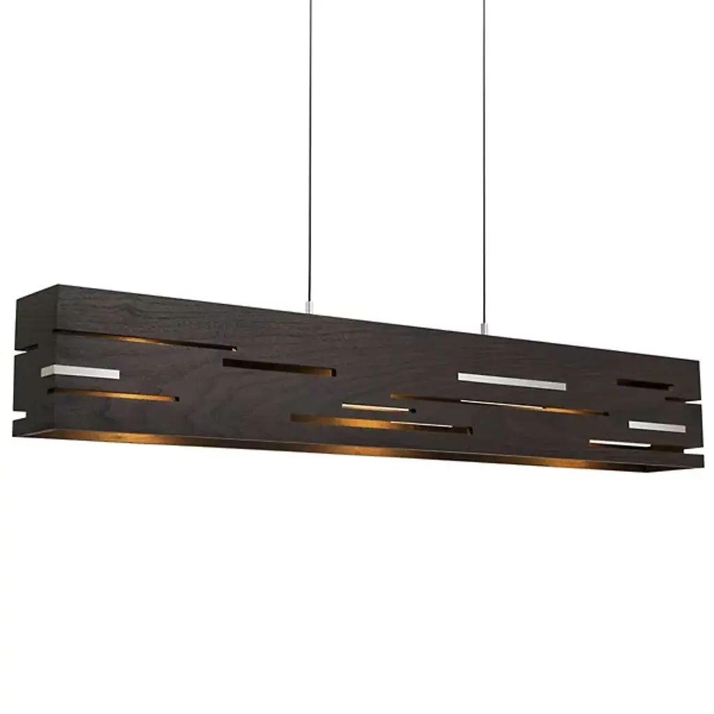 The Aeris LED Linear Suspension from Cerno is a formidable slab of energy efficient linear lighting. A lean block of wondrous walnut features staggered segments of light-emitting cutaways, creating slivers of glowing ambiance that augment the up and down (and dimmable) LED illumination. The natural swirls and waves brought by the wood make each one of these pendants unique and are contrasted by the metal inlays. It comes with 72” of field-adjustable cord, so you don’t have to worry about your ceiling’s height.