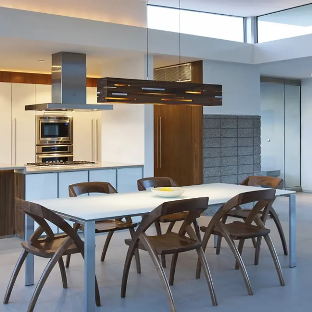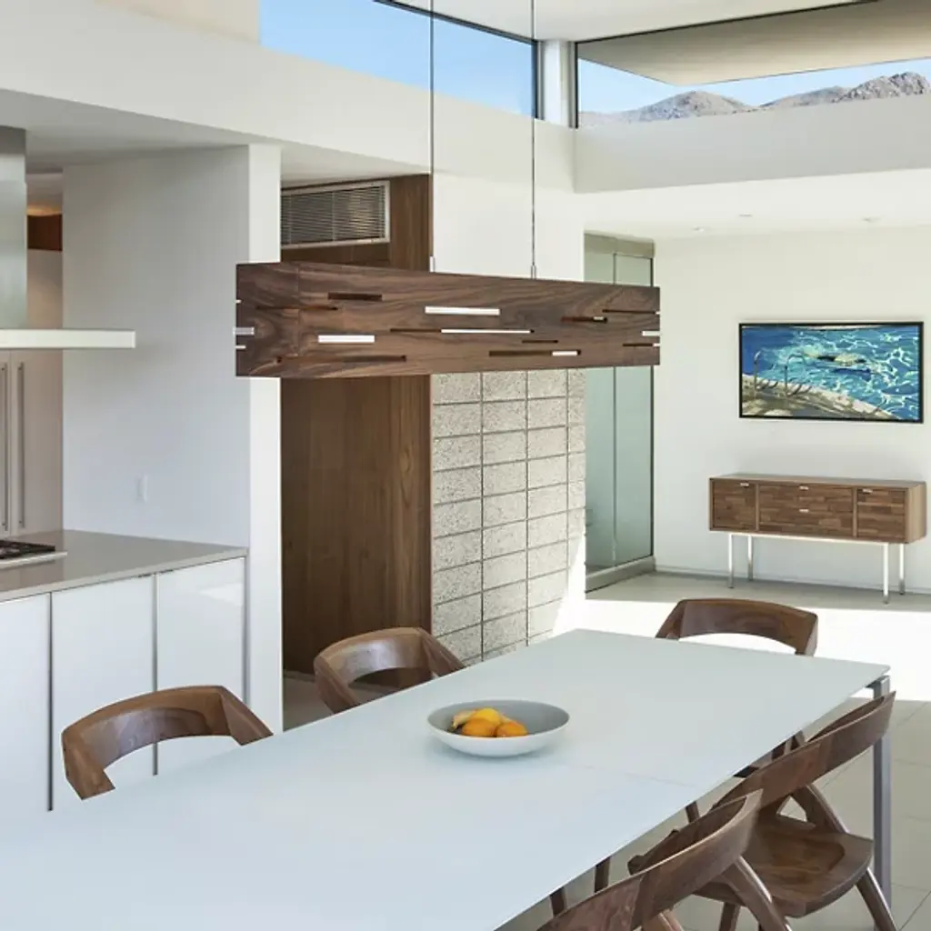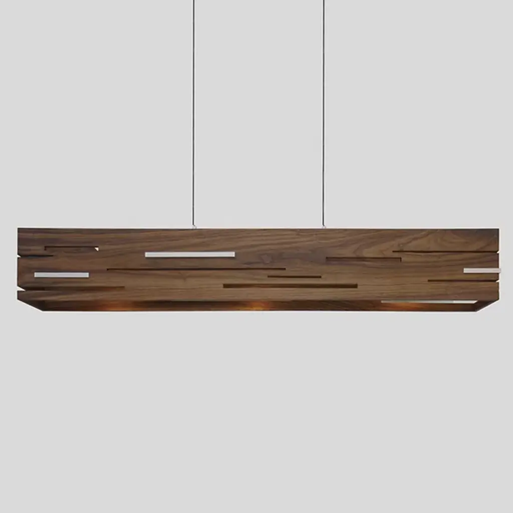 The Aeris LED Linear Suspension from Cerno is a formidable slab of energy efficient linear lighting. A lean block of wondrous walnut features staggered segments of light-emitting cutaways, creating slivers of glowing ambiance that augment the up and down (and dimmable) LED illumination. The natural swirls and waves brought by the wood make each one of these pendants unique and are contrasted by the metal inlays. It comes with 72” of field-adjustable cord, so you don’t have to worry about your ceiling’s height.