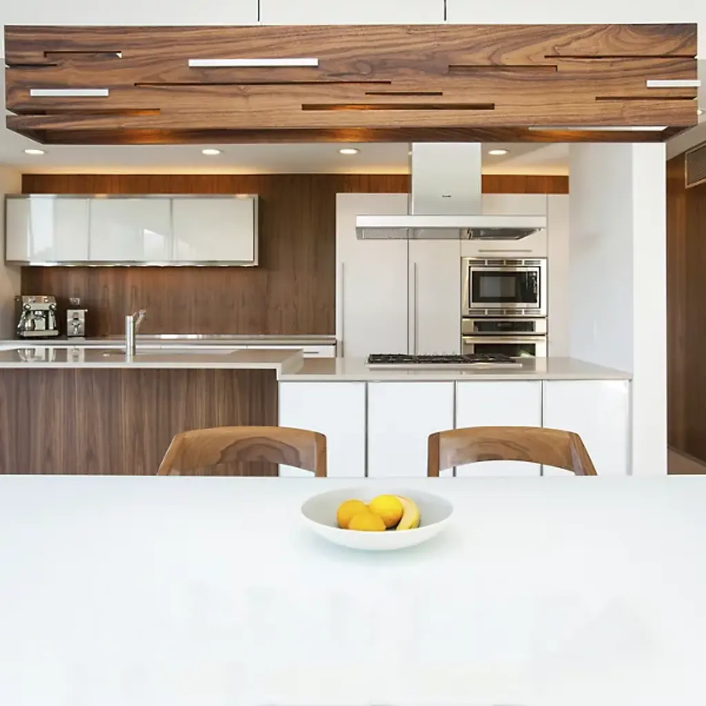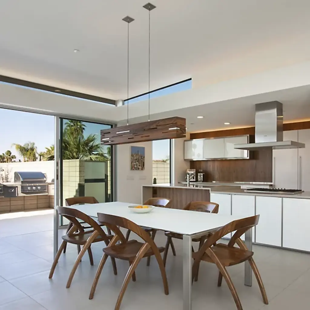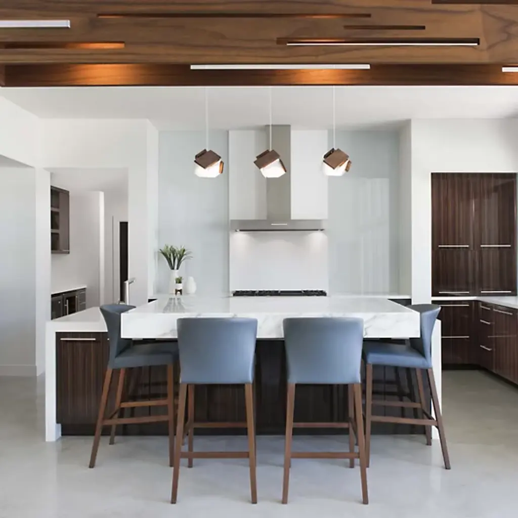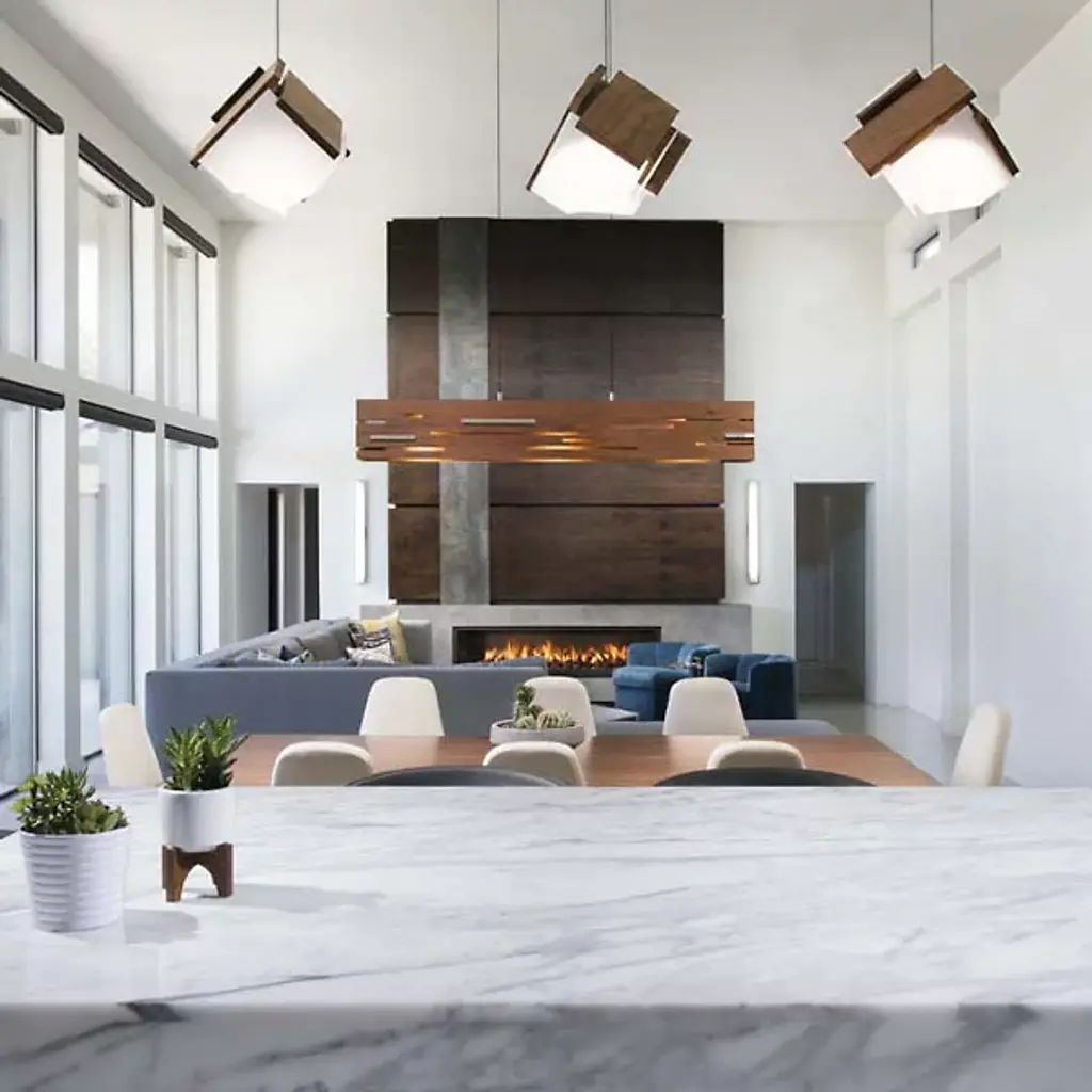 The Aeris LED Linear Suspension from Cerno is a formidable slab of energy efficient linear lighting. A lean block of wondrous walnut features staggered segments of light-emitting cutaways, creating slivers of glowing ambiance that augment the up and down (and dimmable) LED illumination. The natural swirls and waves brought by the wood make each one of these pendants unique and are contrasted by the metal inlays. It comes with 72” of field-adjustable cord, so you don’t have to worry about your ceiling’s height.