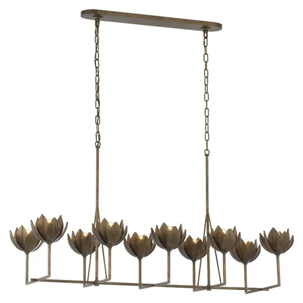 Reference and highlight your room's natural décor with the far-reaching design of the Alberto Linear Suspension from Visual Comfort Modern. This imaginative luminaire represents designer Julie Neill's focus on art and craftsmanship. Sporting intricate metal work, the piece hangs gracefully using slender downrods and fine chain. A slim crossbar below produces pairs of arms whose sharp angles contrast the organic curves above. Artful leaves bunch around the bulbs to soften their glare and catch their cozy light. The diffused light display translates to a great atmosphere