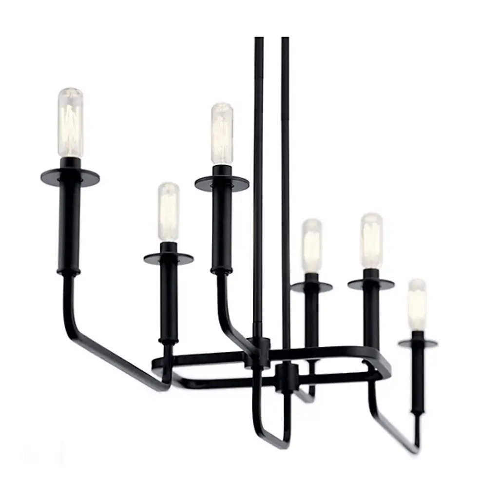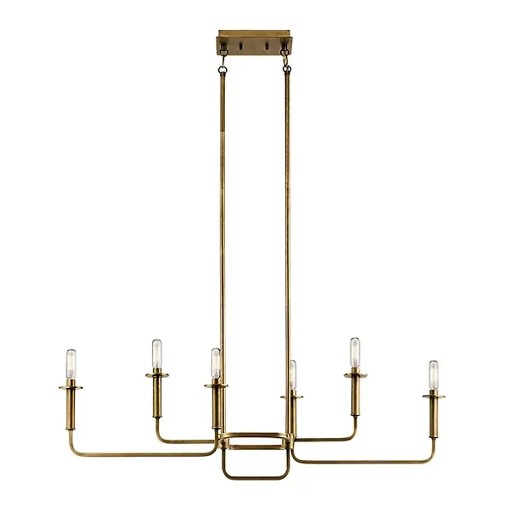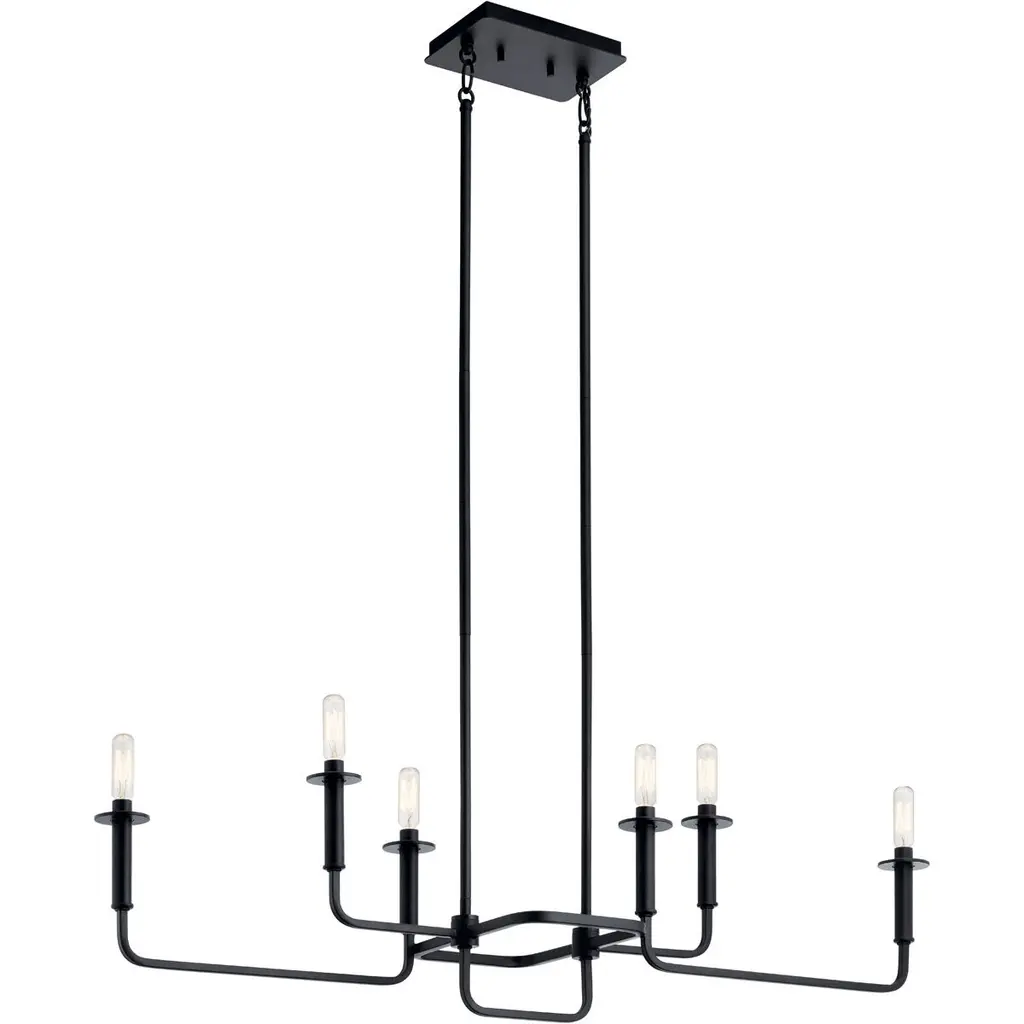 Jazz up your living spaces with the natural asymmetry of the Alden Linear Suspension by Kichler. Dropping from a rectangular metal canopy via two long stems, the metal frame extends flat-sided arms up from a round-cornered frame, each ending in a smooth-sided candelabra socket. While the open lights shine brightly all around, the disc fittings below the lamping block direct downlight. Graceful and practical, the Alden is an intriguing statement sure to enliven modern and minimalist décor alike.