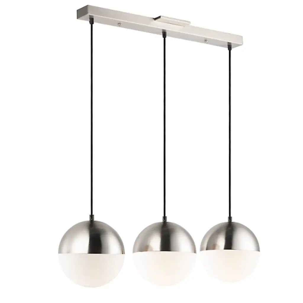 Bring a demonstration of calming, even light to your spaces with the Andrea Linear Suspension from Huxe. Like a half-moon in the night sky, this piece consists of a set of three precise orbs half-adorned with metal and satin white glass. Hanging from the end of a thin wire, each orb is set in a linear arrangement and contains an LED bulb that brings the shade to life. A warm and even layer of light enter the room for a welcoming and relaxing ambiance.