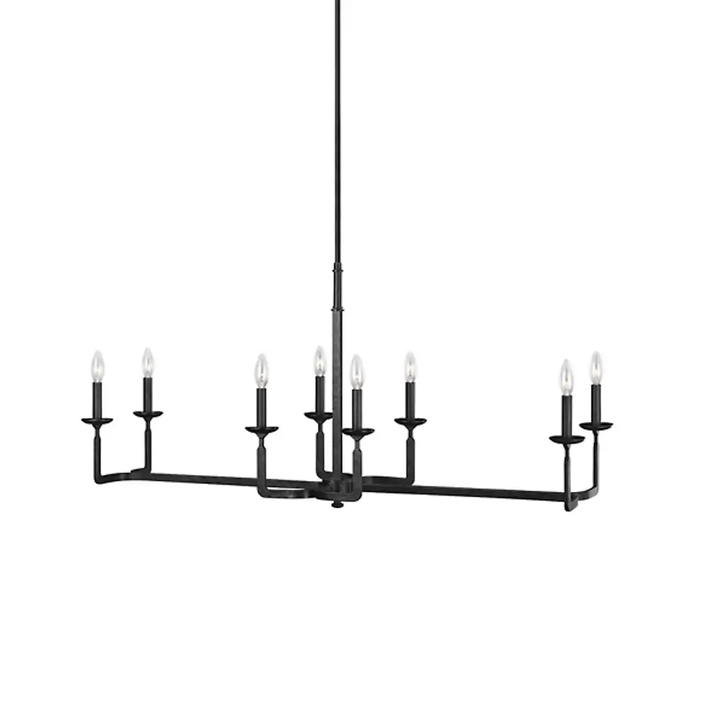 The Ansley Linear Suspension by Generation Lighting, formerly known as Feiss, is a stark fixture that adds a raw, vintage look in any space. Constructed from steel, its slender downrod suspends a linear silhouette with thin arms that curve upward to antique-style candle holders. An aged iron styling gives the fixture a worn, hand-forged quality that instantly calls attention. Incandescent bulbs cast a warm light, unobstructed by shades to allow its historical aesthetic to shine.