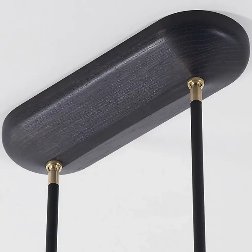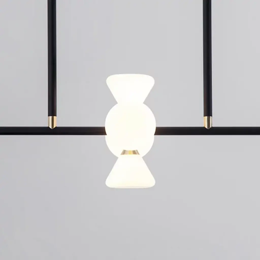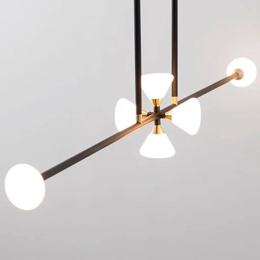 Near every surface in the room is covered by the multi-directional light and spanning silhouette of the Apollo 6 Light LED Linear Suspension from Roll & Hill. Creator McKenzie & Keim thoughtfully place each line and the components connecting them. This is illustrated with the rich wood canopy, brass fittings, and slender down rods. A uniform crossbar directs one’s eyes across the room. Handblown glass shades keep the eyes fixated as chic cone forms. Housing brilliant LEDs, the crossing shades inside and the ones at the ends filter out a clean, relaxed light.