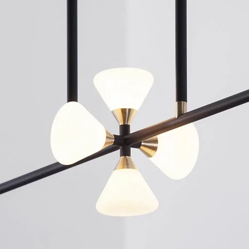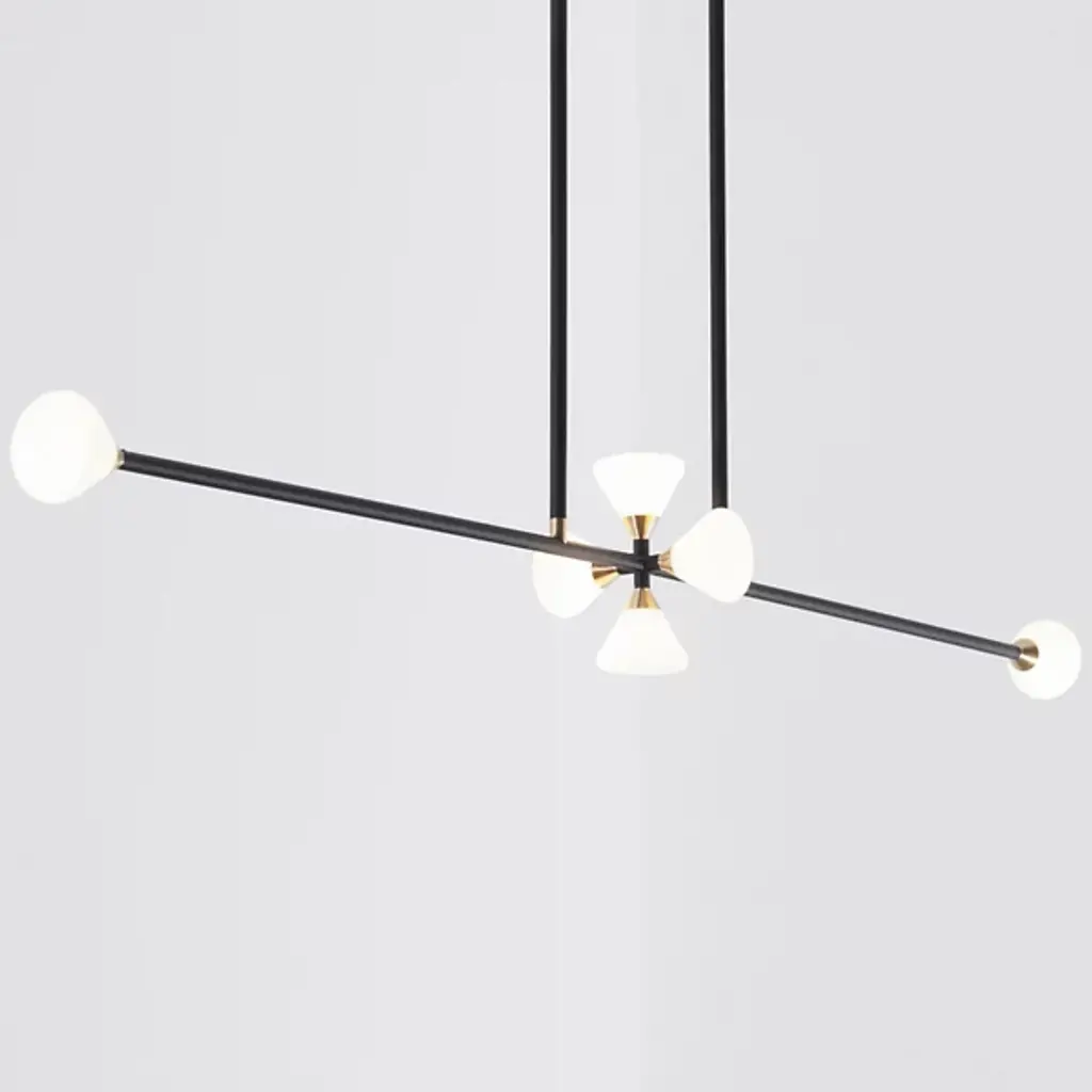 Near every surface in the room is covered by the multi-directional light and spanning silhouette of the Apollo 6 Light LED Linear Suspension from Roll & Hill. Creator McKenzie & Keim thoughtfully place each line and the components connecting them. This is illustrated with the rich wood canopy, brass fittings, and slender down rods. A uniform crossbar directs one’s eyes across the room. Handblown glass shades keep the eyes fixated as chic cone forms. Housing brilliant LEDs, the crossing shades inside and the ones at the ends filter out a clean, relaxed light.