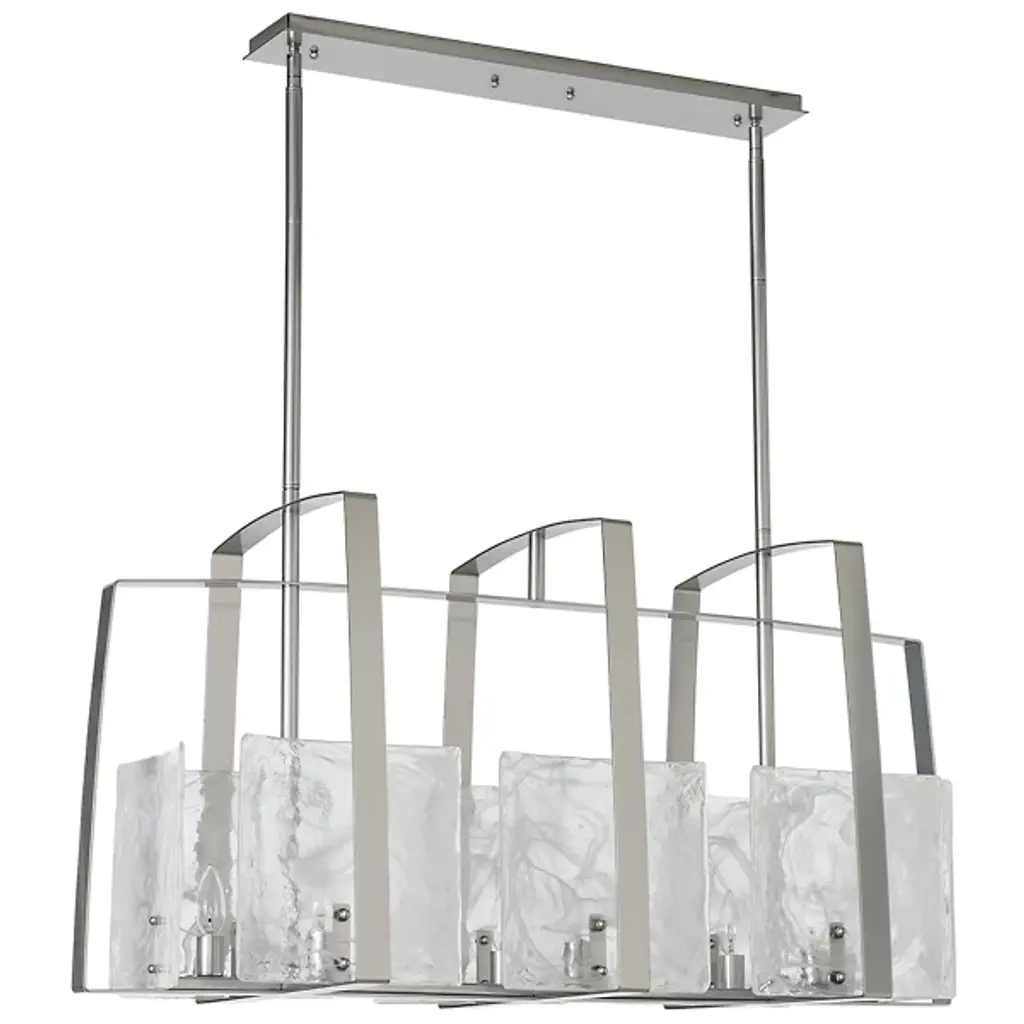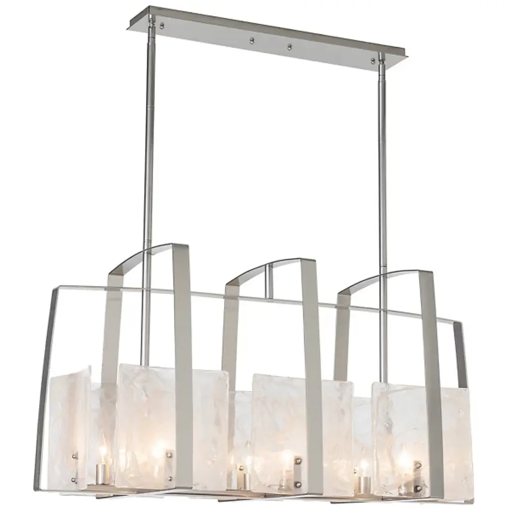 Architectural, linear lighting ideal for the modern kitchen or dining room. The generous proportions of the Arc Linear Suspension by Hubbardton Forge serve to really showcase the arcing lines of the frame. The handmade steel bands smoothly and gently curve up and around the convex panels of thick, textural art glass. As the glass works to diffuse the light produced by the bulbs behind it, the light helps to show off each panel’s distinctive texture and undeniable artistry.