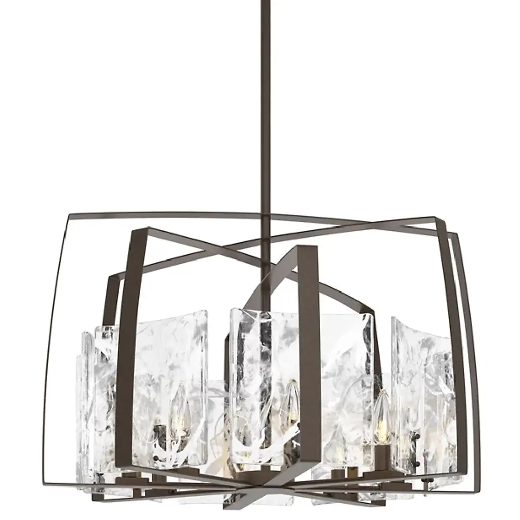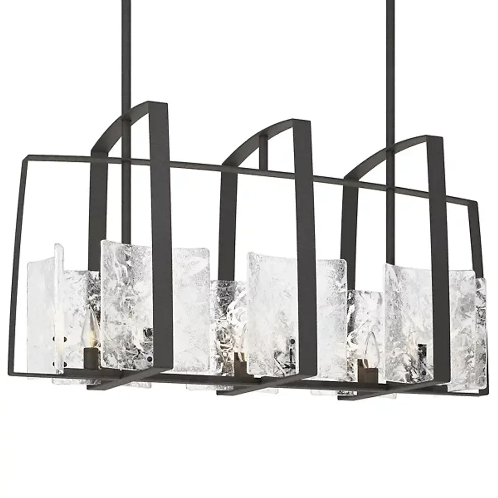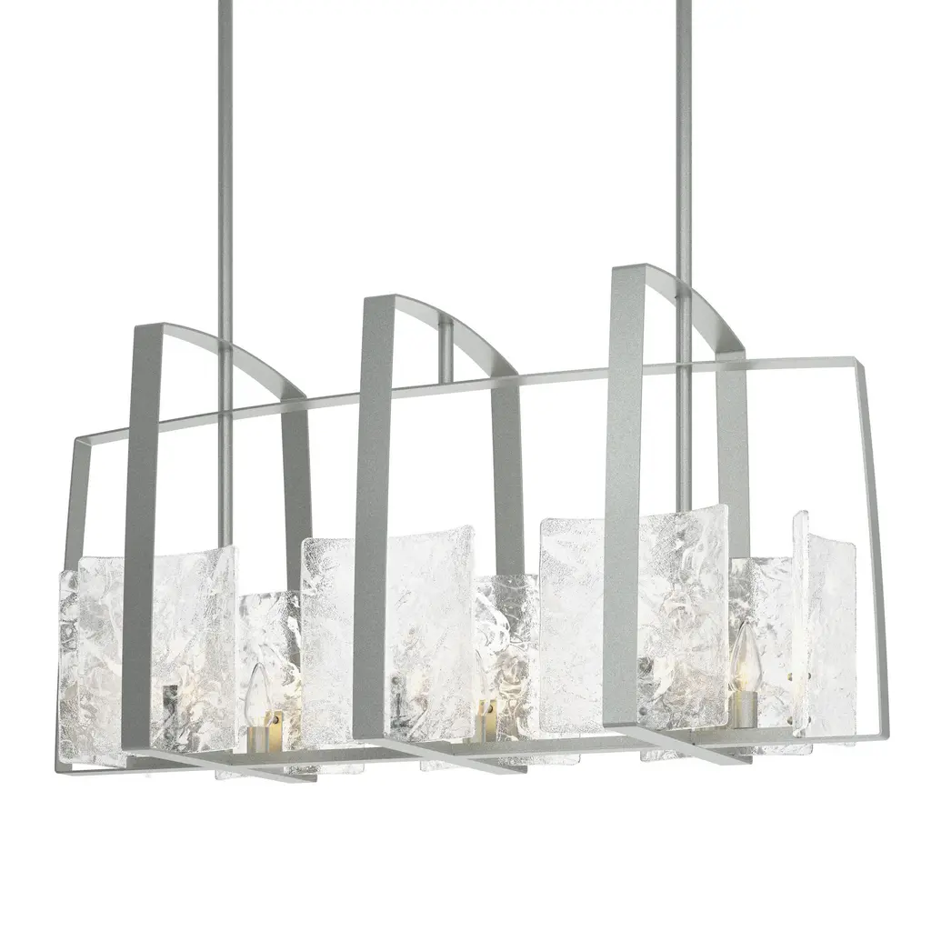 Architectural, linear lighting ideal for the modern kitchen or dining room. The generous proportions of the Arc Linear Suspension by Hubbardton Forge serve to really showcase the arcing lines of the frame. The handmade steel bands smoothly and gently curve up and around the convex panels of thick, textural art glass. As the glass works to diffuse the light produced by the bulbs behind it, the light helps to show off each panel’s distinctive texture and undeniable artistry.