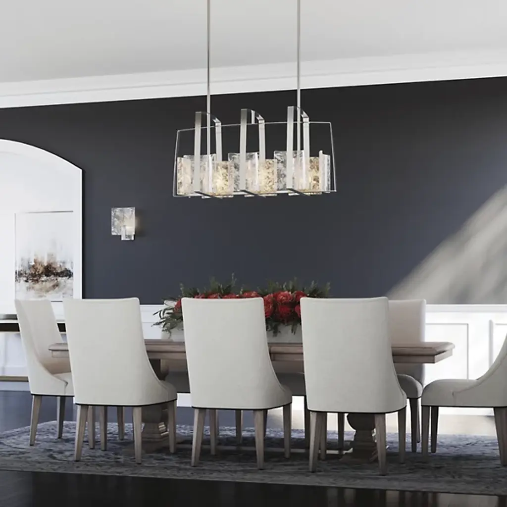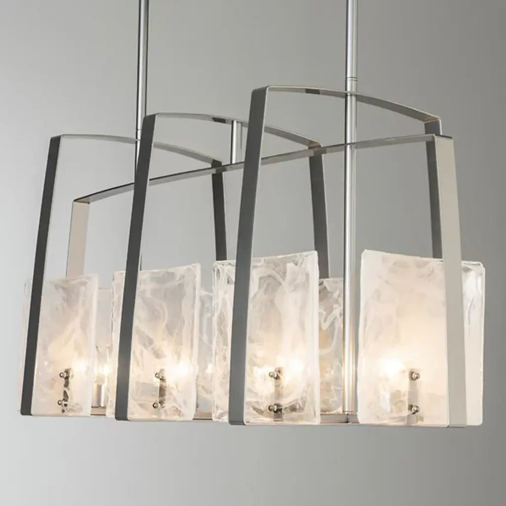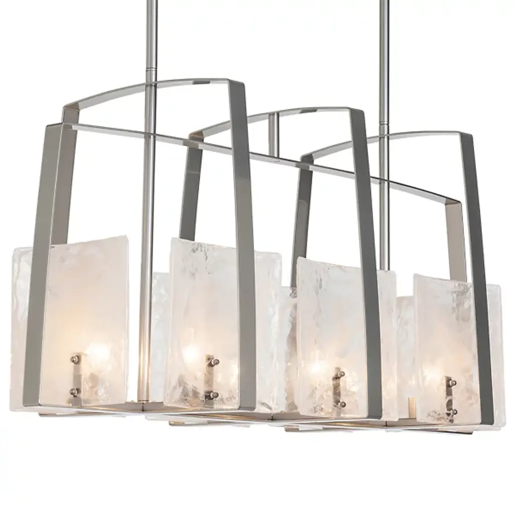 Architectural, linear lighting ideal for the modern kitchen or dining room. The generous proportions of the Arc Linear Suspension by Hubbardton Forge serve to really showcase the arcing lines of the frame. The handmade steel bands smoothly and gently curve up and around the convex panels of thick, textural art glass. As the glass works to diffuse the light produced by the bulbs behind it, the light helps to show off each panel’s distinctive texture and undeniable artistry.