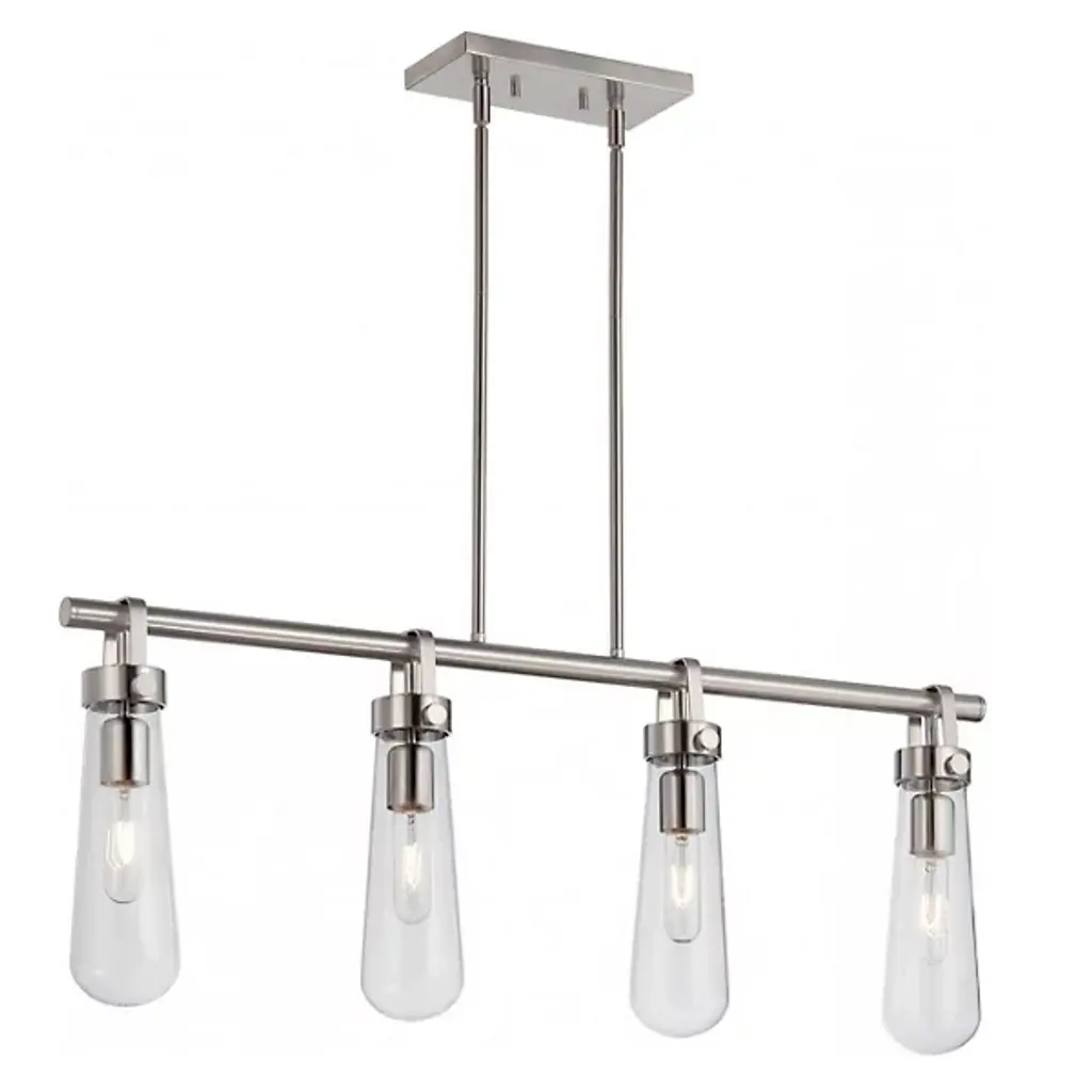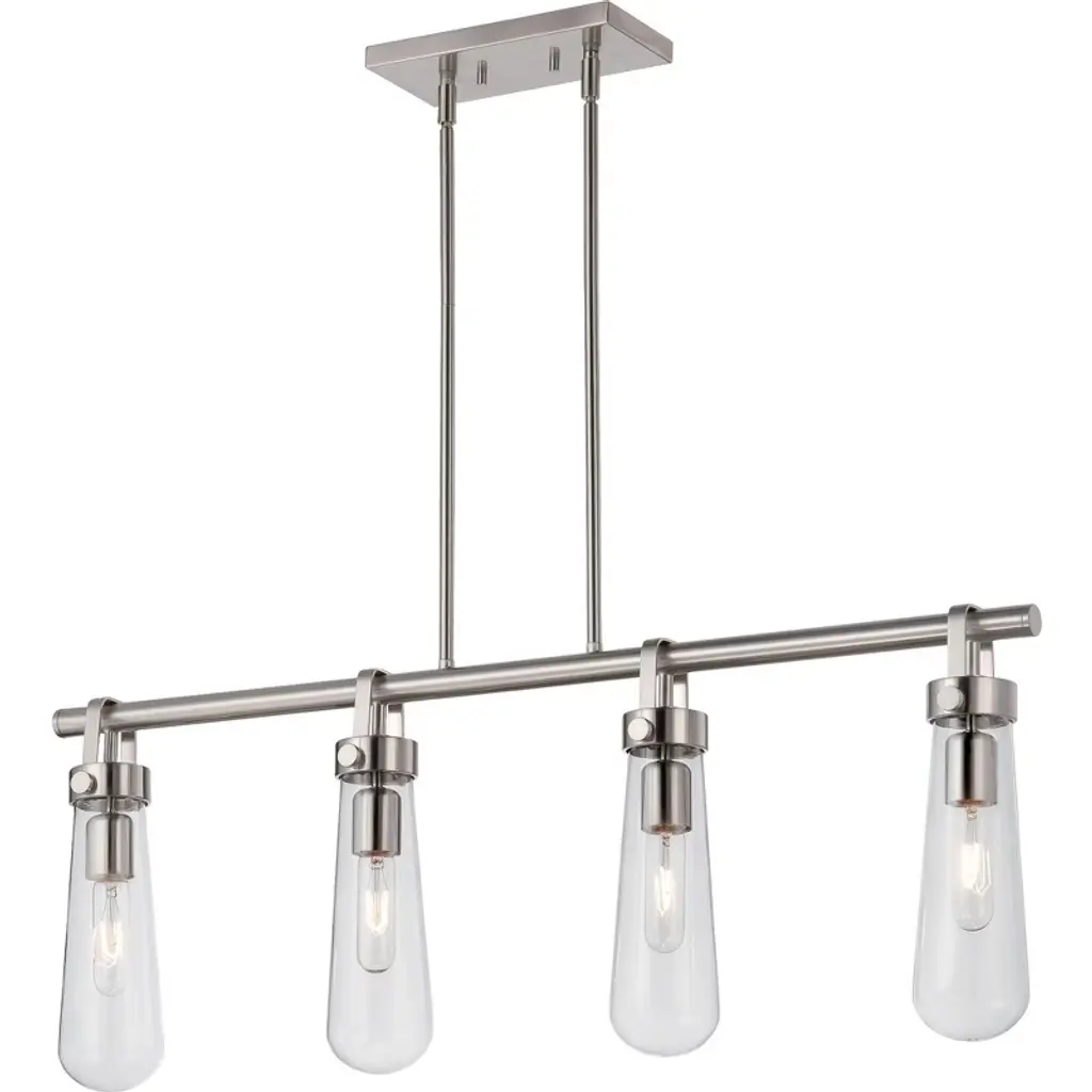 The Aretha Linear Suspension by Alder & Ore is a minimally styled, contemporary piece. Suspended by a pair of down rods, a linear bar creates a clean foundation for a collection of elongated, rounded glass shades to hang from. Paired with a simple top, curved handle, and some visible hardware, the clean look of each shade lends to the tailored feel of this design. Within each shade, a visible bulb helps to provide plenty of light to surroundings, making this a bright and beautiful addition to rooms.