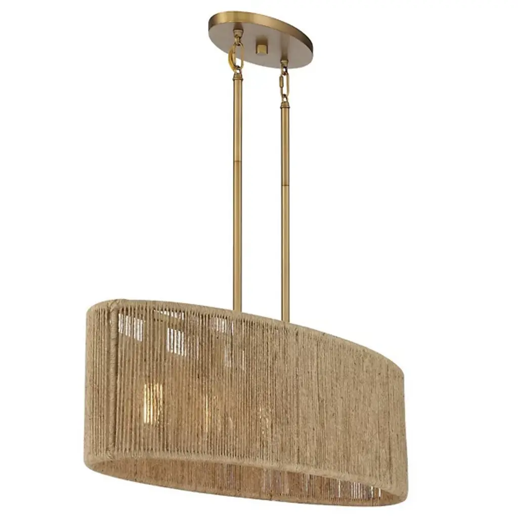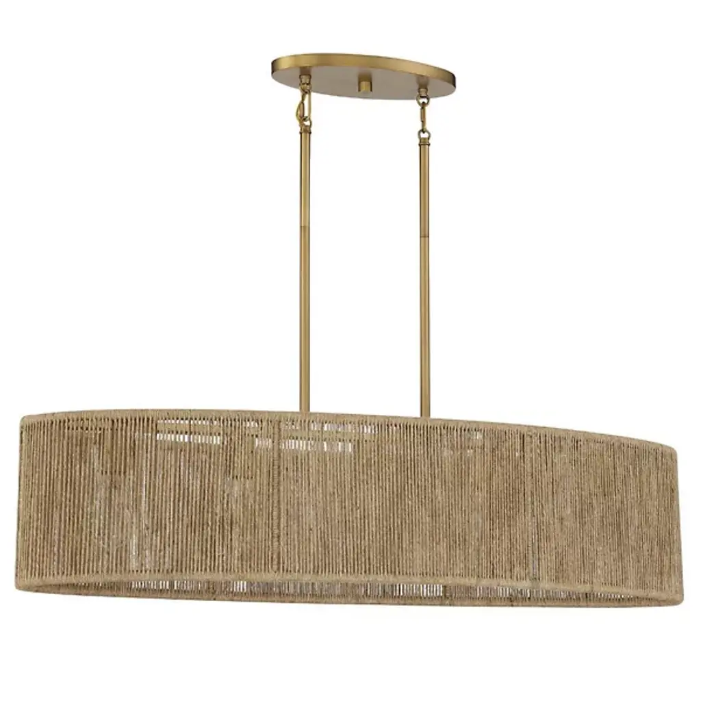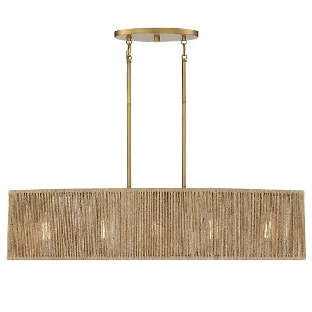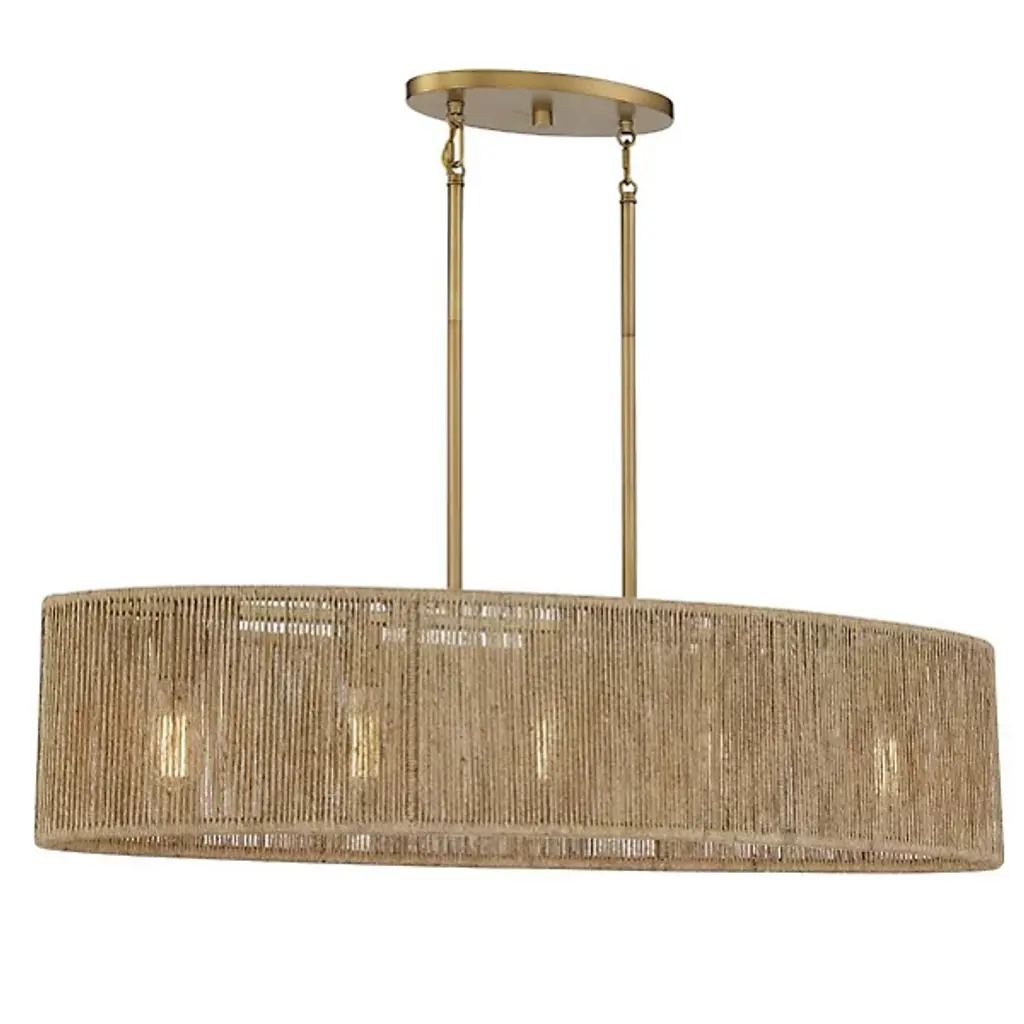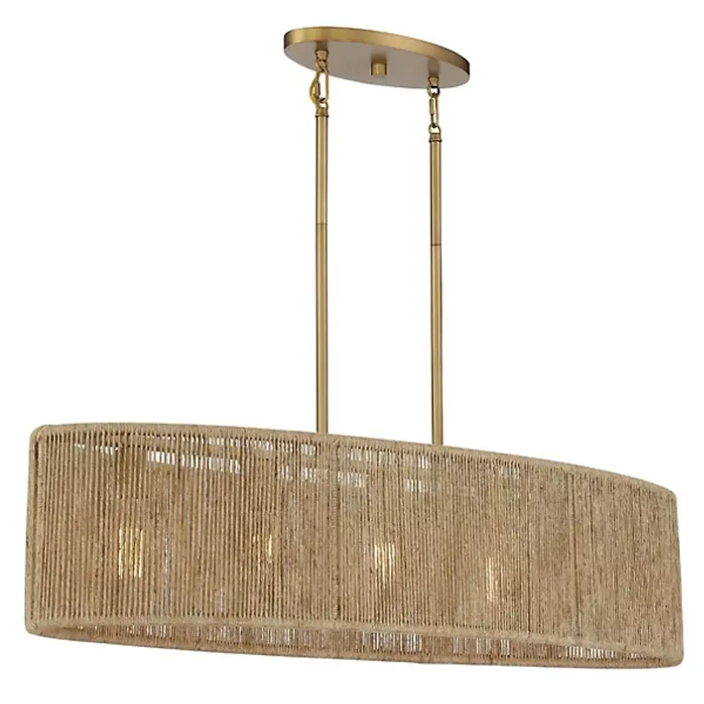 The Ashe Linear Suspension from Savoy House makes one want to reach their hand out as it features an organic rope design underscored by its warmth and tactile quality. Use this wide oval piece to follow the long format of a kitchen island or dining table. The oval metal framework creates a clean set of curves that gives the lamping inside room to breathe. Artisans wrap the framework with rows of rope from top to bottom. The openings between each rope give the bulbs a dramatic presence inside. These bulbs add pops of golden detail to the ropes when lit. Together the bulbs produce a filtered spread of rich illumination.