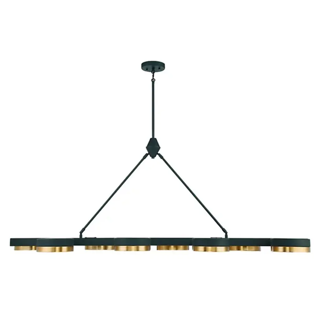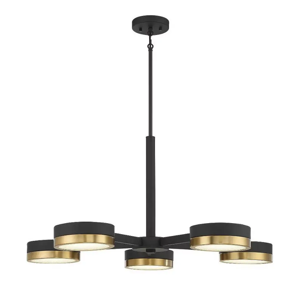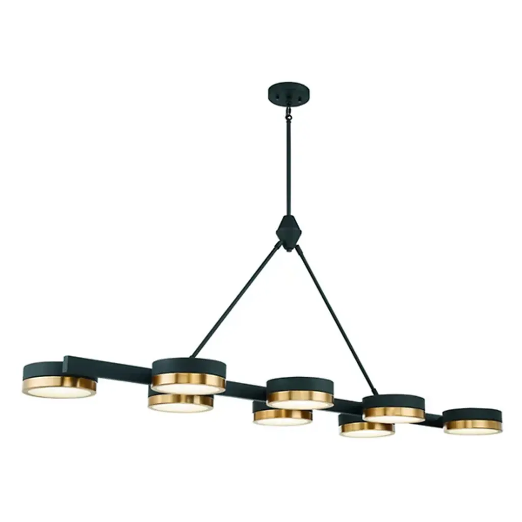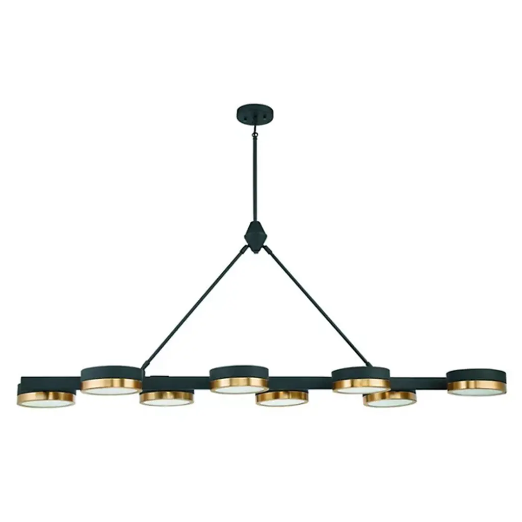 A contemporary take on the classic chandelier. A linear formation of disks with a two-tone finish of matte black and warm brass has crushed crystal shades with integrated and energy-efficient LED illumination. It all hangs from the ceiling on slender stems, adjustable down rod, and canopy in a matching matte black finish. The overall composition has a mid-mod flair, giving the Ashor LED Linear Suspension an extra touch of charm.