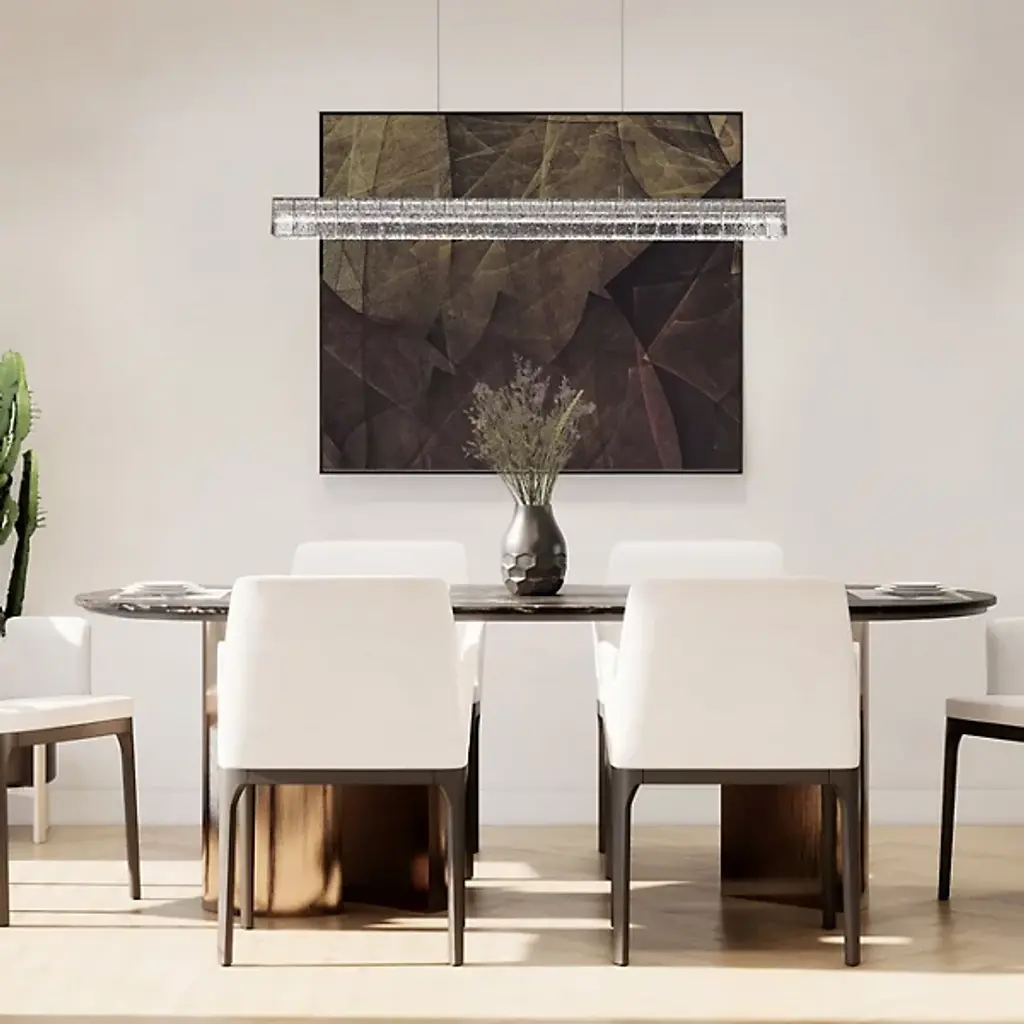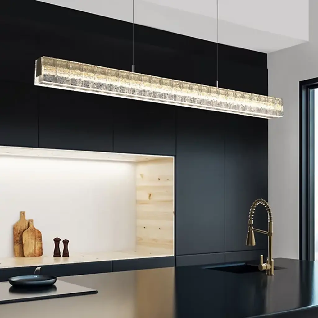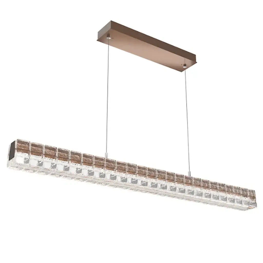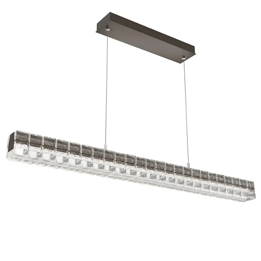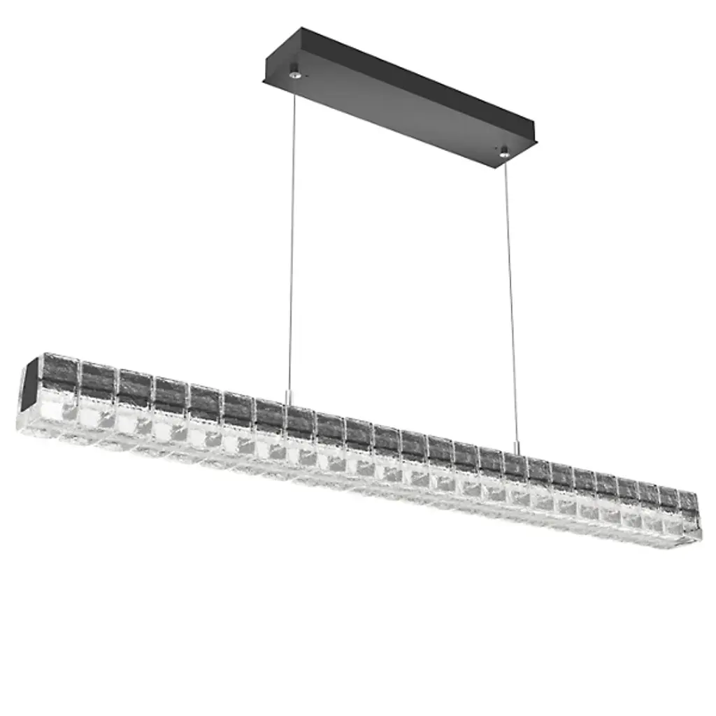 Hammerton Studio presents the Asscher LED Linear Suspension. A 48" wide row of symmetrical channel-set diffusers, each handcrafted from clear artisan cast glass, evokes the look of diamond jewelry in this glittering linear chandelier. Sleek and sparkling, this clean-lined design elevates kitchens, bars, and other functional entertaining spaces without blocking views.