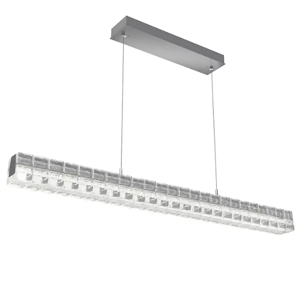 Hammerton Studio presents the Asscher LED Linear Suspension. A 48" wide row of symmetrical channel-set diffusers, each handcrafted from clear artisan cast glass, evokes the look of diamond jewelry in this glittering linear chandelier. Sleek and sparkling, this clean-lined design elevates kitchens, bars, and other functional entertaining spaces without blocking views.