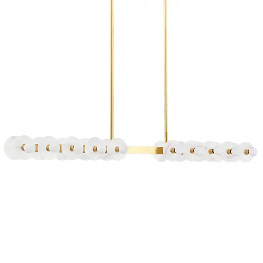 With the perfect balance of modern sleekness and natural warmth, the Austen Linear Suspension by Hudson Valley Lighting brings a striking statement to any space. Its see-saw inspired design features a lengthened linear metal frame that drops from the ceiling by a pair of slender downrods. Natural alabaster discs are set along the length of both sides of the frame, holding incandescent bulbs at their center. When illuminated, its light is bounced from the alabaster while highlighting its natural pattern and creating an inviting ambiance for the room.