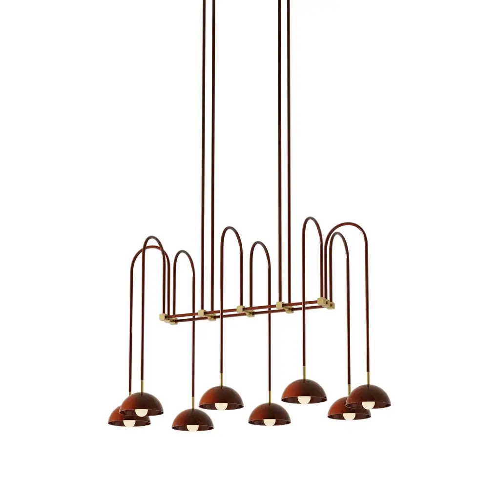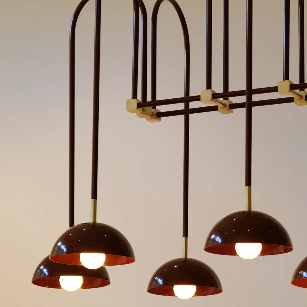In the substantially midsize 05, like its siblings in the series, Beaubien Atelier mingles a host of influences from the romance of Art Deco to a hint of industrial spirit to arrive at a bold, ornamental suspension lamp. Fashioned in powder-coated aluminum, the structure and shades are complemented by brass hardware and milk glass globes that gently diffuse the LED illumination.