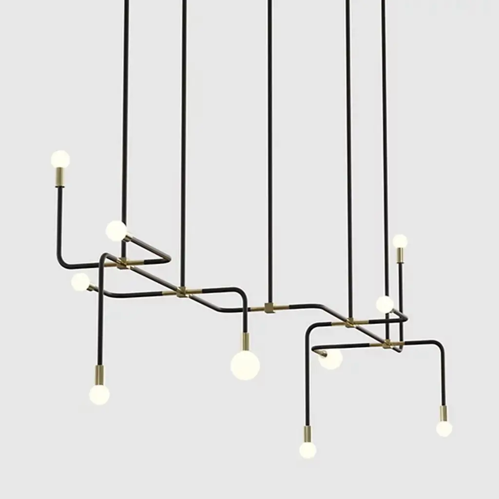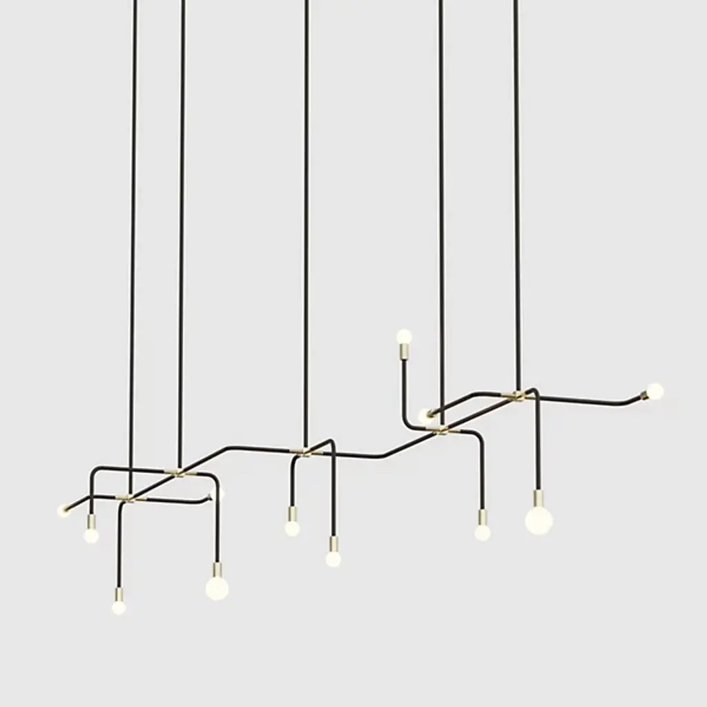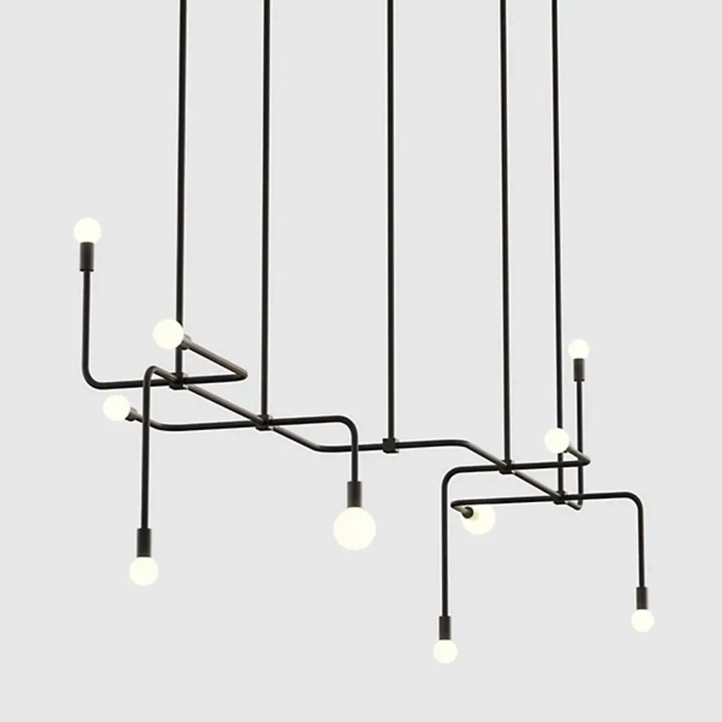 Elegant, artistic, expressive. Fuse the delightful forms of the Memphis movement with the bold patterns of traditional Chinese screens and you get the inspiring visual of the Beaubien Linear Suspension from Lambert & Fils. Designer Samuel Lambert brings a signature aesthetic that feels both humble and complex. Appearing to float in the air, the piece draws a graphic rectangular frame with a tubular metal frame. Short arms inside mesmerize in movement like the intricate pattern of a Chinese screen. Milk glass globes give the linear design an enchanting quality. The globes appear like the bright, exciting shapes of a Memphis design from the 80s. Lit with bright LEDs, the globes produce clean illumination that fills the room with warm comfort.