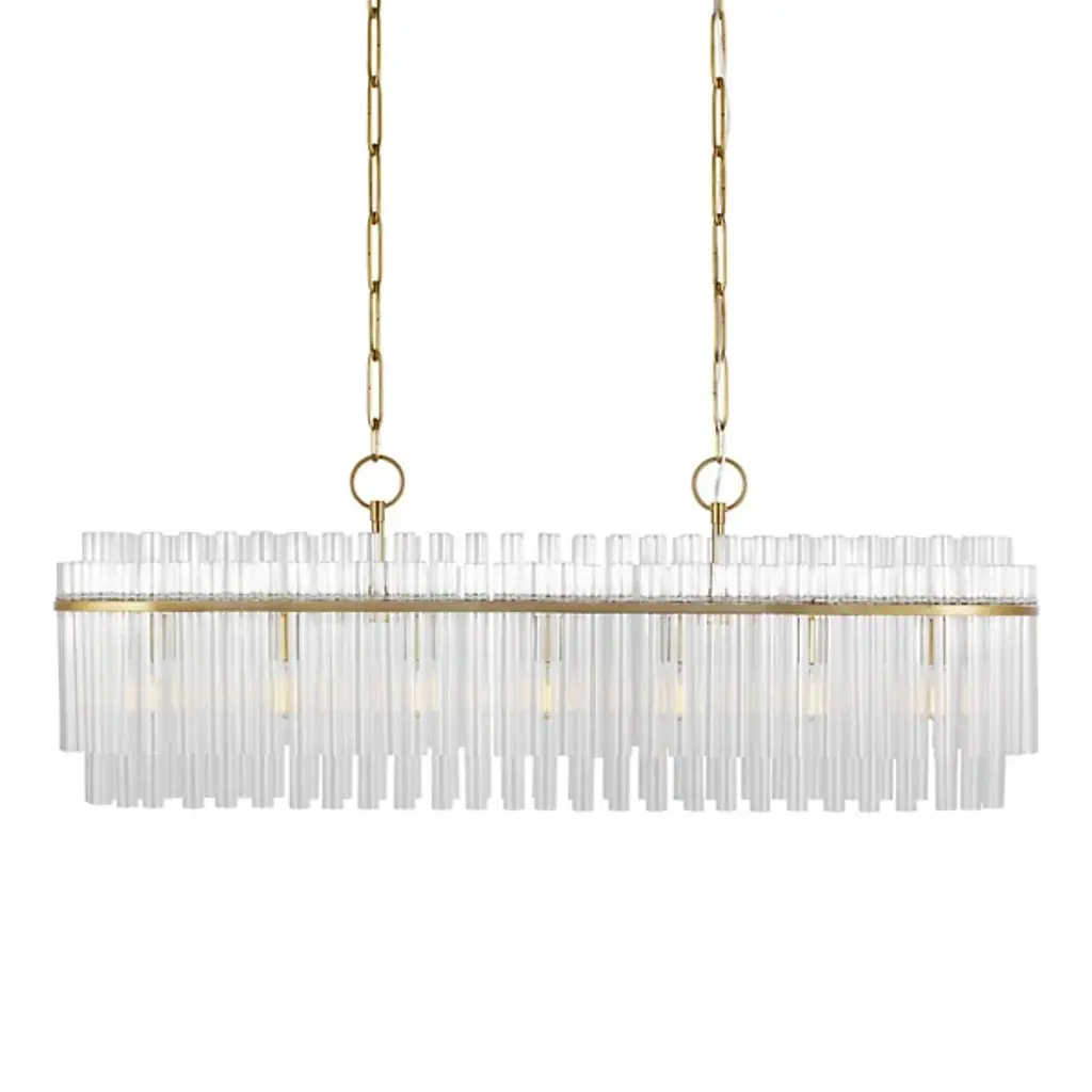 Captivate a space with the Beckett Linear Suspension by Visual Comfort Studio, formerly known as Chapman & Myers, Showcasing a refined touch of glamor, this fixture is suspended by a pair of thin chains ending in a slender loop. An array of clear glass flutes are held vertically along its elongated metal frame. A set of incandescent bulbs are dropped from the frame, arranged within the layered glass flutes. The fixture’s light casts an ambient glow throughout its surroundings while offering a gleaming textural statement.