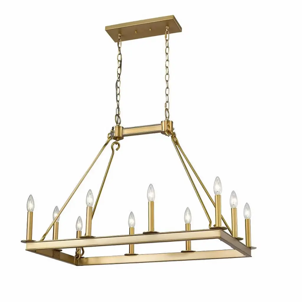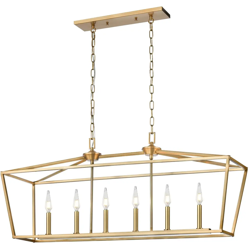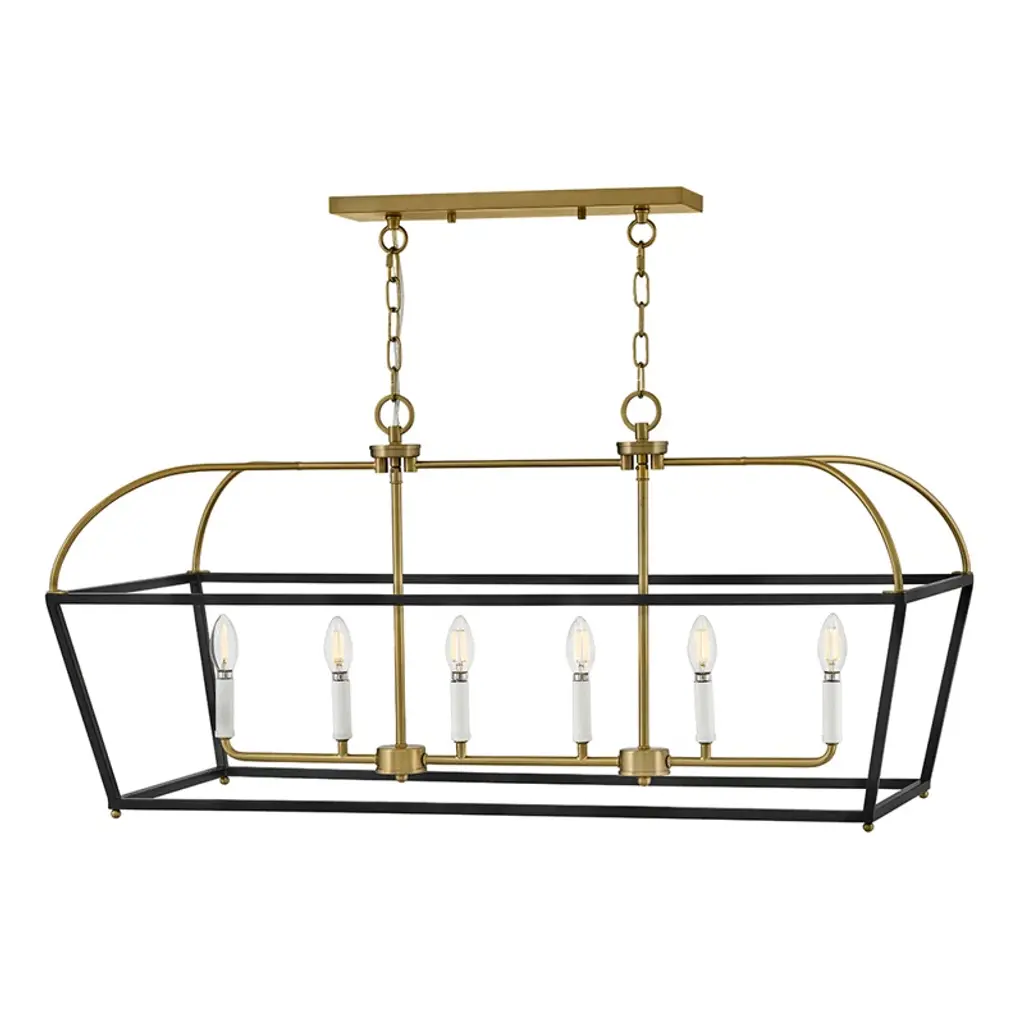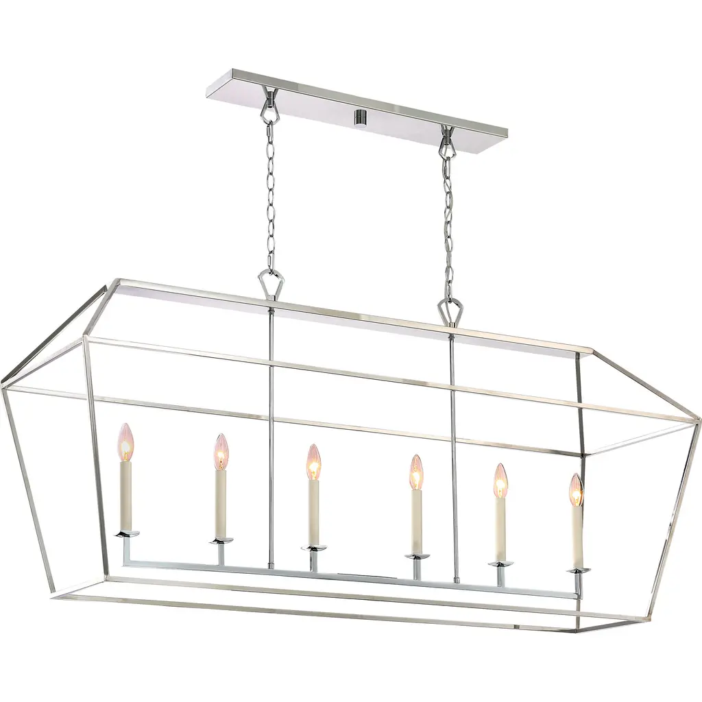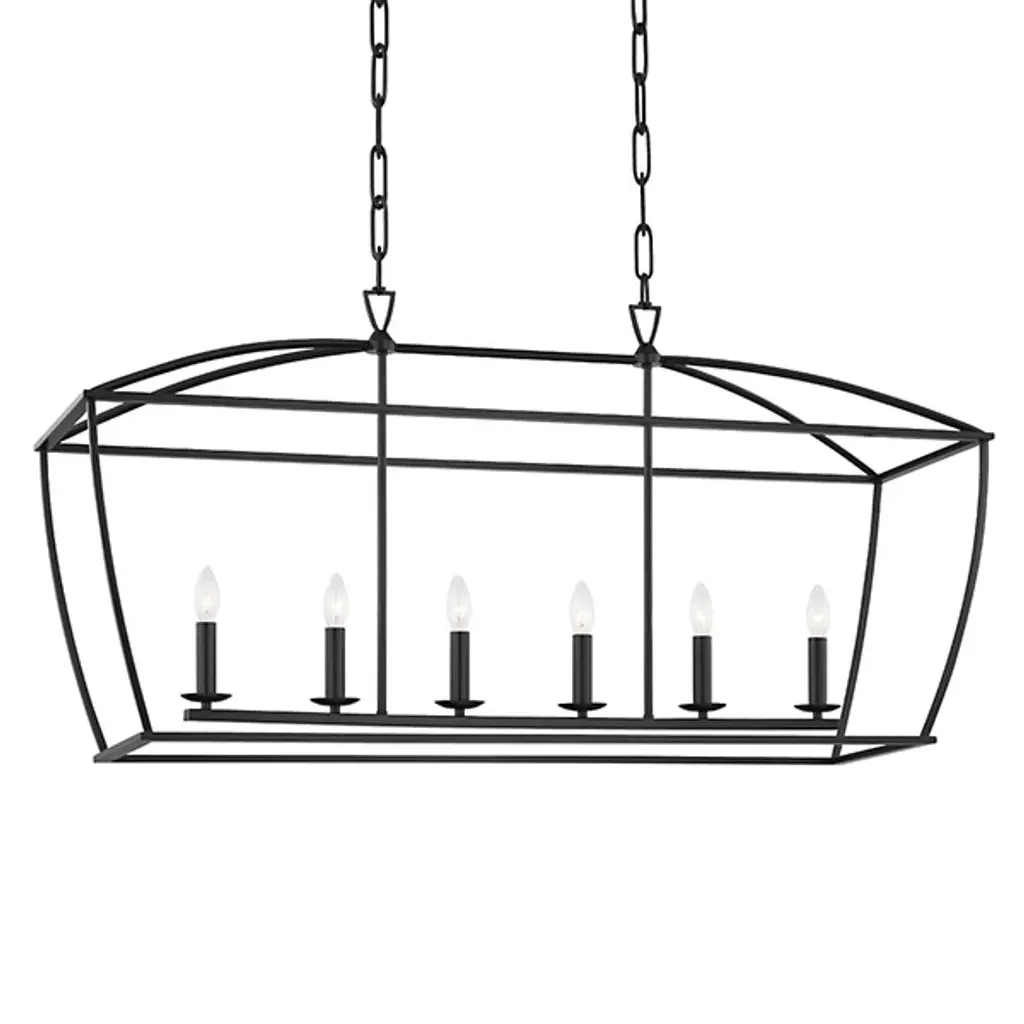 Enhance your large indoor living spaces with the wide-reaching array of light cast by the Bryant Linear Suspension from Hudson Valley Lighting. Held securely by two short lengths of chain that drop in parallel to two finials from a smooth upper canopy, the double theme continues as two slender, but strong steel stems descend from the finials to the long beam below. Accented by a large cage structure, an evenly-spaced series of damp-listed candelabra-style bulbs rise from the beam’s upper surface, extending a corona of light around the fixture.