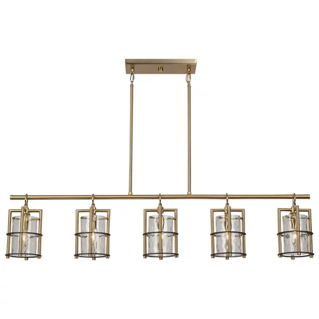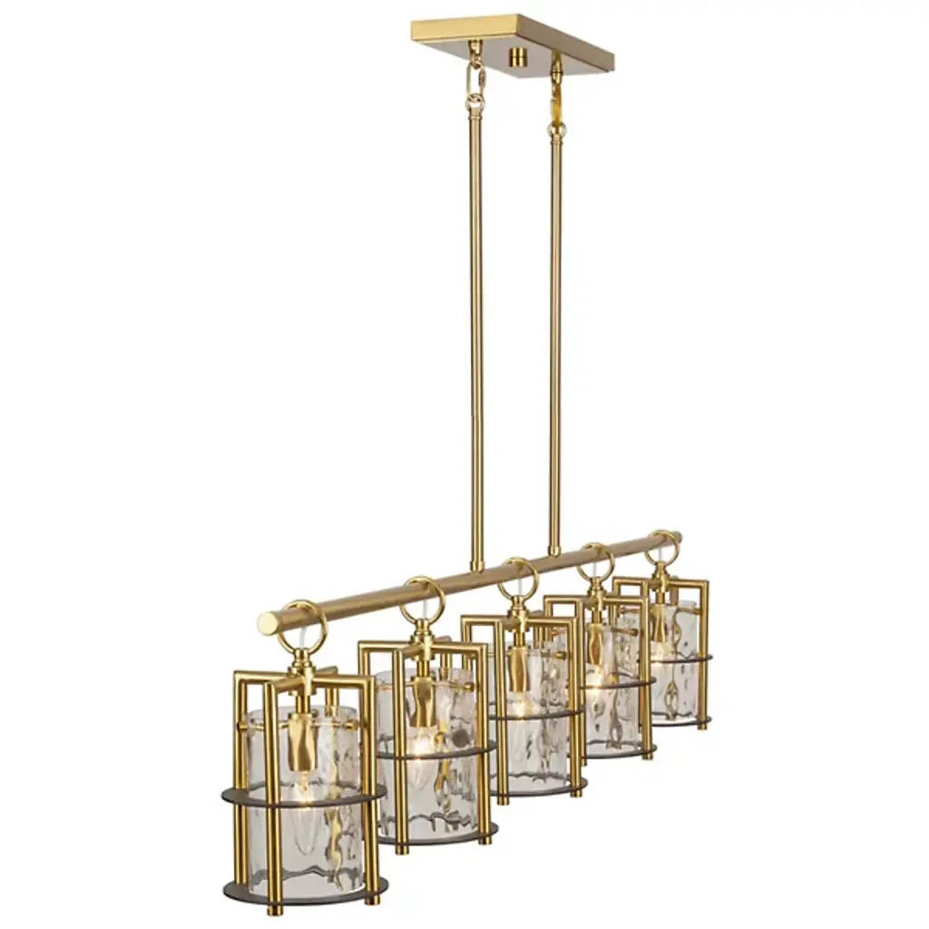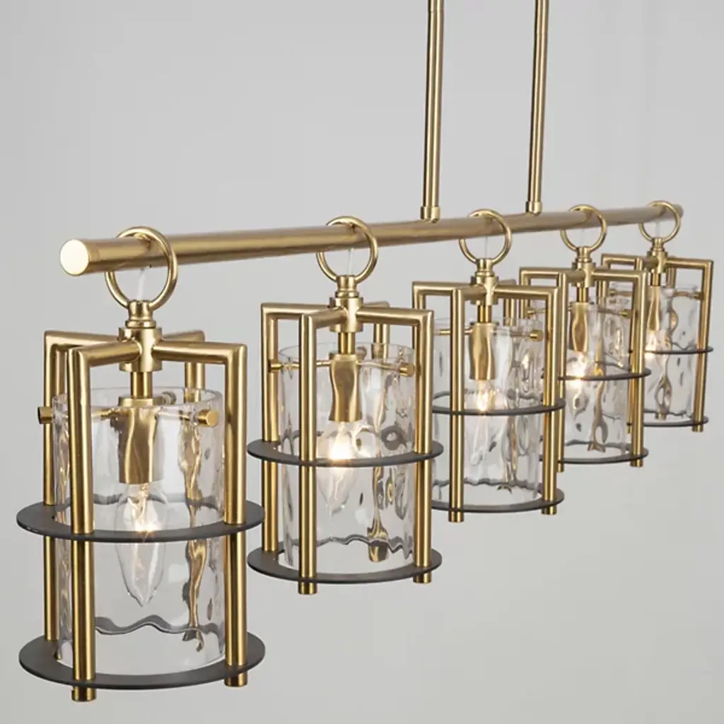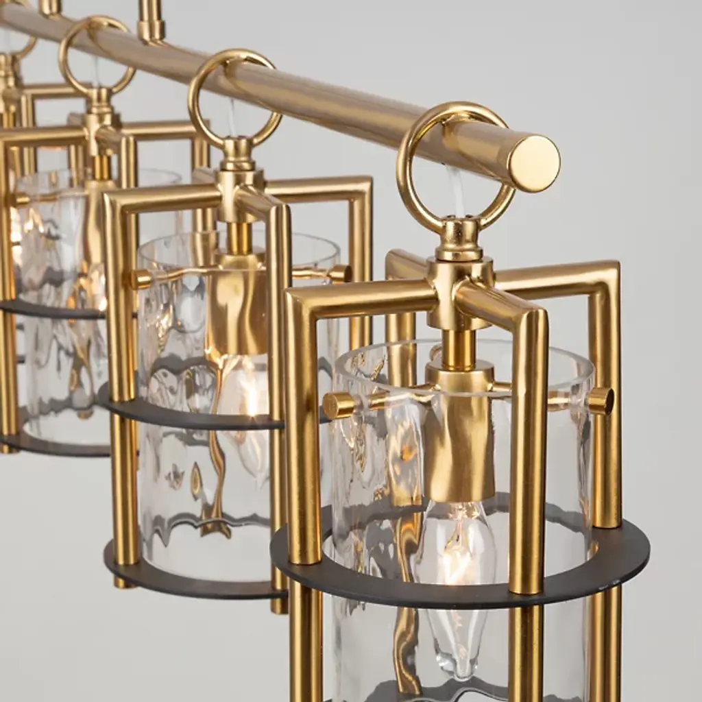 The Burford Linear Suspension from Artcraft embodies a captivating fusion of elegance and retro charm. This fixture epitomizes refined retro style, blending timeless appeal with modern sensibilities for a refined aesthetic. Suspended from slim downrods attached to a circular canopy via small anchors, the sleek metal frame is adorned with black rings around each lamp, providing a contemporary contrast to its vintage design elements. The thick, semi-transparent water glass shades obscure direct glare to transmit luxury and warmth, elevating each lantern light to the sophisticated focal points of any setting.