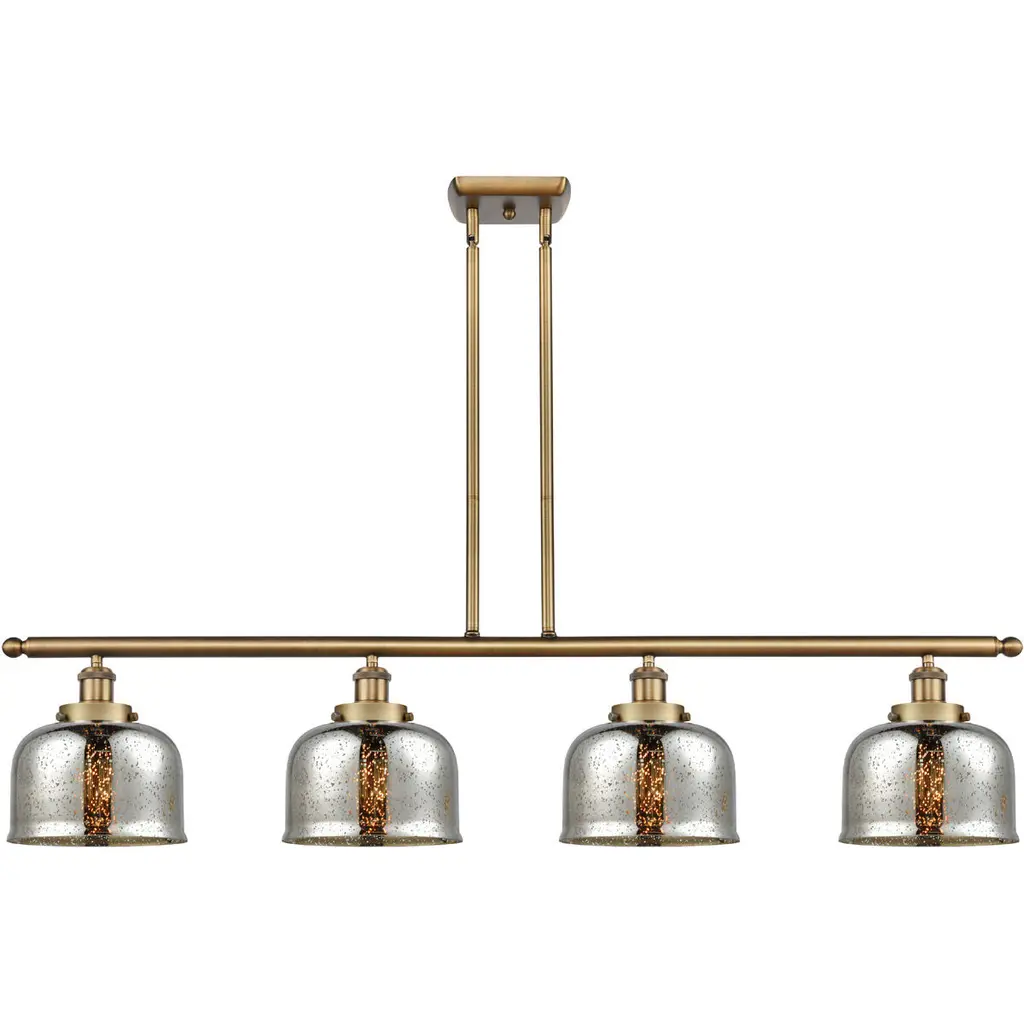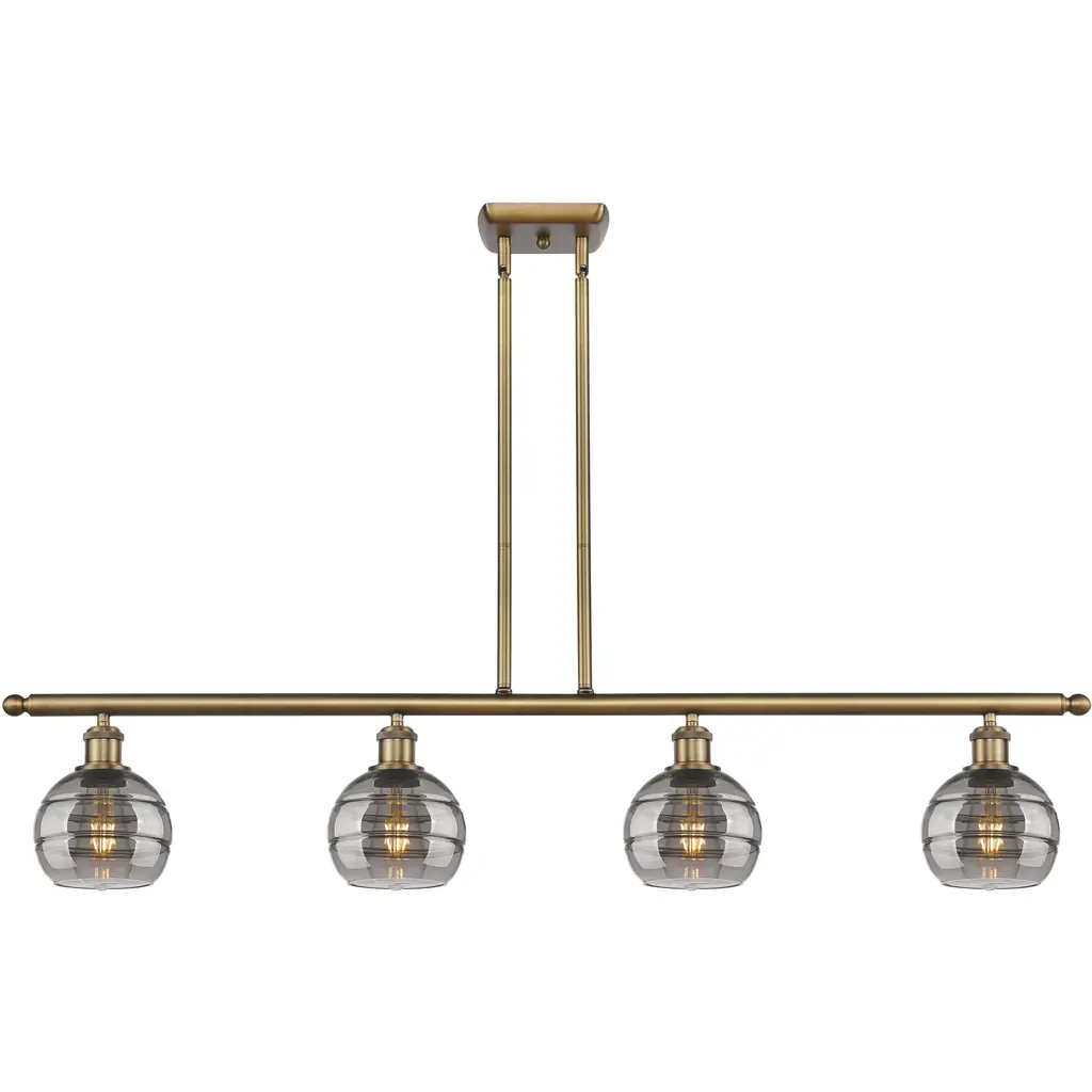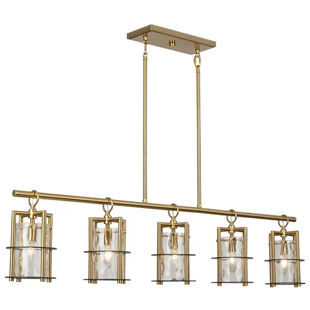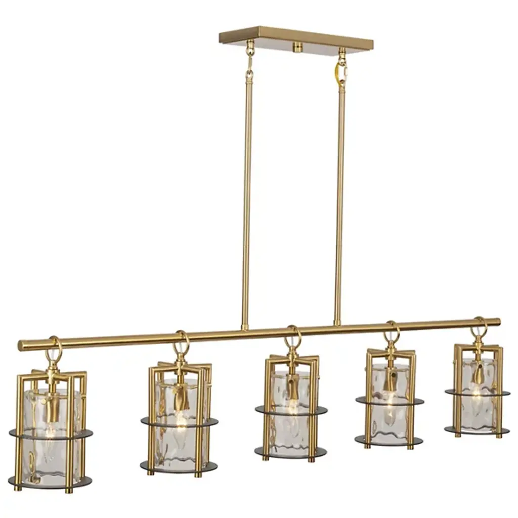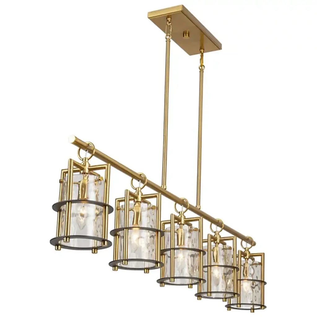 The Burford Linear Suspension from Artcraft embodies a captivating fusion of elegance and retro charm. This fixture epitomizes refined retro style, blending timeless appeal with modern sensibilities for a refined aesthetic. Suspended from slim downrods attached to a circular canopy via small anchors, the sleek metal frame is adorned with black rings around each lamp, providing a contemporary contrast to its vintage design elements. The thick, semi-transparent water glass shades obscure direct glare to transmit luxury and warmth, elevating each lantern light to the sophisticated focal points of any setting.