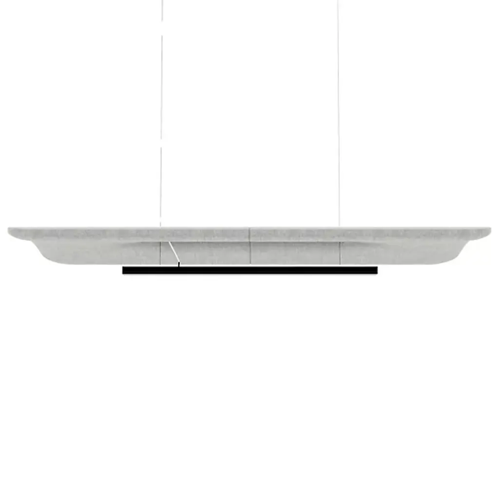 An island of tranquility and comfort. The BuzziZepp LED Linear Suspension from BuzziSpace makes a space feel distinct by trapping one’s conversations with sound absorption and washing the area below with a clean, uniform light source. Creator Alain Giles’s eye for social and interactive design solutions underscores this piece’s versatility in the open or intimate space. Giles solves the problem of the unwanted traveling of sounds with wide passes of acoustically-containing fabric. This fabric takes on a streamlined shape that appears to float in the air. A stripe of LEDs runs across the inside of the subtly concave shape. The LEDs turn on to create an even spread of clean illumination.