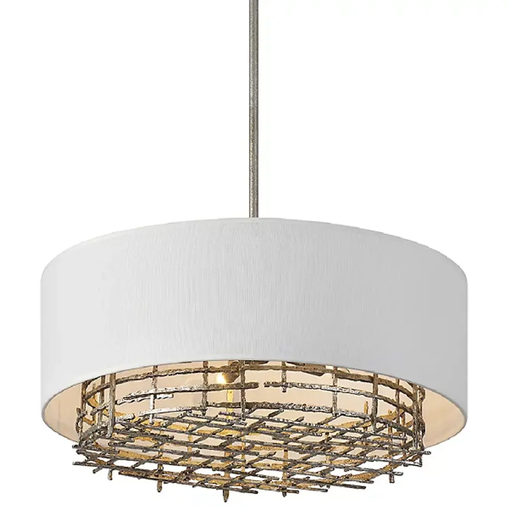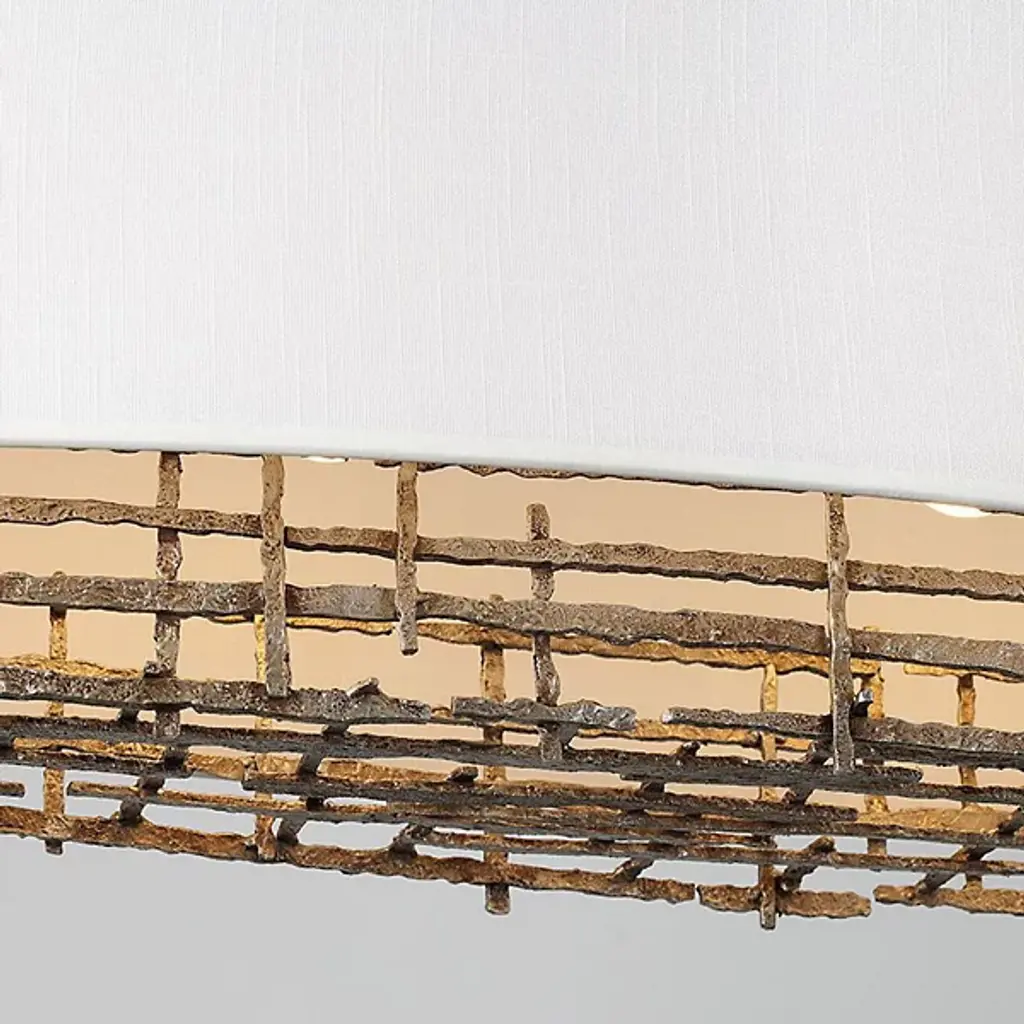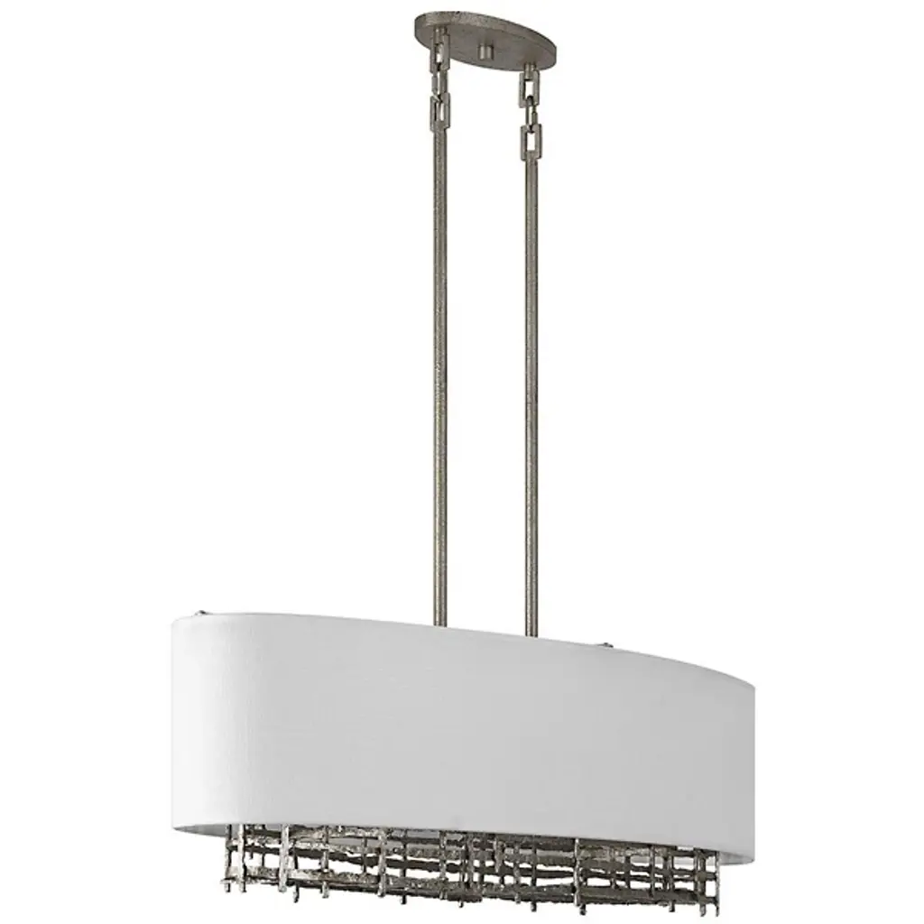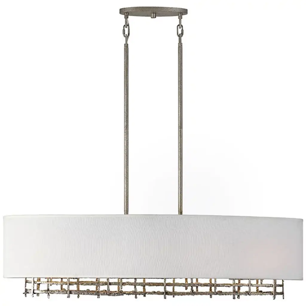 The Cameo Linear Suspension from Savoy House beautifully blends contrasts for a striking aesthetic. The soft white linen shade juxtaposed with rough, nature-inspired detailing finished in champagne luxe creates an intriguing harmony of textures and styles. This chandelier serves as a testament to the allure of opposites, making it a captivating focal point in any space. Illuminate your home with sophistication and elegance while embracing the beauty of diverse design elements united in perfect balance.
