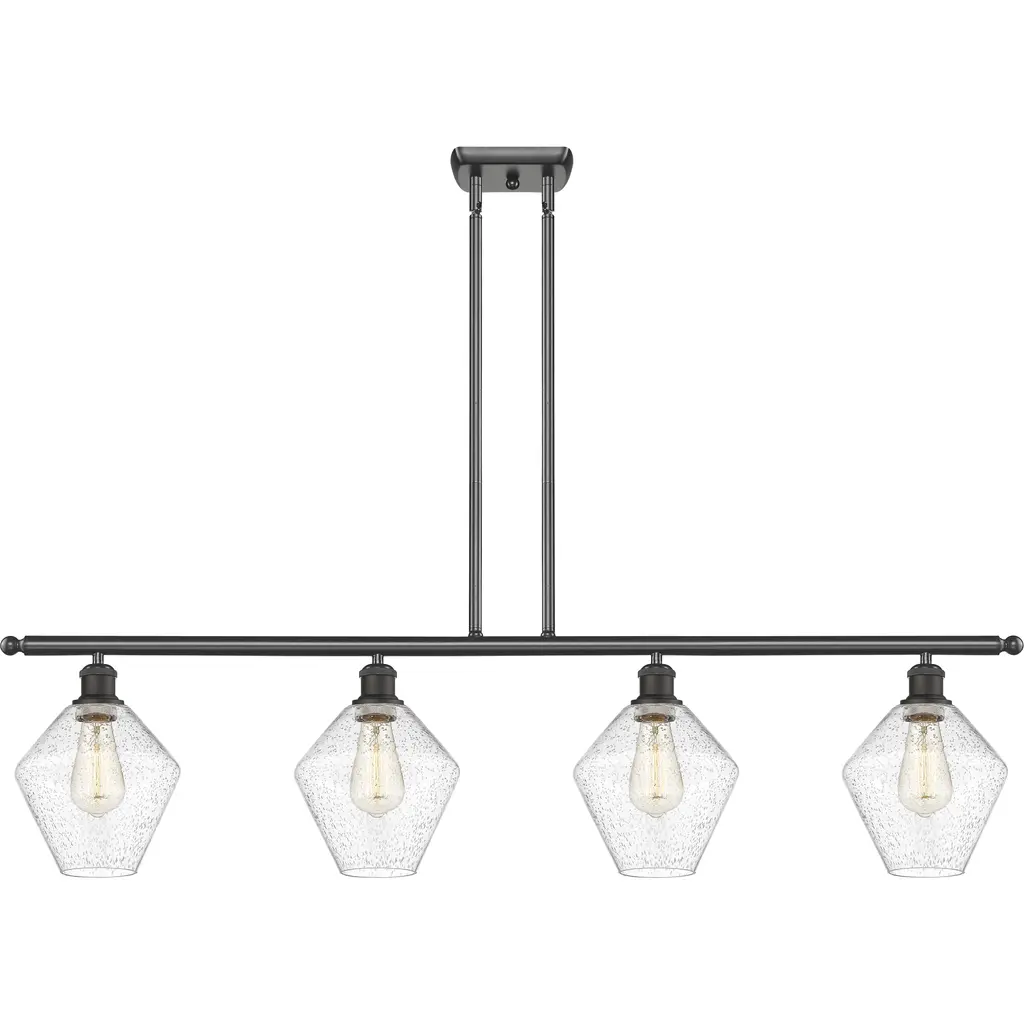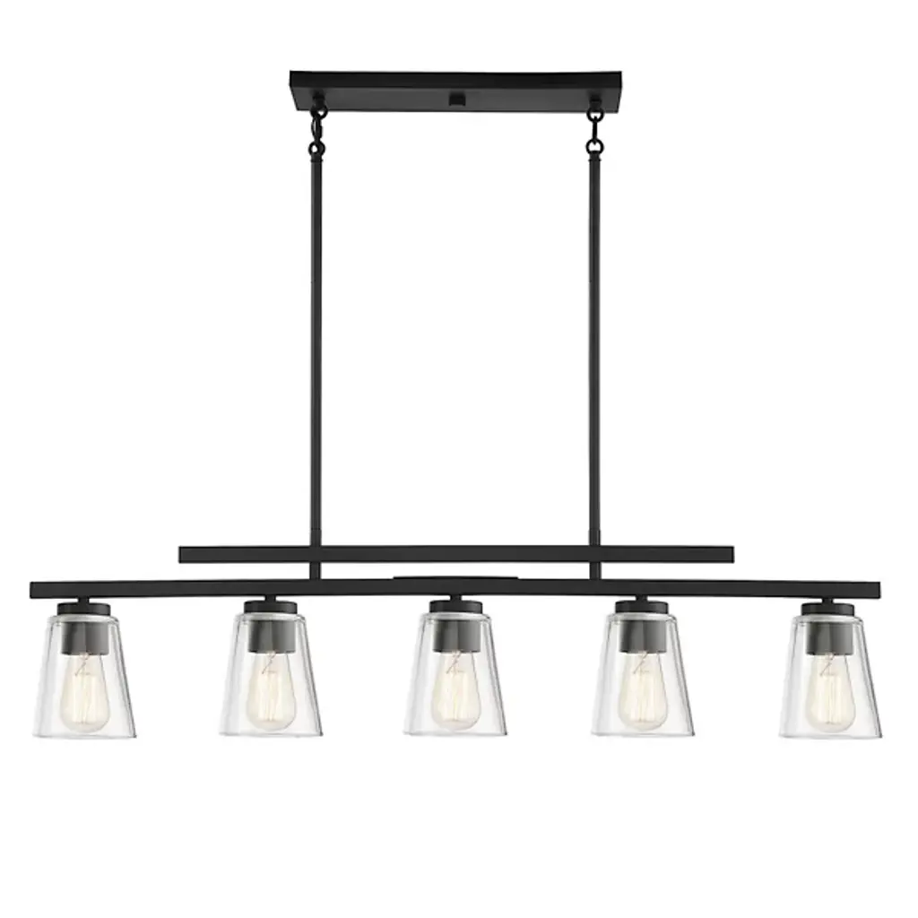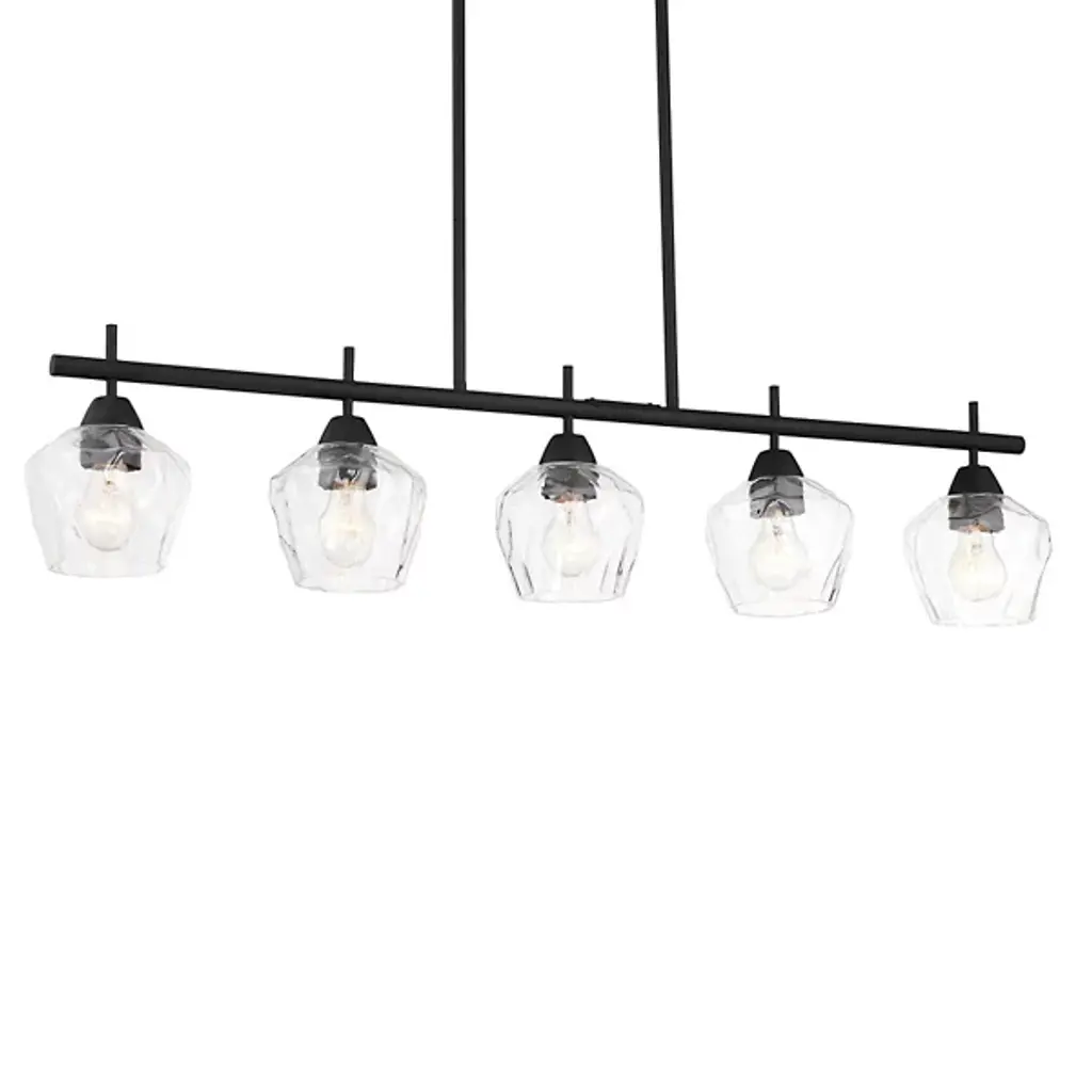 The Camrin Linear Suspension by Minka-Lavery is a contemporary addition to spaces. Suspended by a set of down rods and a single, linear bar, a collection of goblet-shaped glass shades are evenly spaced along the length of this design by simple stems that peek out above the horizontal line that supports them. Each glass shade has a dynamic, textural feel to it, giving this design a dimensional space for light to filter through, bringing an artful blend of form and function to rooms.
