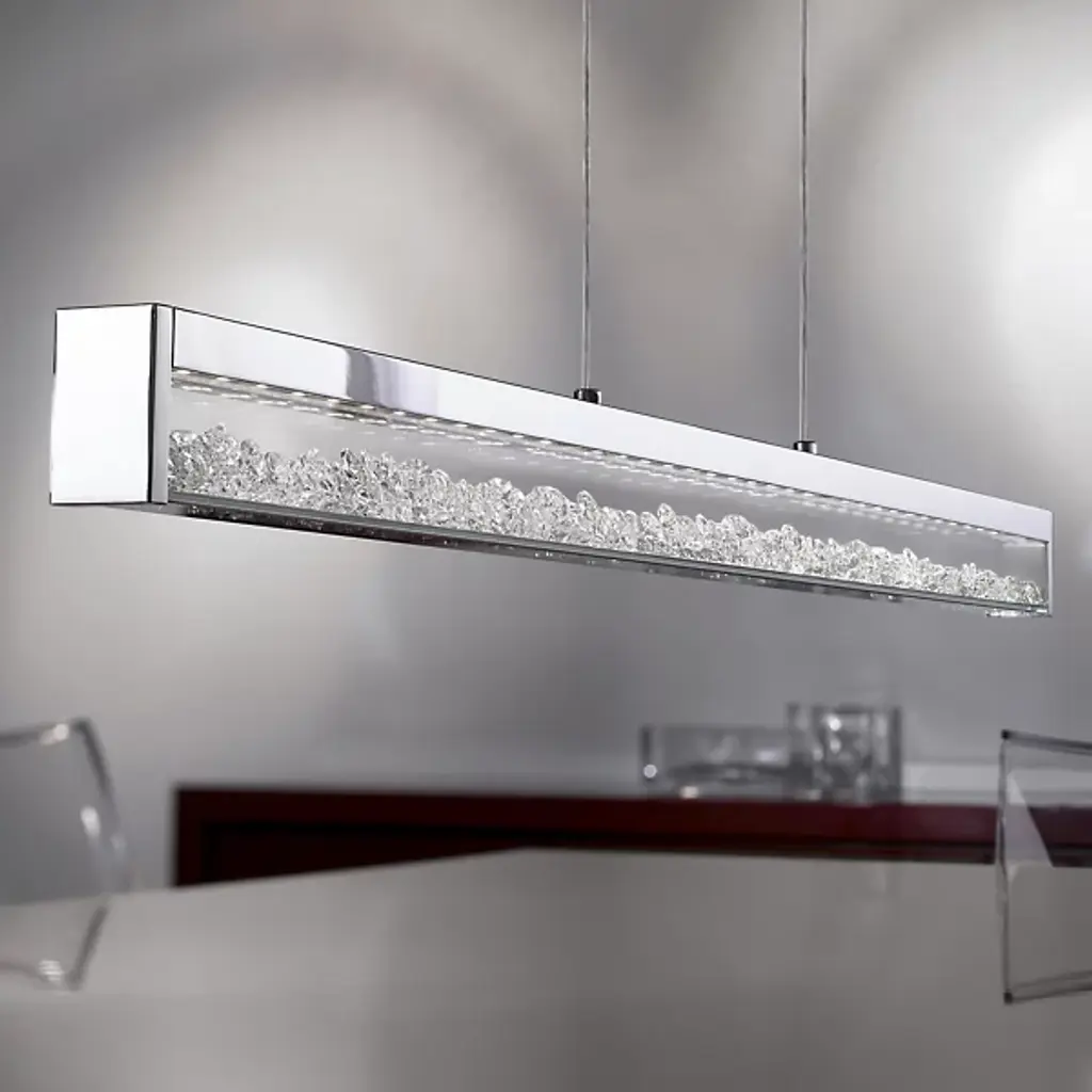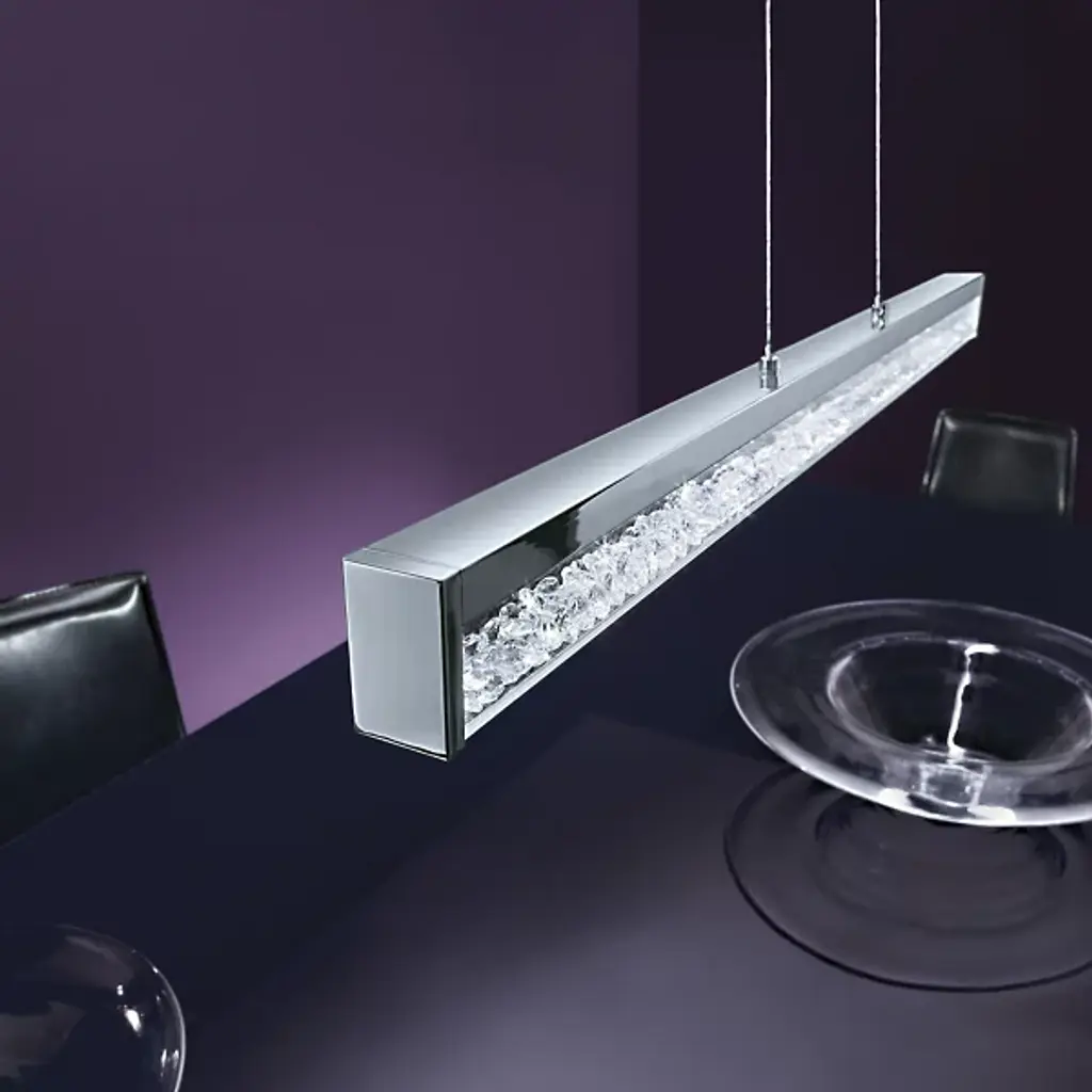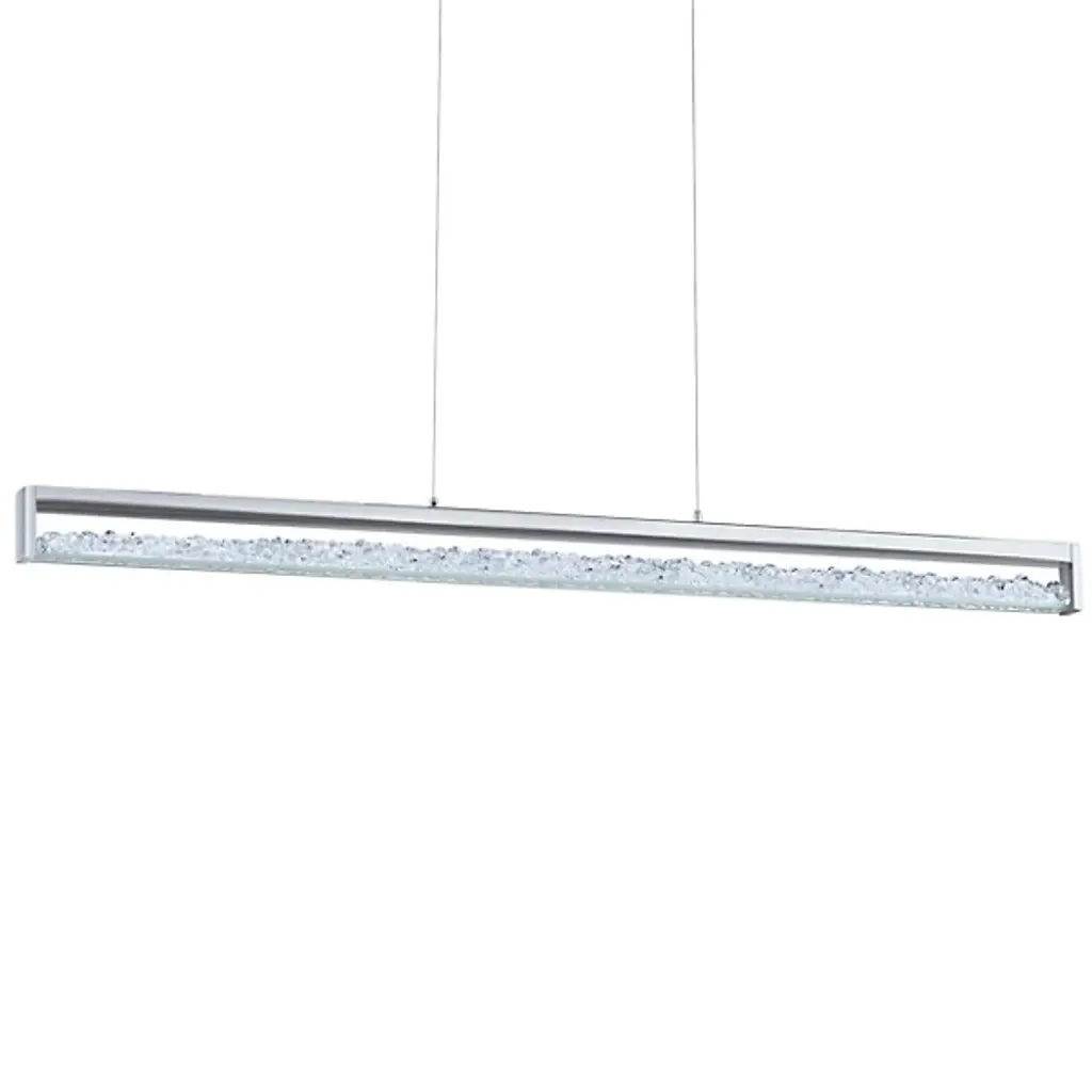 A dazzling addition to contemporary settings. The Eglo Cardito/Cardito 1 LED Linear Suspension features a rectangle of clear glass supported by a gleaming chromed metal frame. Inside the glass is a thick layer of numerous multi-faceted crystals, which grabs the energy efficient LED light from above and casts it outward in sparkling waves.