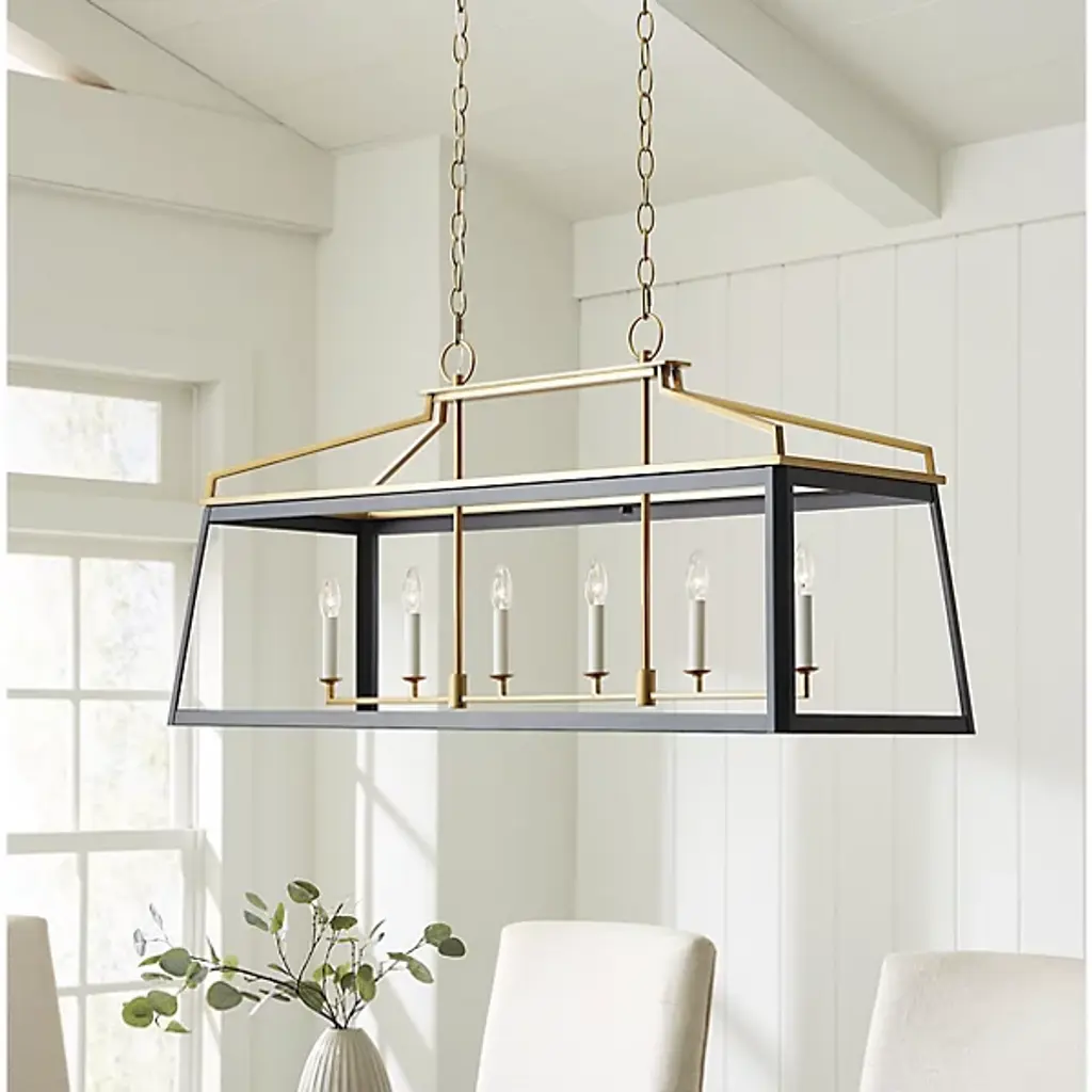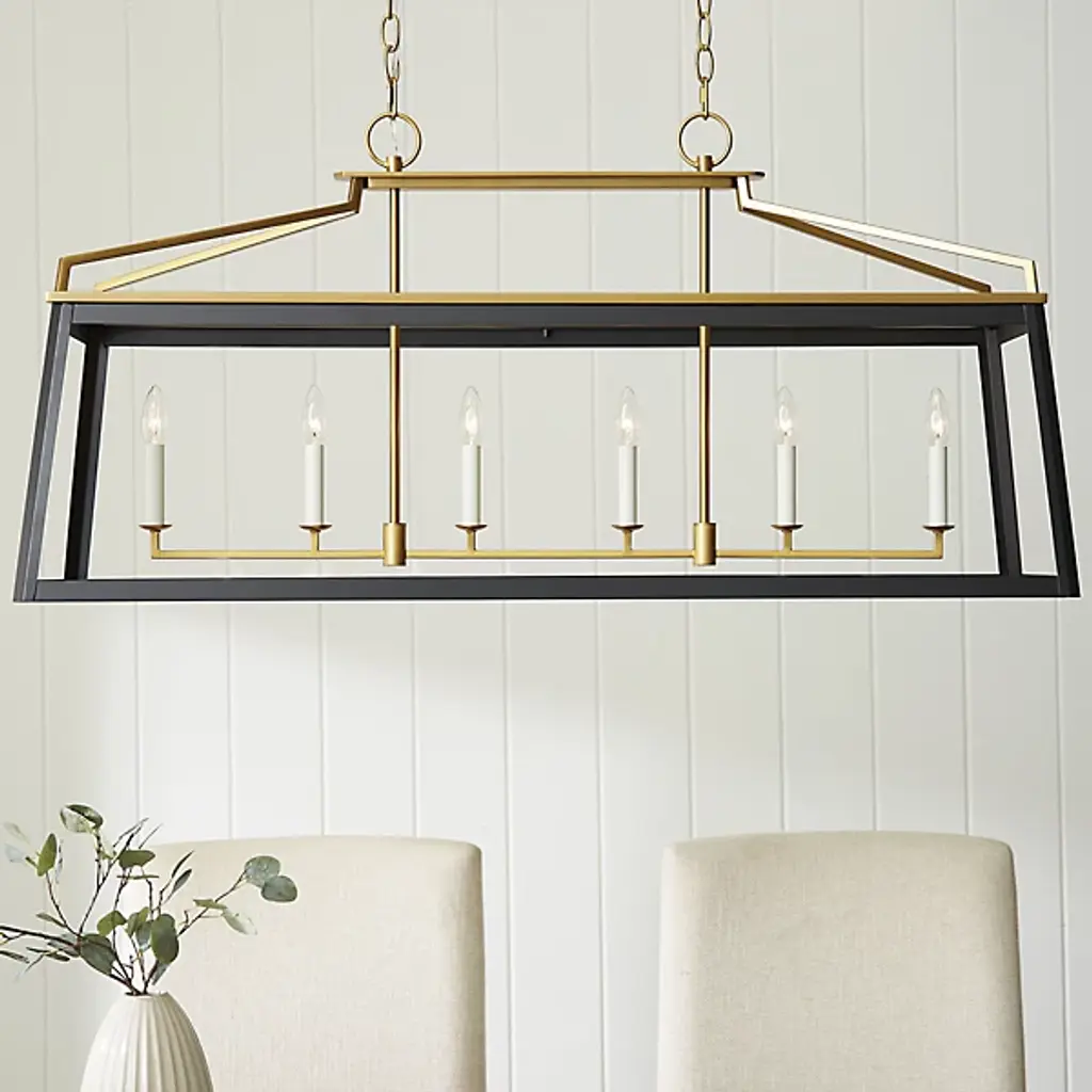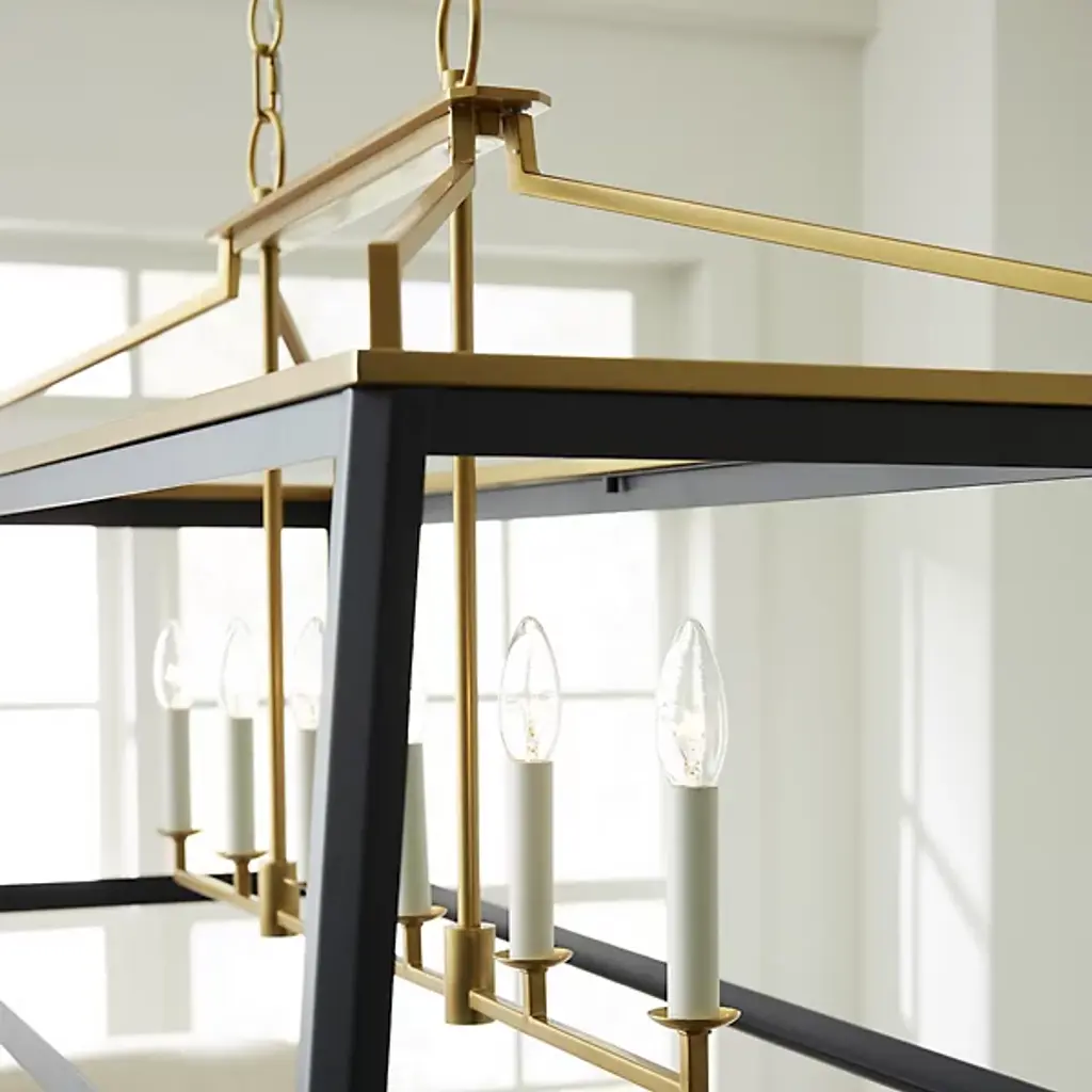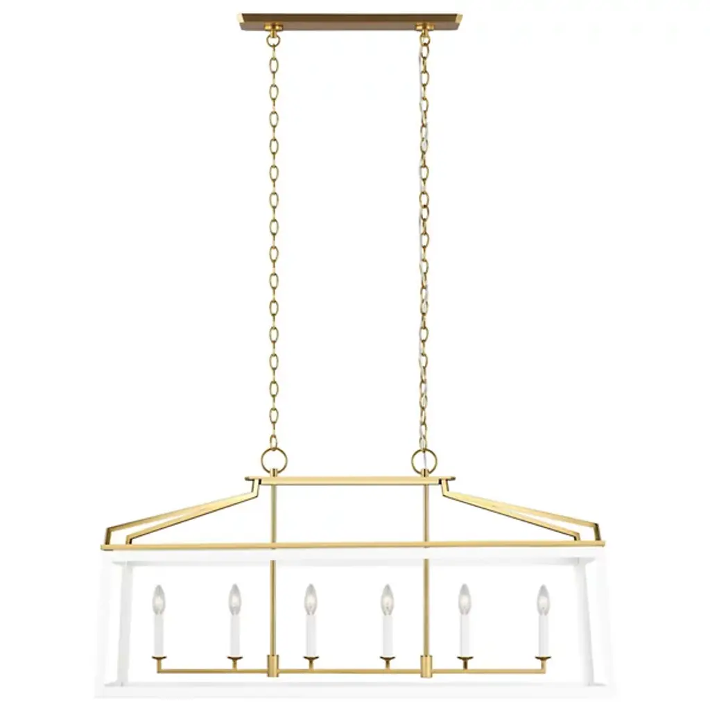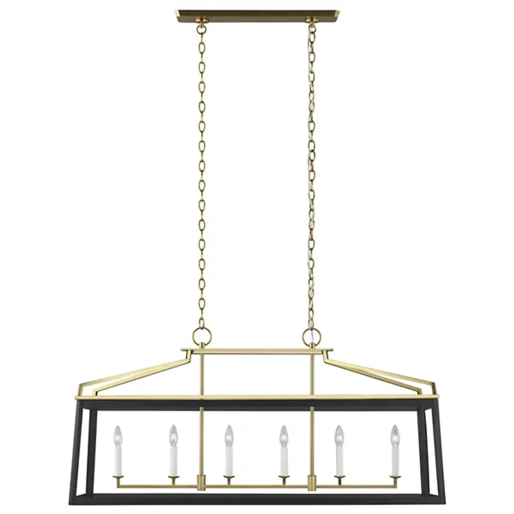 Open transitional style with an expansive reach and an enduring character. The Carlow Linear Suspension from Visual Comfort Studio, formerly known as Chapman & Myers, is ideal for suspensions over counters or tables in large open spaces, stretching down from a slim, rectangular canopy via a chain at either end that stretches down to a single finial that tops a short, slender downrod. A two-tone trapezoidal frame descends around the upright candelabra lamping held within, extending a bright, even wash of light in all directions.