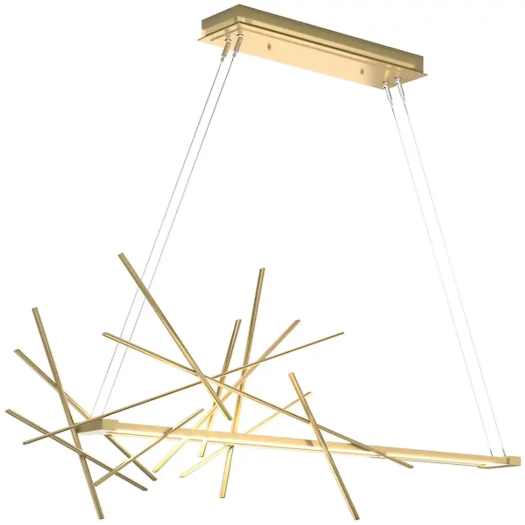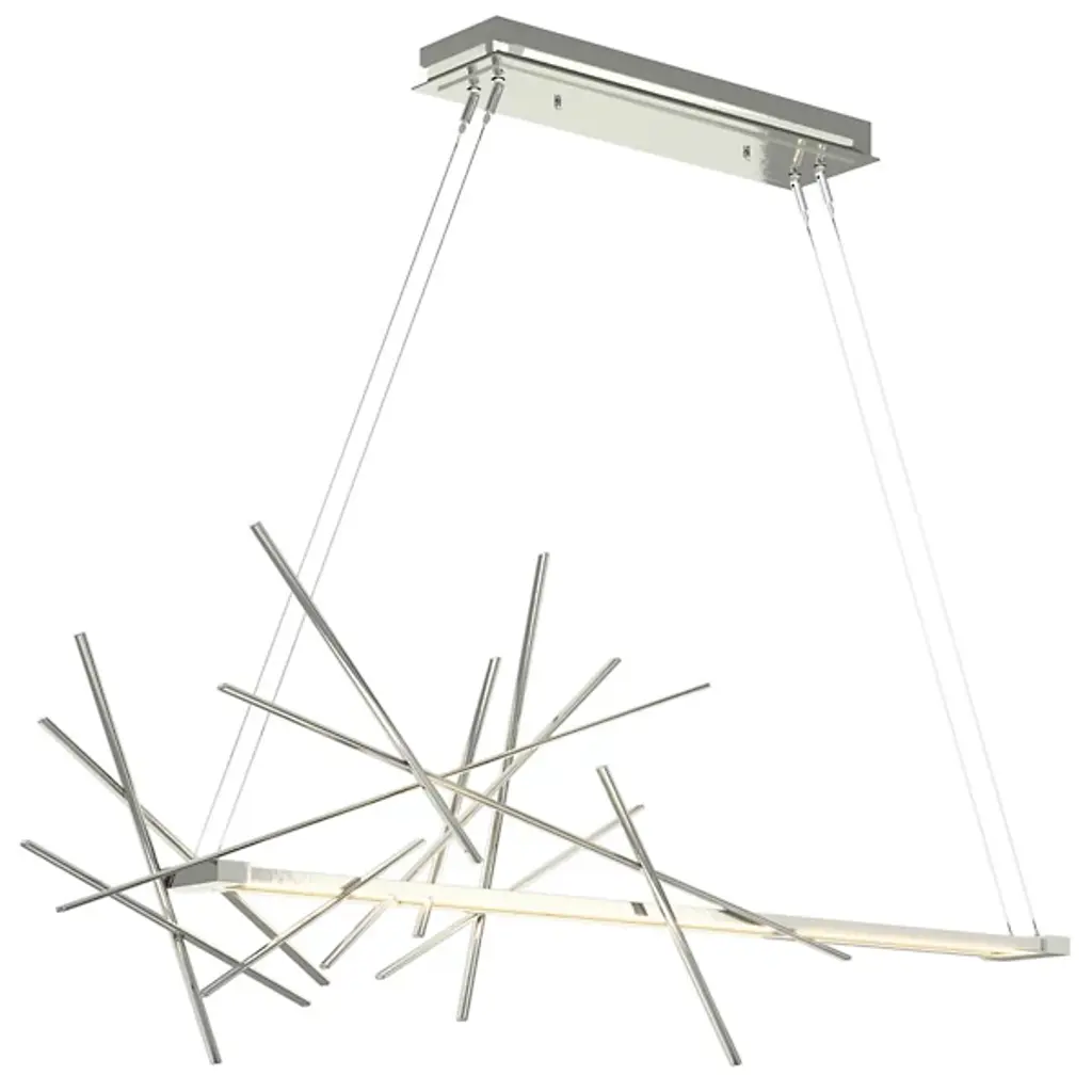 The Cascade LED Linear Suspension by Hubbardton Forge will bring design-minded style to the table (or island) while distributing significant light output both upward to the room and down to any subject below. Steel bars are randomly placed around the light source resulting in shadows that create contrast and light play. Dimmable with an ELV dimmer (not included).