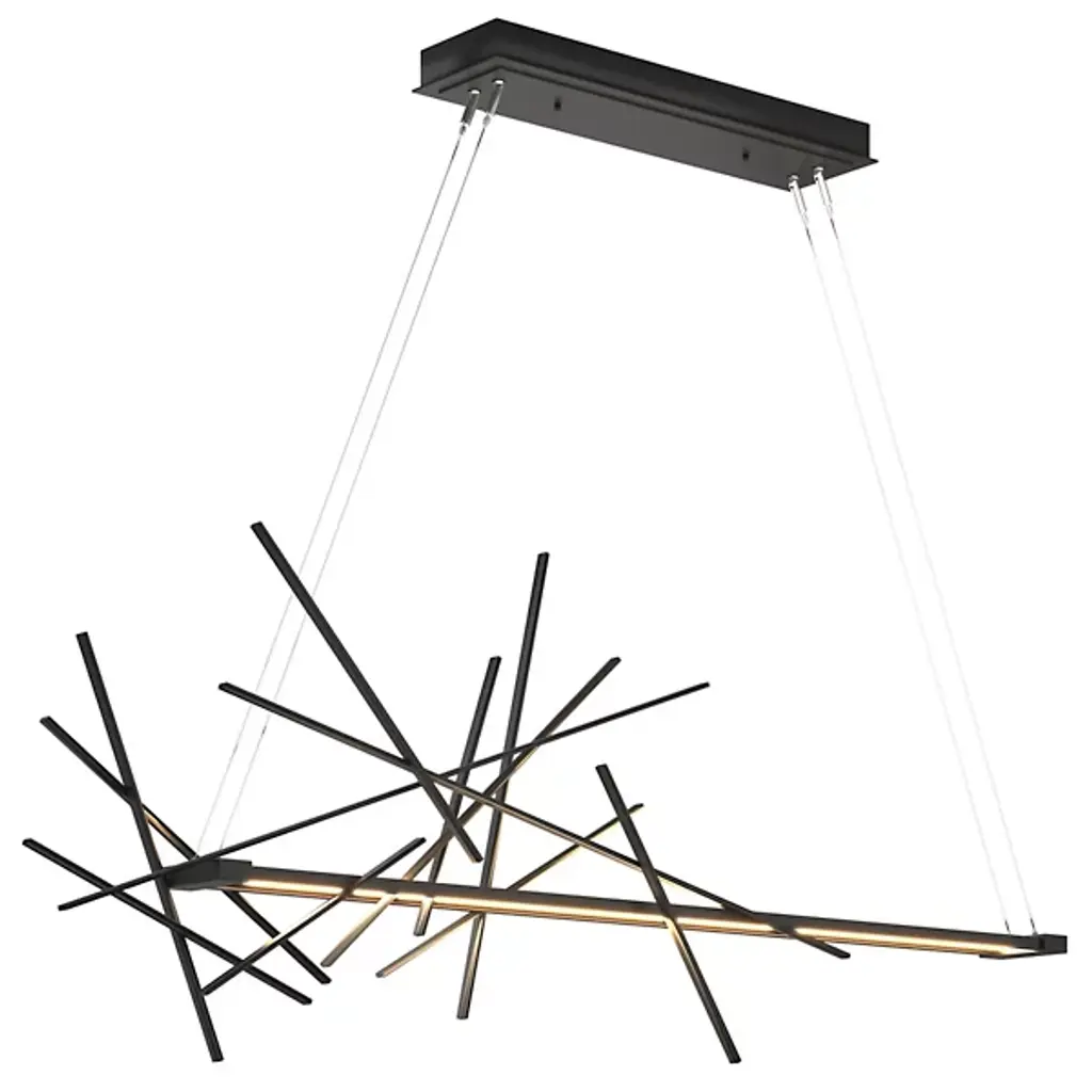 The Cascade LED Linear Suspension by Hubbardton Forge will bring design-minded style to the table (or island) while distributing significant light output both upward to the room and down to any subject below. Steel bars are randomly placed around the light source resulting in shadows that create contrast and light play. Dimmable with an ELV dimmer (not included).