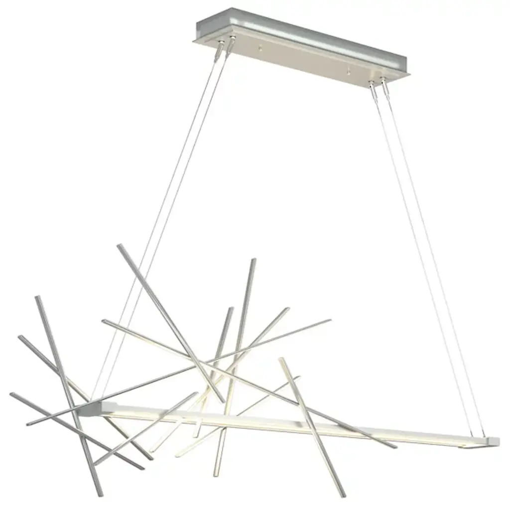 The Cascade LED Linear Suspension by Hubbardton Forge will bring design-minded style to the table (or island) while distributing significant light output both upward to the room and down to any subject below. Steel bars are randomly placed around the light source resulting in shadows that create contrast and light play. Dimmable with an ELV dimmer (not included).