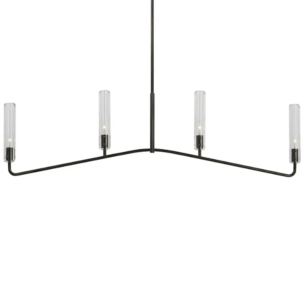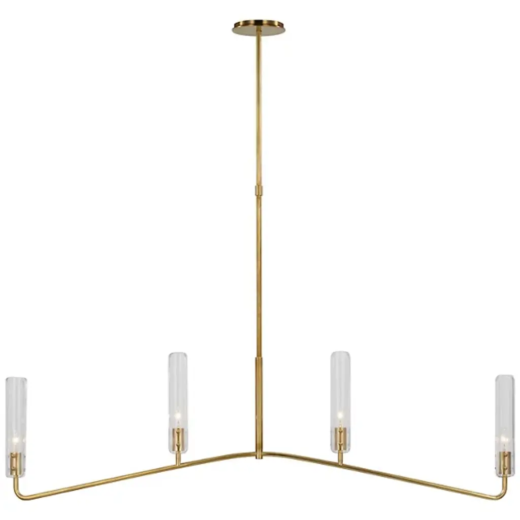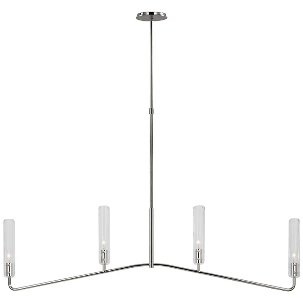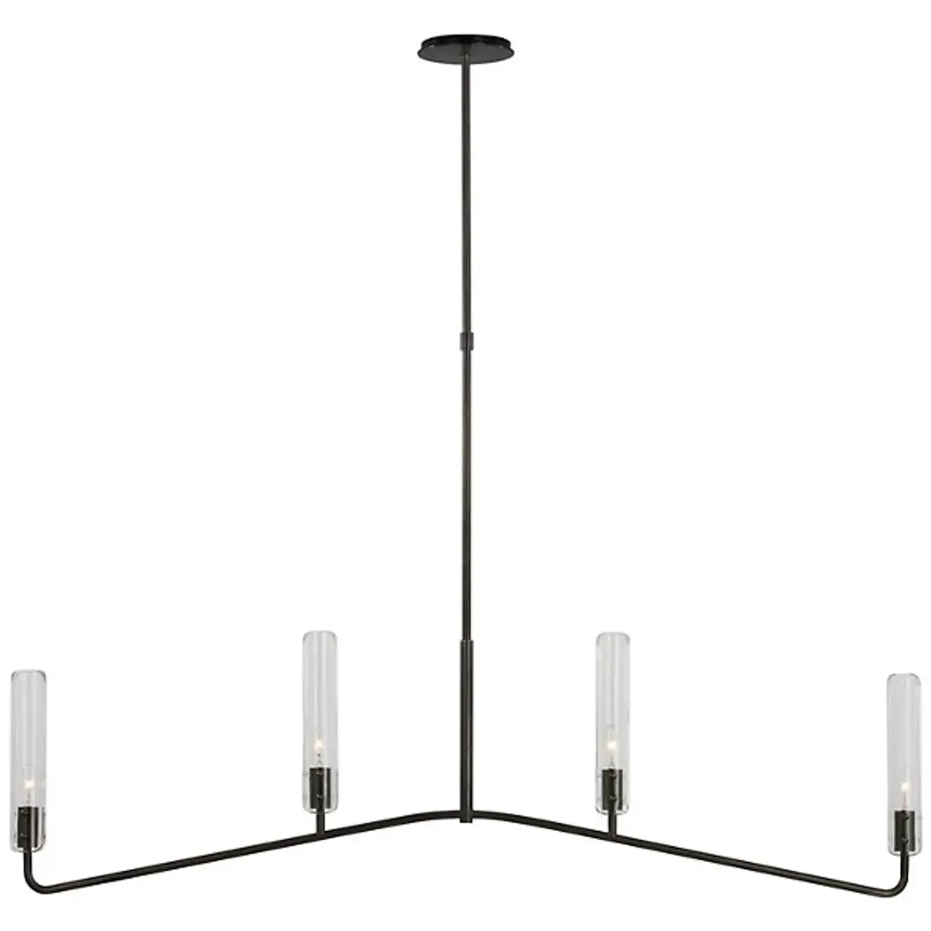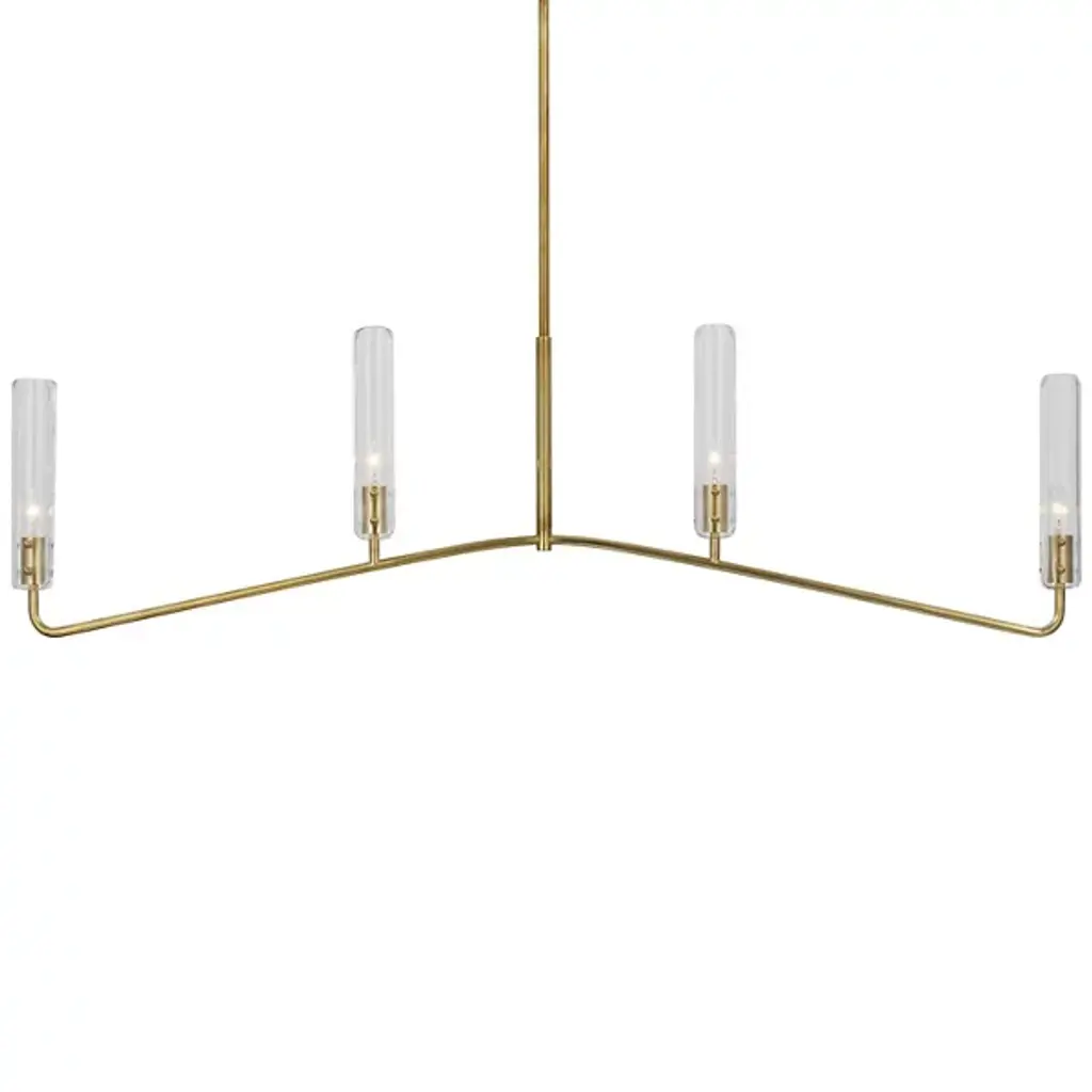 The Casoria Linear Suspension from Visual Comfort Signature offers unexpected mid-century modern sculptural flair. Contemporary, angular designs consist of elongated glass shades and linear frames. This chandelier, designed by AERIN, will become the focal point of hallways or great rooms alike. Adjust the brightness level of the LEDs with an ELV Dimmer.