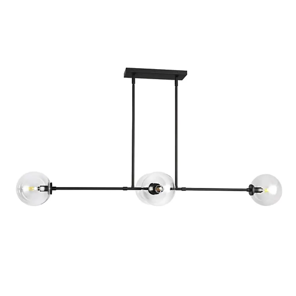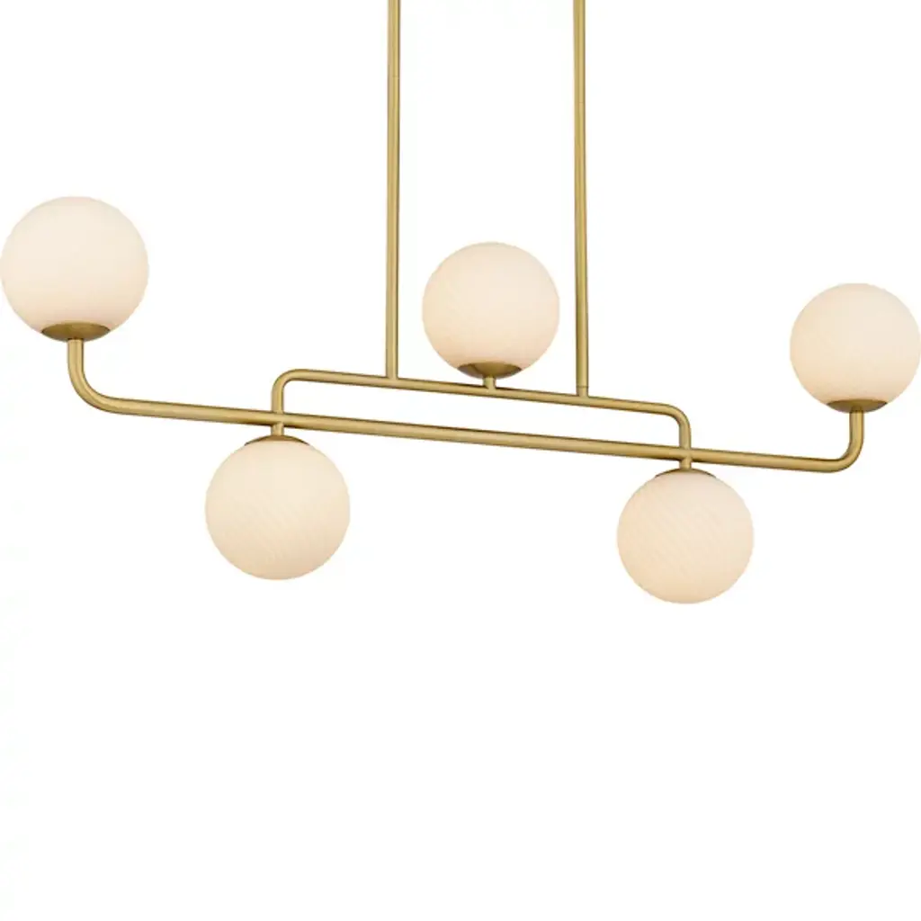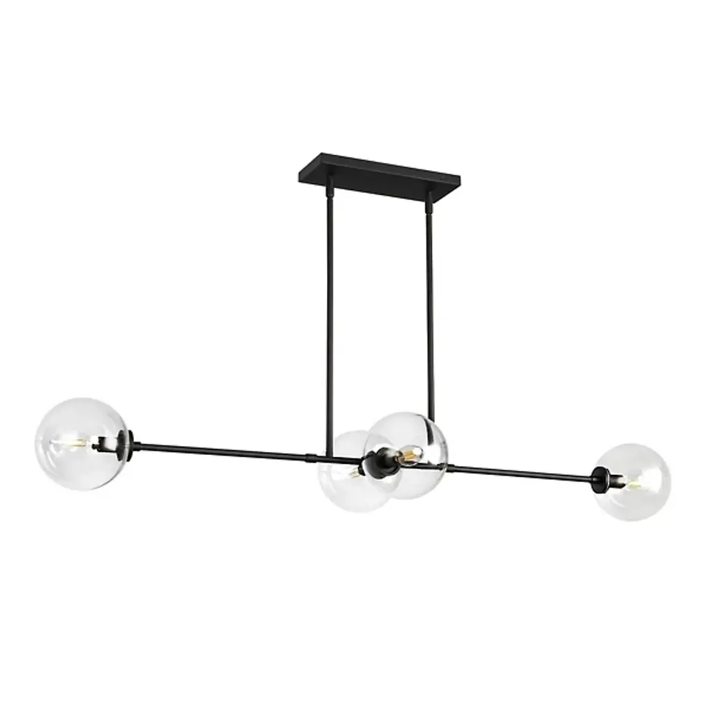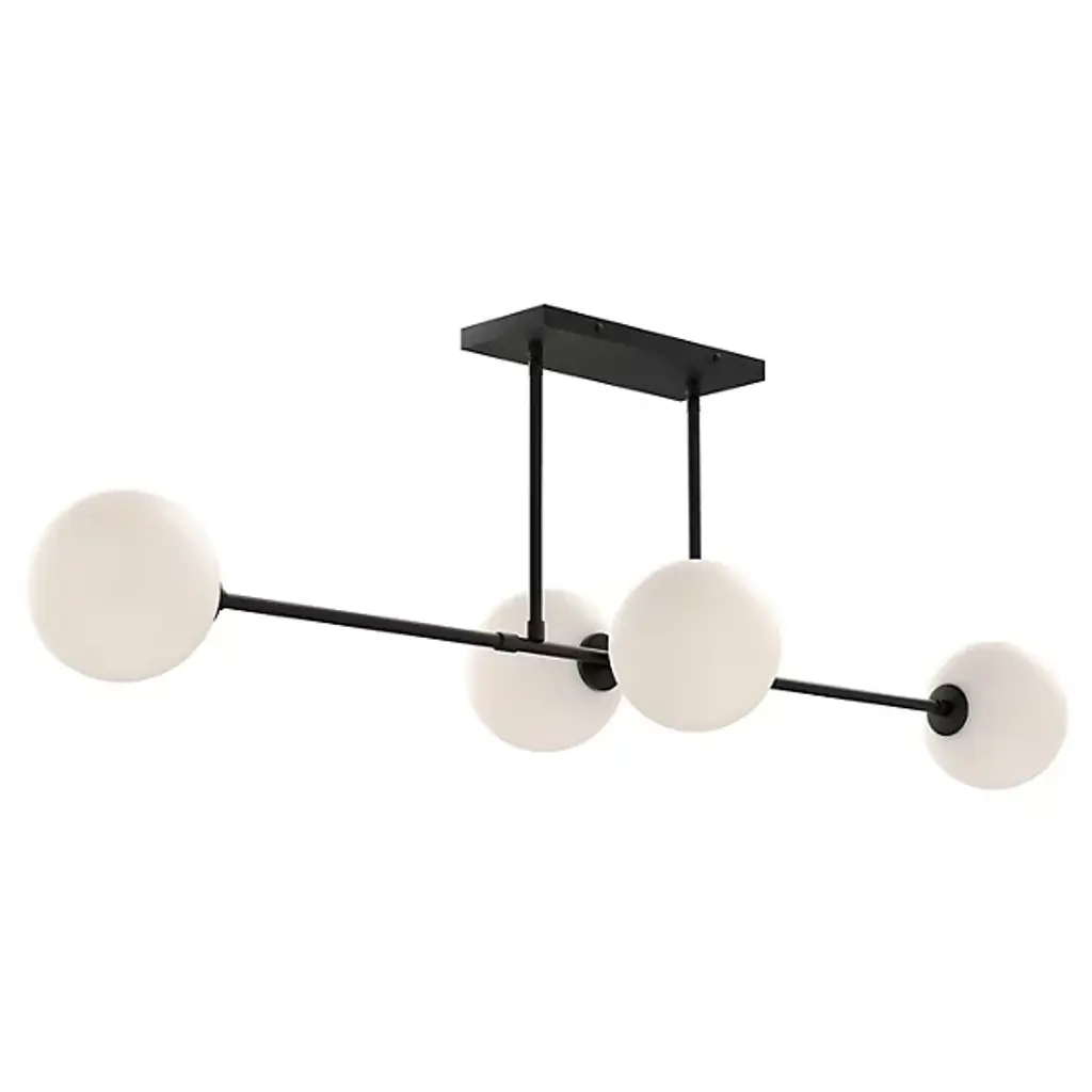 Smooth, architectural, and elegantly open. The Cassia Linear Suspension from Alora Mood restores a restrained, mid-century elegance to high-ceilinged inside spaces. A low-profile rectangle canopy secures the fixture, dispatching parallel downrods to a slender stem horizontally held between them. Each end of the stem blooms an opal glass sphere around a candelabra lamp, offset by similar lamps suspended across its central point in closer proximity, dispensing a generous glow below the fixture.