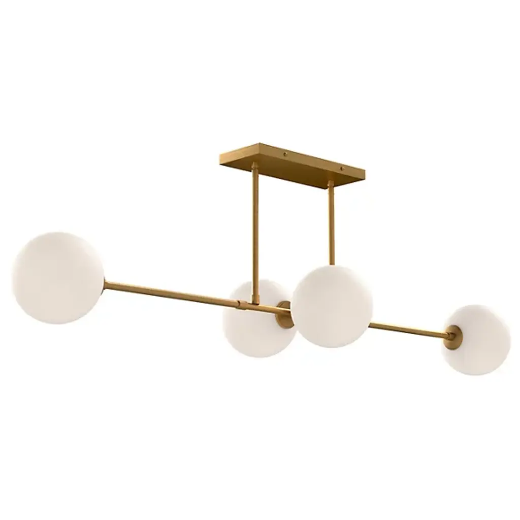 Smooth, architectural, and elegantly open. The Cassia Linear Suspension from Alora Mood restores a restrained, mid-century elegance to high-ceilinged inside spaces. A low-profile rectangle canopy secures the fixture, dispatching parallel downrods to a slender stem horizontally held between them. Each end of the stem blooms an opal glass sphere around a candelabra lamp, offset by similar lamps suspended across its central point in closer proximity, dispensing a generous glow below the fixture.