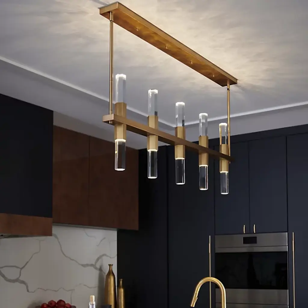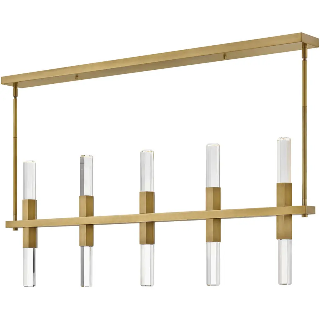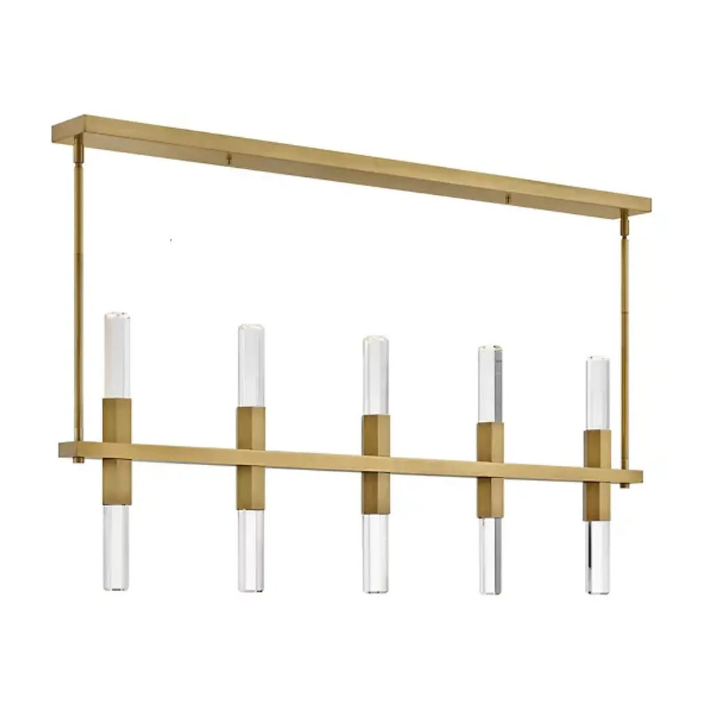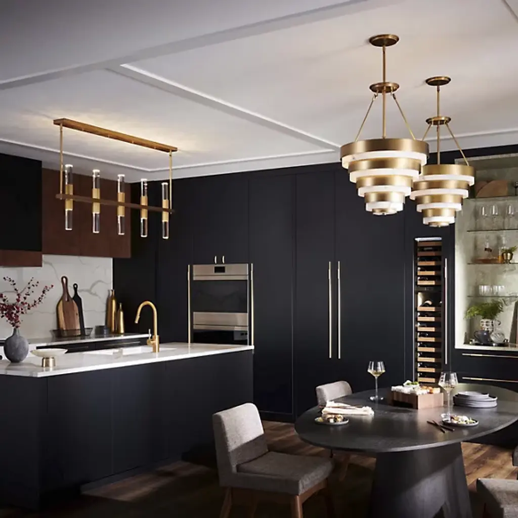 A handsome lineup of inviting light rods. The Cecily LED Linear Suspension from Fredrick Ramond tightens up the room’s modern aesthetic while opening up the space overhead as a low-profile design. The piece references mid-century modern design in its glass and metal combo, as well as its bold finish. It mirrors the long format of a kitchen island or dining table’s surface through its hanging horizontal rod. A group of faceted lamp holders line up across the rod, enhancing the piece’s uplifting verticality. The clear glass rods on either end of the holders also share a faceted form. The facets produce crisp highlights and help distribute a uniform aura of illumination.