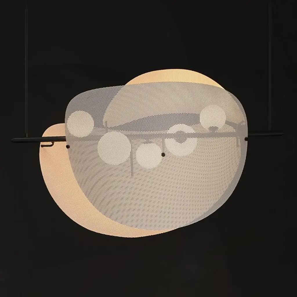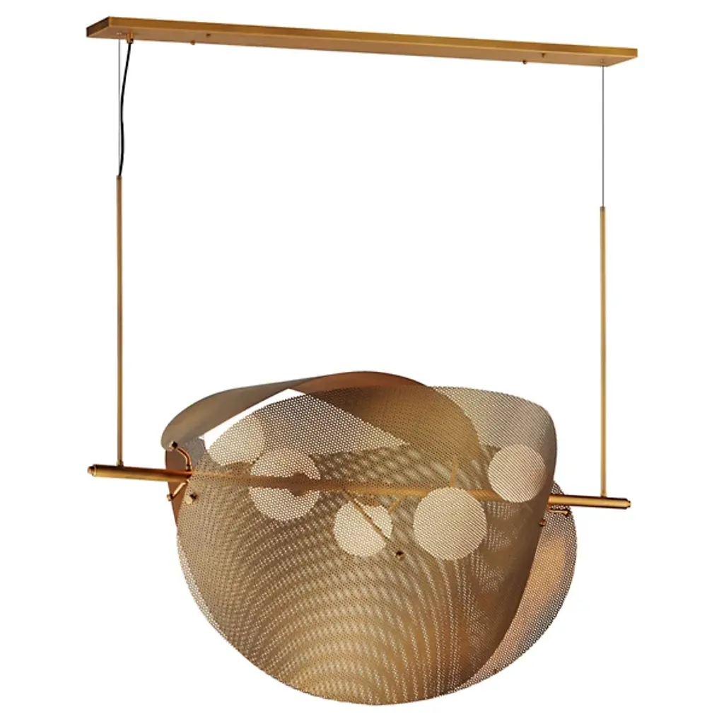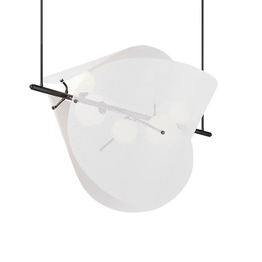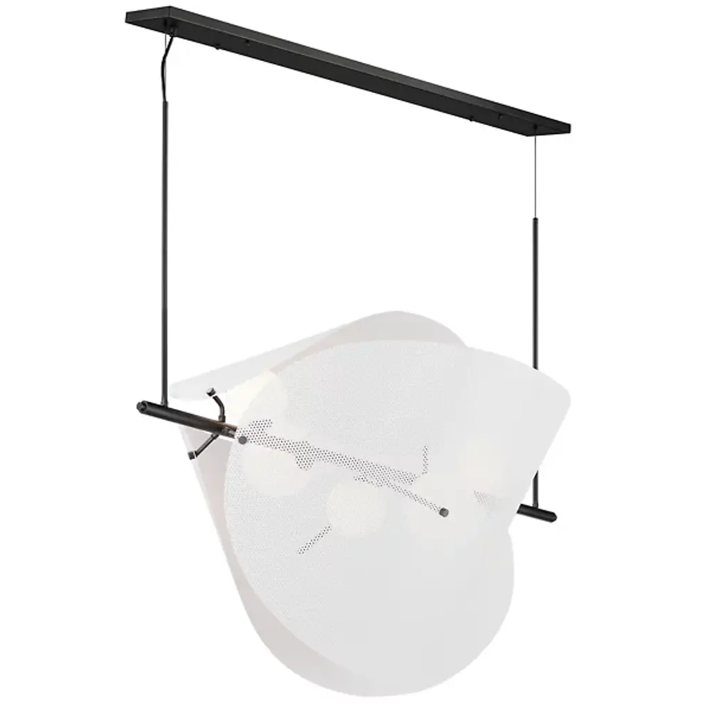The Chips Linear Suspension from Studio M merges pop art influences with functional design, featuring thinly curved panels of perforated metal shades. LED globes of Satin White glass dot the suspended chip-like sculptures, casting light at various positions along their span. The panels, voluminous yet airy in their translucence, draw inspiration from sculpture. Named comically to reflect Mat Sanders' design personality, the Chips collection includes large-scale pendants, single pendants, and wall sconces. Mix finishes to craft an illuminated art piece that complements your space.