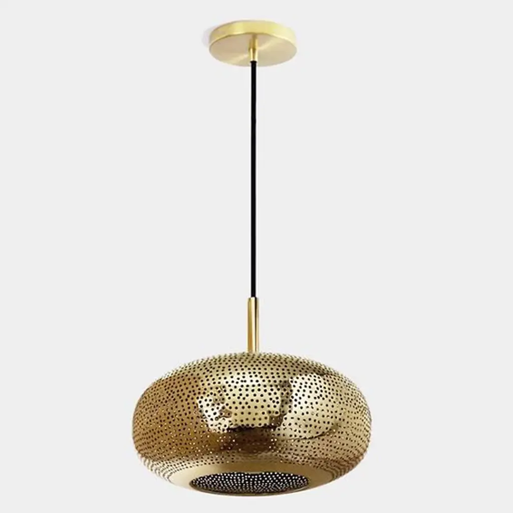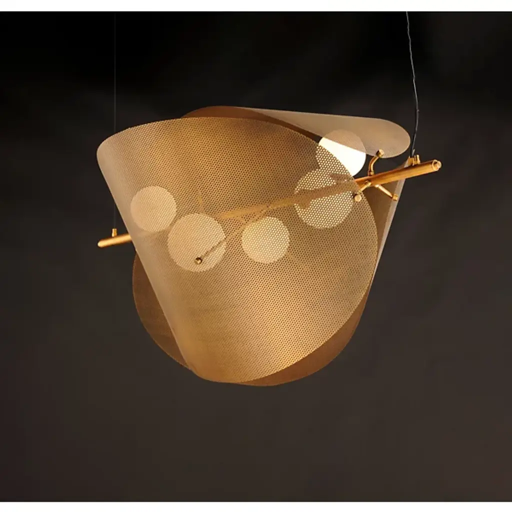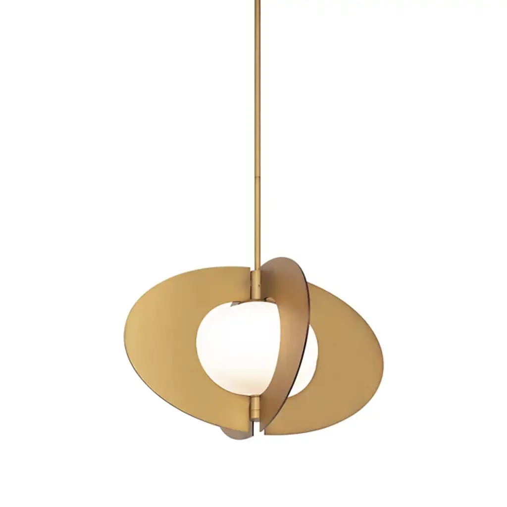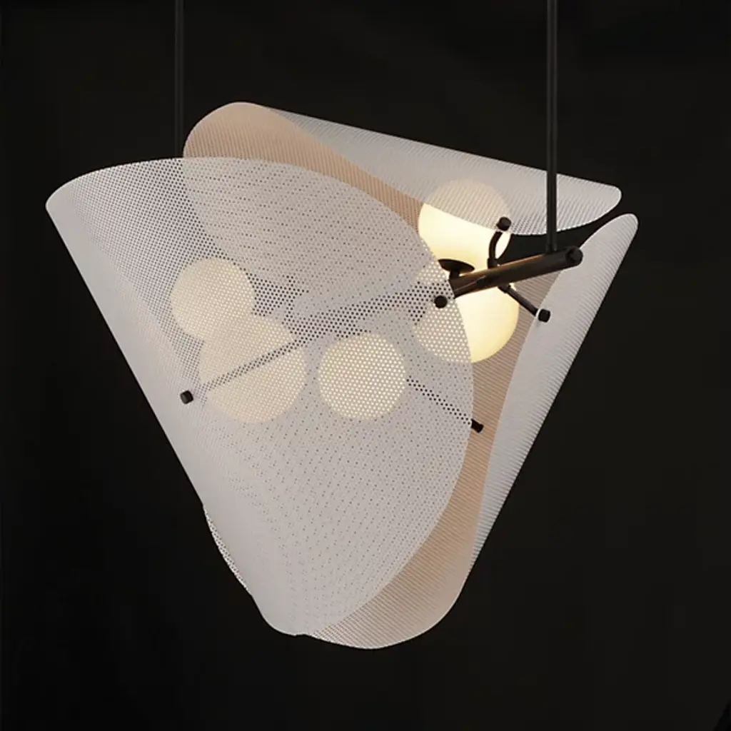 The Chips Linear Suspension from Studio M merges pop art influences with functional design, featuring thinly curved panels of perforated metal shades. LED globes of Satin White glass dot the suspended chip-like sculptures, casting light at various positions along their span. The panels, voluminous yet airy in their translucence, draw inspiration from sculpture. Named comically to reflect Mat Sanders' design personality, the Chips collection includes large-scale pendants, single pendants, and wall sconces. Mix finishes to craft an illuminated art piece that complements your space.