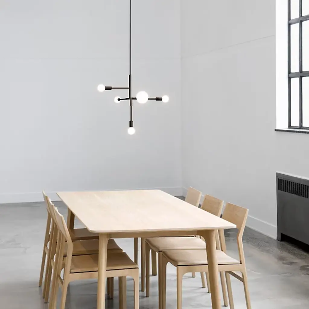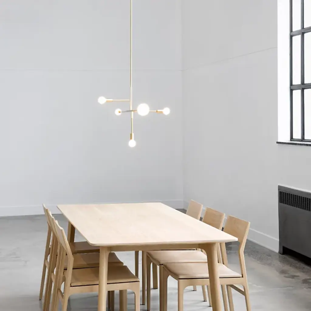 Sleek and sophisticated. Complement your room's refined aesthetic and lively personality with the clean geometric light sources of the Cliff 01 Linear Suspension from Lambert & Fils. It's a piece by Samuel Lambert, a designer whose work explores the many shapes of light. With an eye for craftsmanship and rich materials, artisans in Montreal fabricate the structure using classic brass. The elegant material gets a neat silhouette as it moves in sharp angles. Slender arms branch out from the crossbar, giving the piece a sculptural quality. Made from milk glass, eye-catching globe shades cap off the piece with a contrast in color and soft shape. The globes mellow the brilliant LED light from inside, so you receive a clean, spacious, and soft aura of illumination.