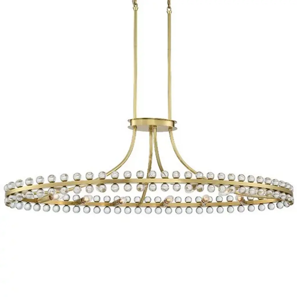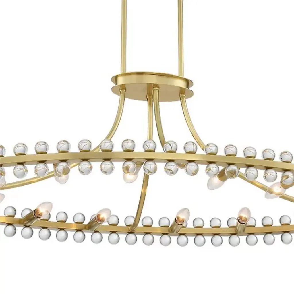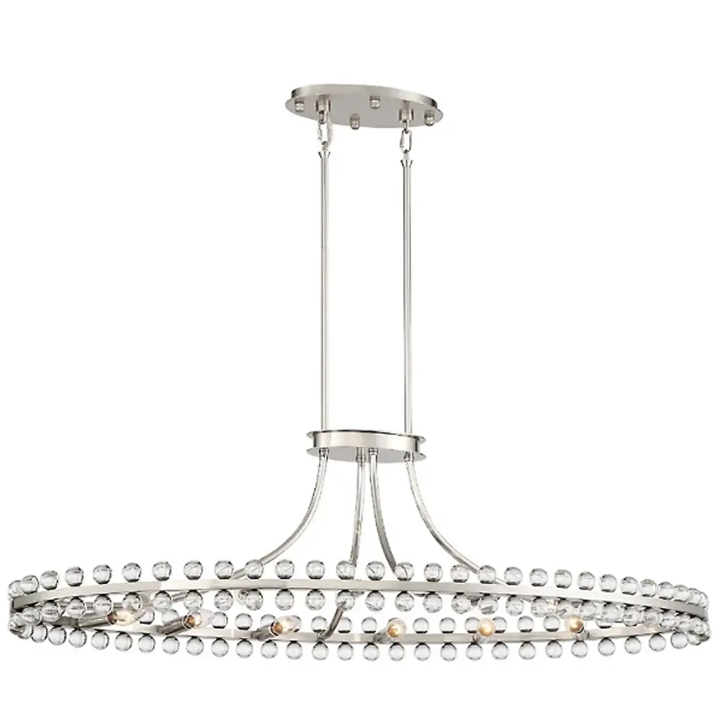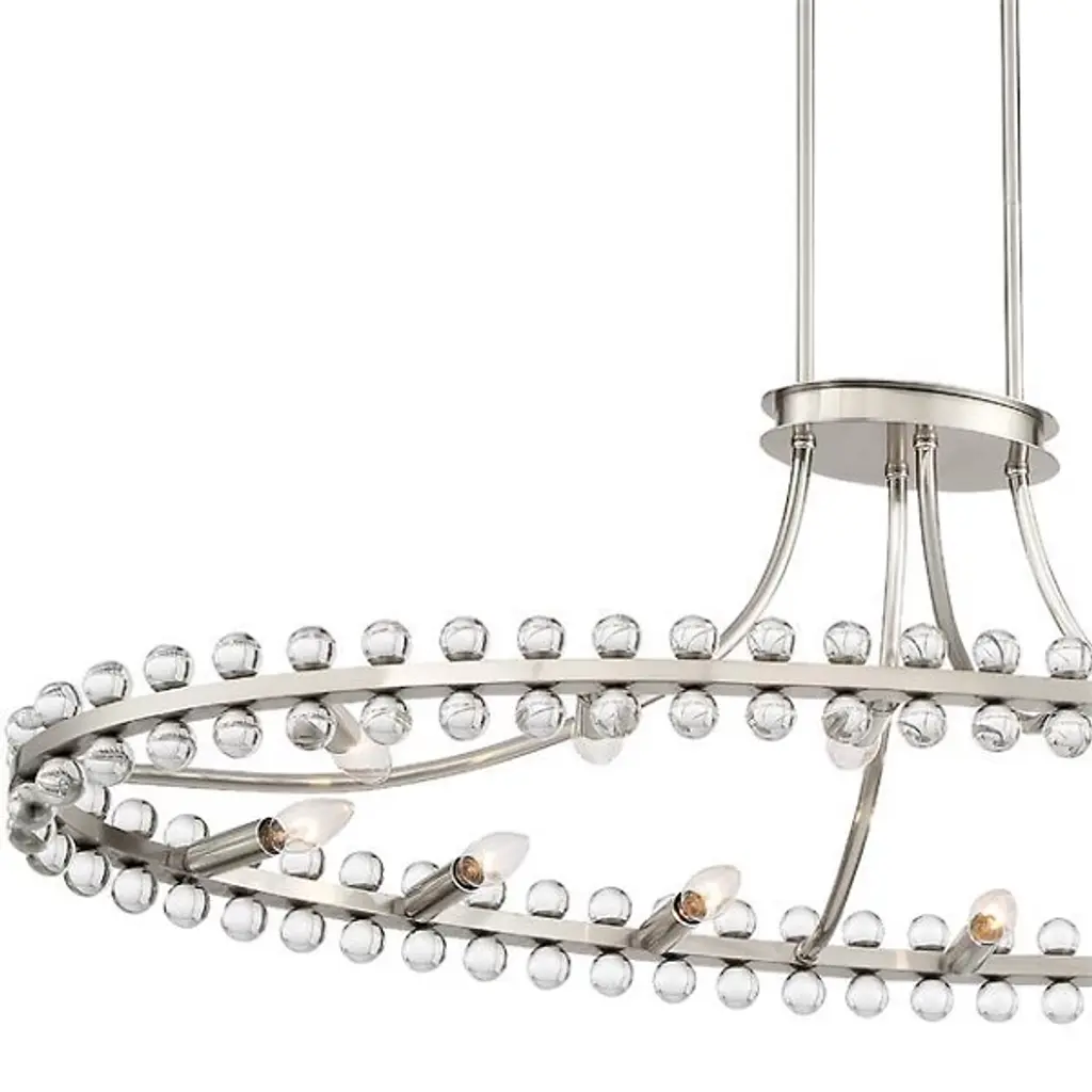 Take command of your large indoor spaces with the tasteful transitional stylings of the Clover Linear Suspension from Crystorama. Made from steel, a stepped oval canopy anchors the fixture, using two parallel downrods to suspend a smaller oval hub below it. This lower hub then sends out four arcing rods to a large, open oval frame that features crystal spheres in an orderly progression nested evenly around its upper and lower surfaces, while open, candelabra-style lamping marches around the oval’s interior. This arrangement blunts direct glare from the sides and immerses its surroundings in bright light that sparkles off each crystal accent for a glorious corona of light.