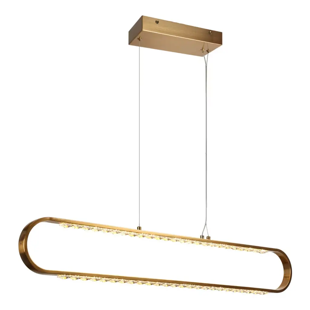 A wave of graceful light accompanies a slick, airy construction in the Cosmo LED Linear Suspension Light from Huxe. The eye-catching and long horizontal nature of the piece is truly ideal over a kitchen island or dining table. Crossing steel segments move with graceful curves, their intersection creating a silhouette of a clean pointed shape. The paired diffusers are lined on the bottom side with acrylic diffusers and LEDs, and the single upward arc segments the same, though only on its top surface. The result of the opposing directional lighting is a dynamic up and downlight that highlights the beautiful gestural quality of the slender structure.
