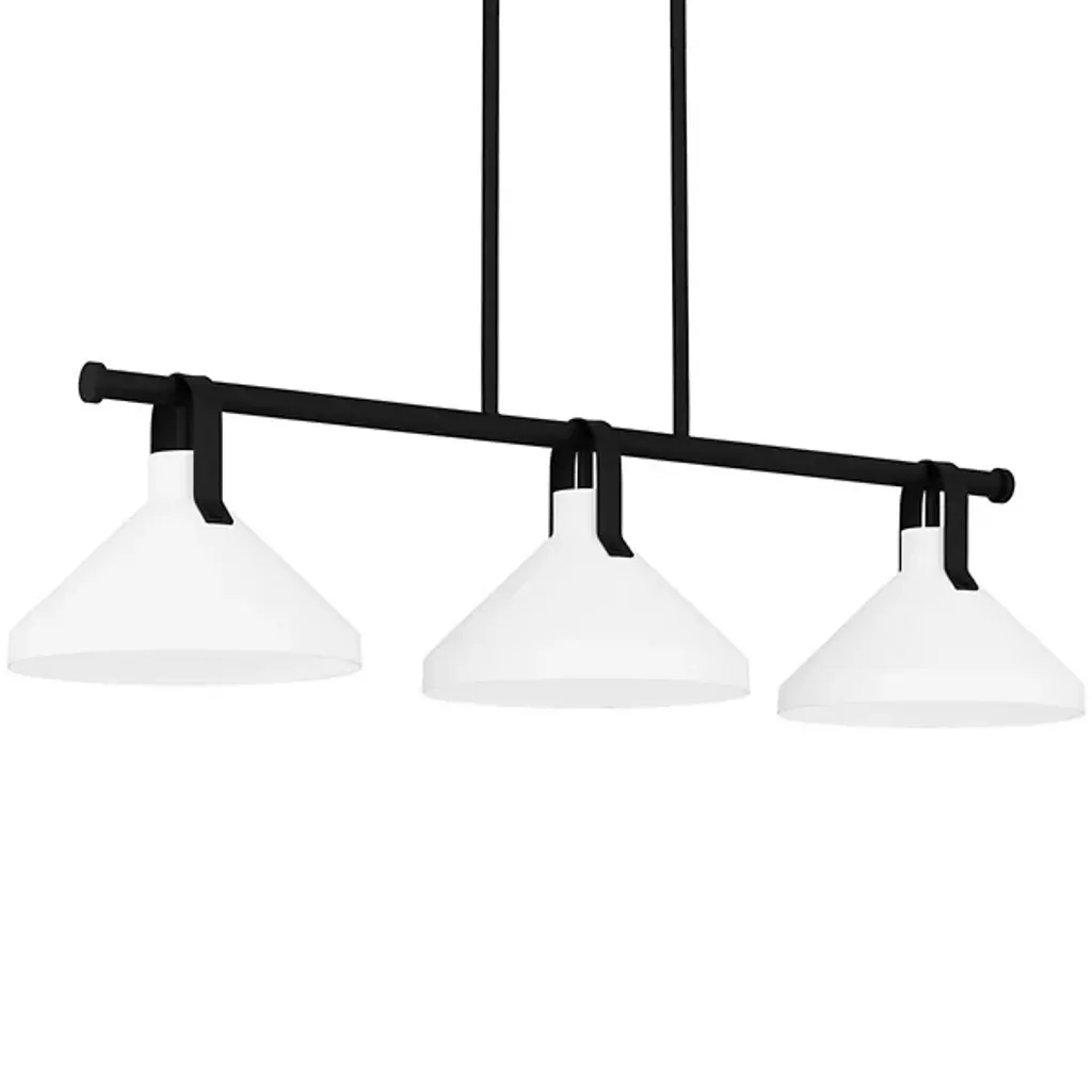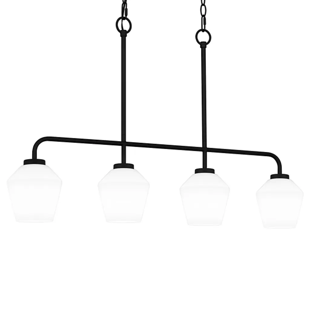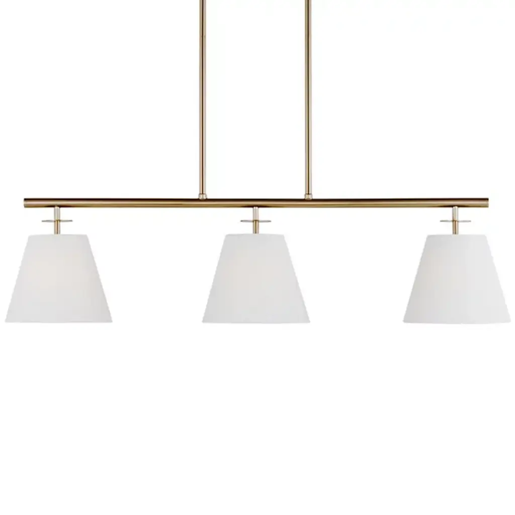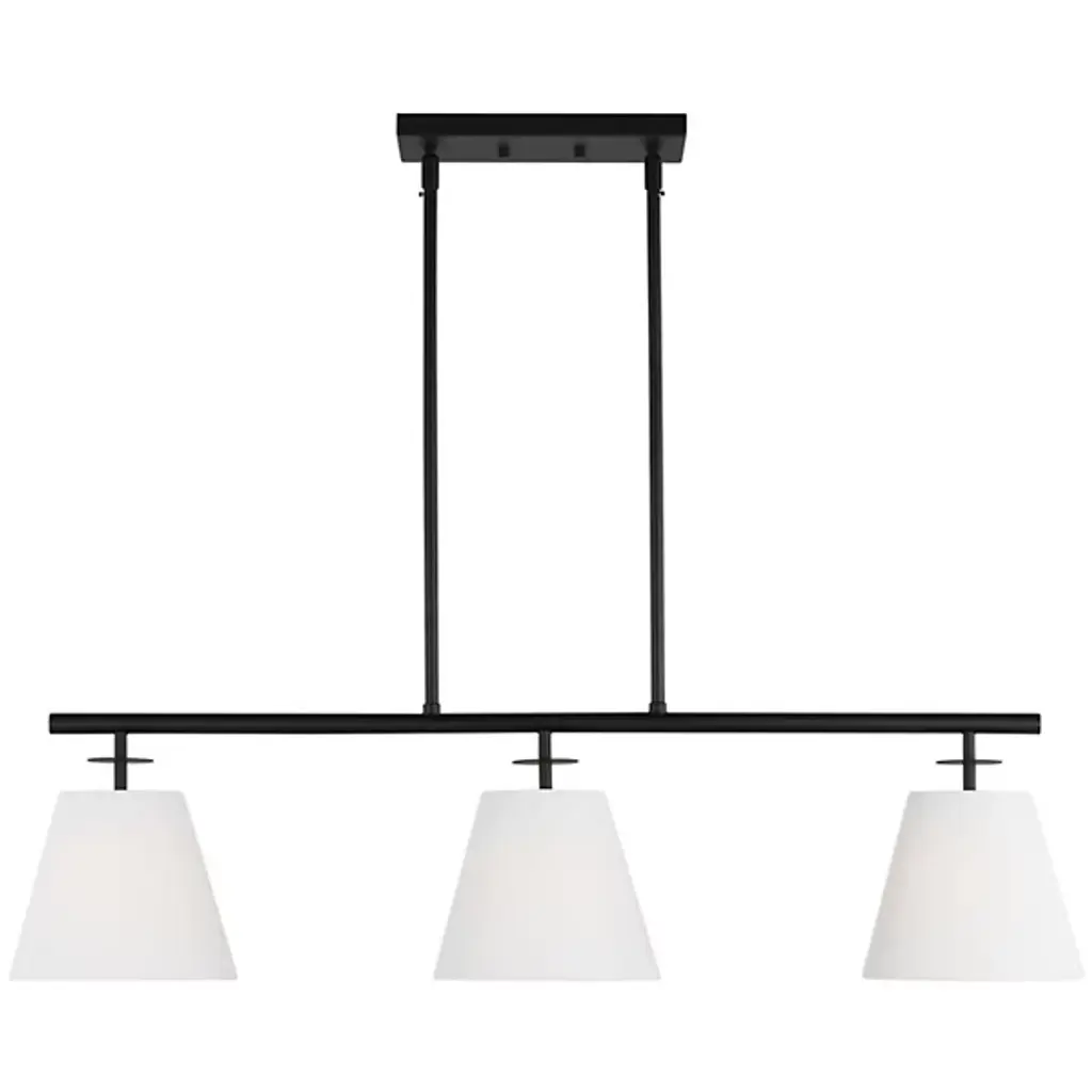 The Crestgrove Linear Suspension from Generation Lighting, formerly known as Sea Gull Lighting, presents enduring traditional shapes in an attractive modern composition. This transitional piece sports a crisp, clean silhouette that's appreciated across home styles. Its wide suspension lends it to placement over a dining table or kitchen island. The deep finish of the suspension showcases the shades below with color contrast. These handsome linen shades give a nod to the drum shades on traditional luminaires. A flip of the switch produces a long pass of ambient and downlight.
