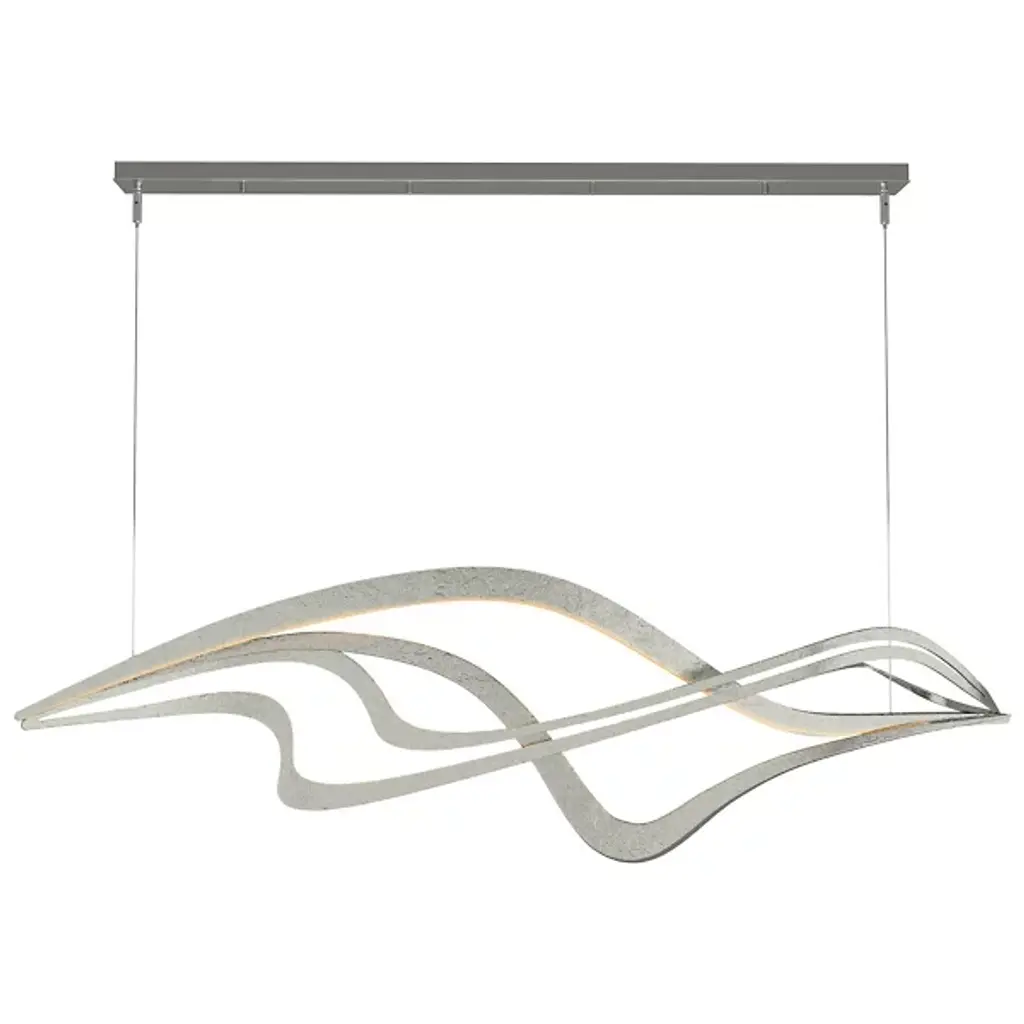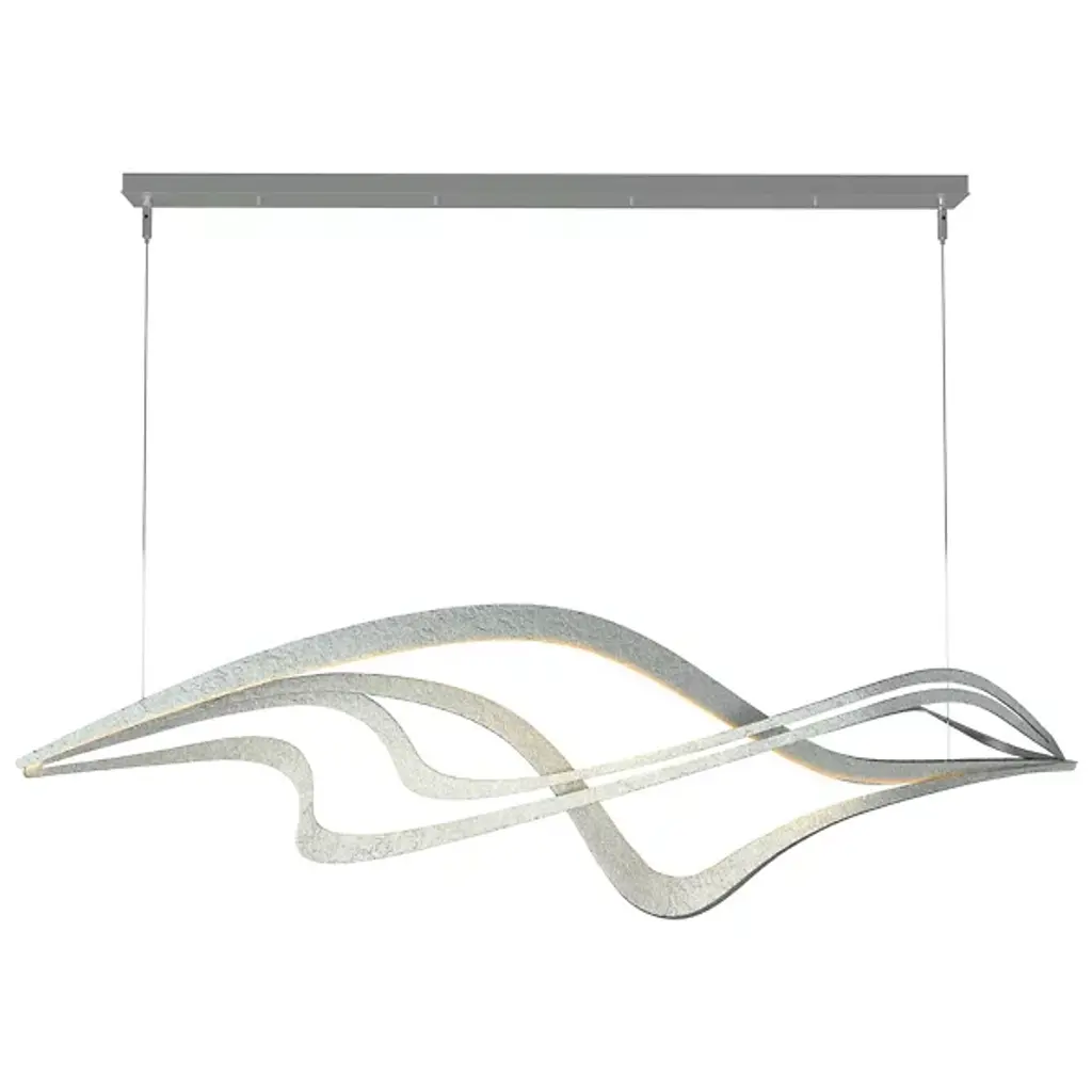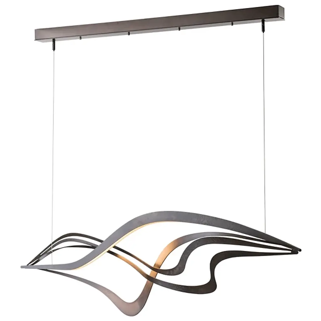 It’s a soothing composition of line. The Crossing Waves LED Linear Suspension takes the dynamic flowing essence of a wave and transforms it into a smooth sculptural metal construction. Waves of hand-forged steel ribbons move back and forth, generating pleasant curves. LEDs under the wider ribbons produce highlights onto the form as well as clean cast shadows. Overall, the piece produces a neat ambient downlight. Its waved linear design adds a sense of calmness to dining rooms over long dining tables.